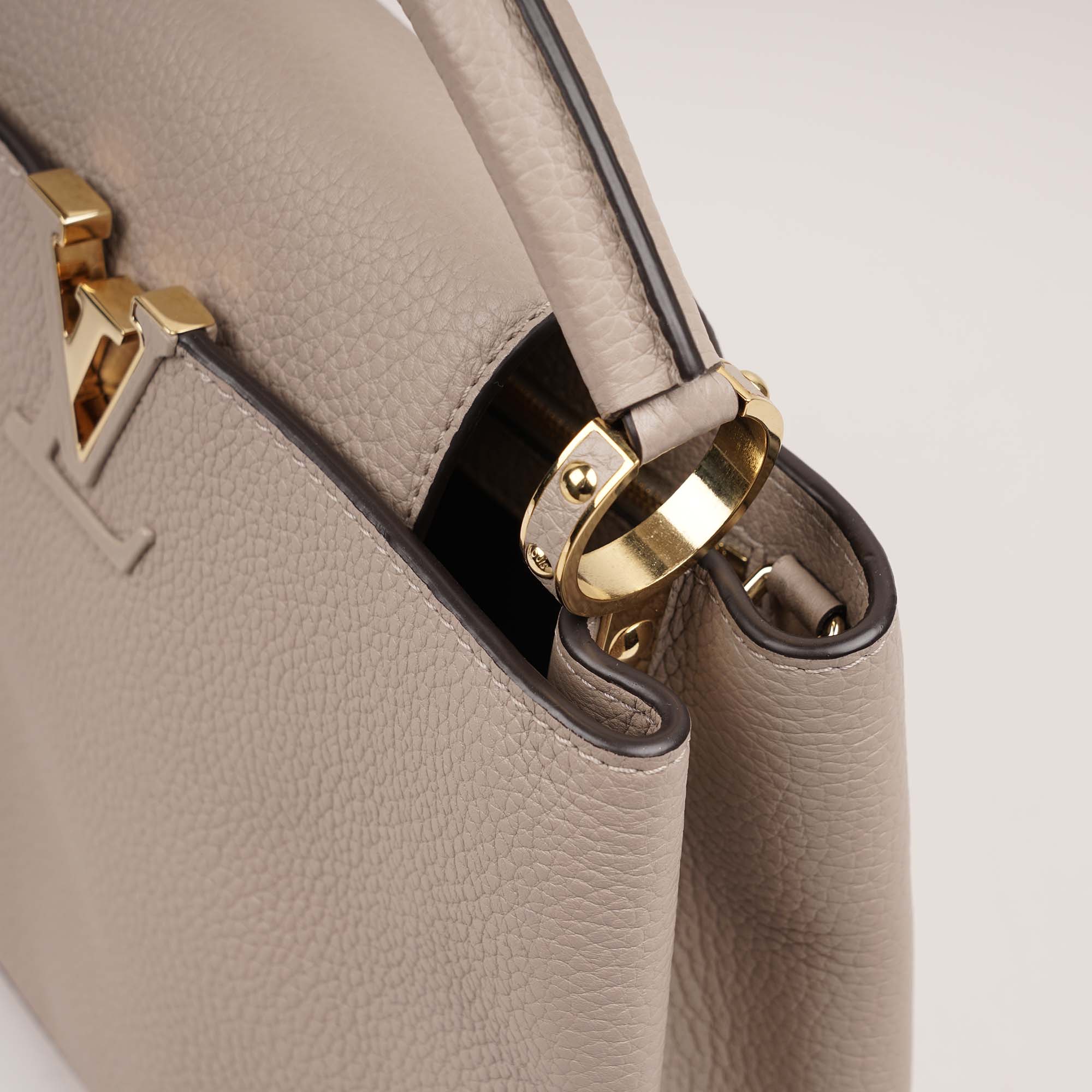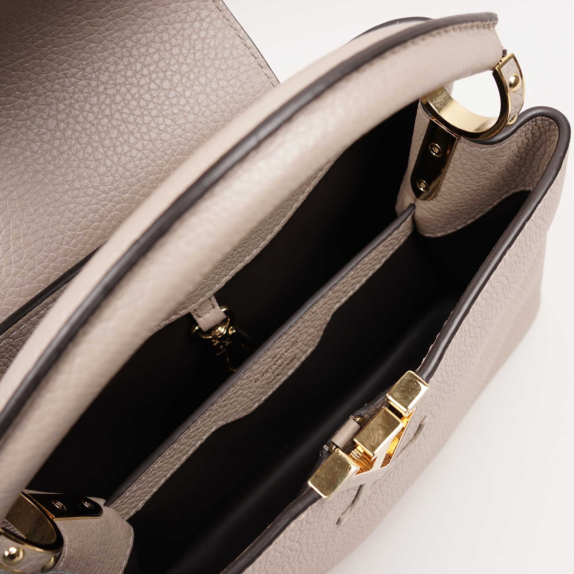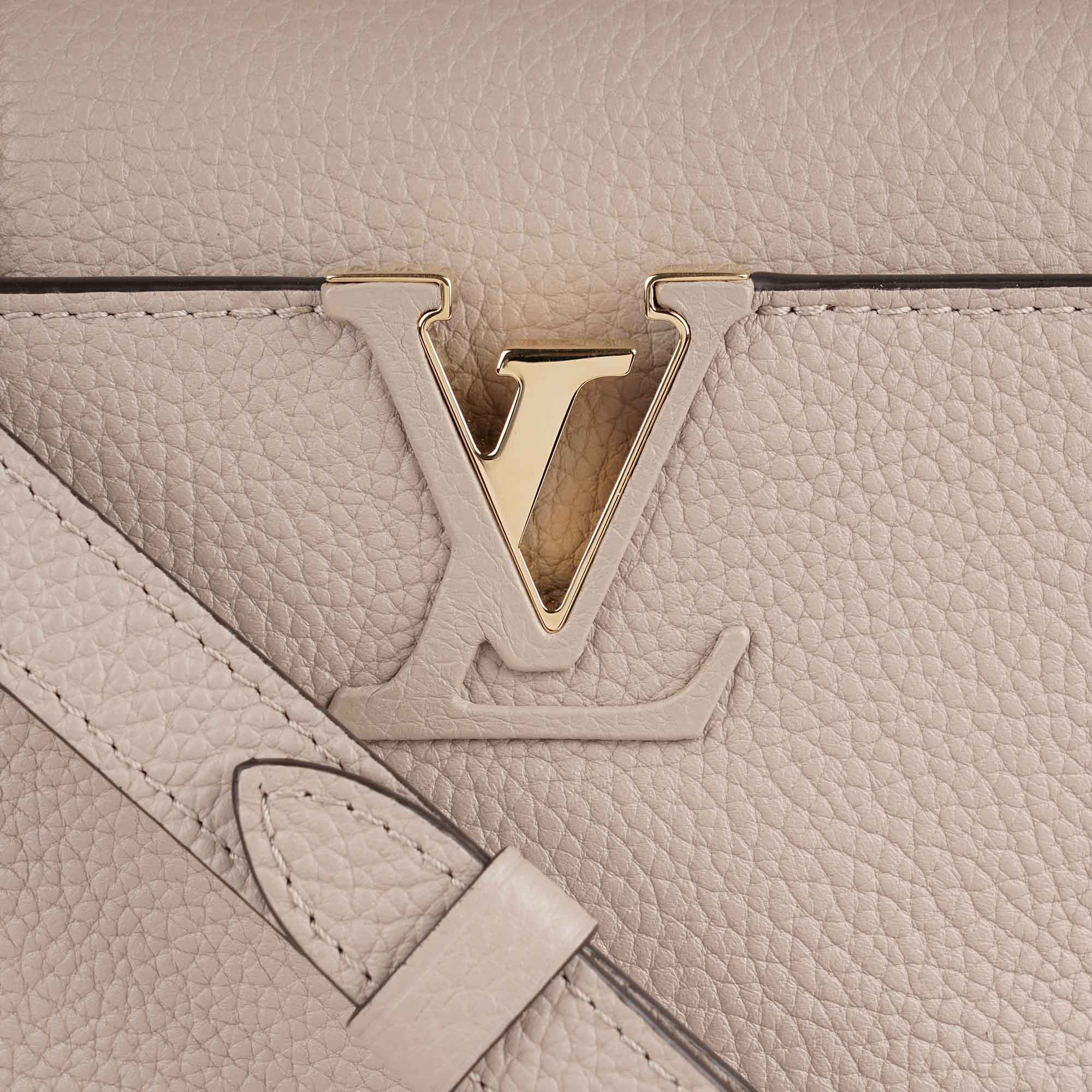 The Louis Vuitton Capucines BB Handbag is a feminine. elegant. and timeless piece that embodies the sophistication of the Maison. Crafted from supple Galet grey Taurillon leather with a luxurious leather-lined interior and refined gold-tone hardware. this bag is both understated and exquisitely detailed.