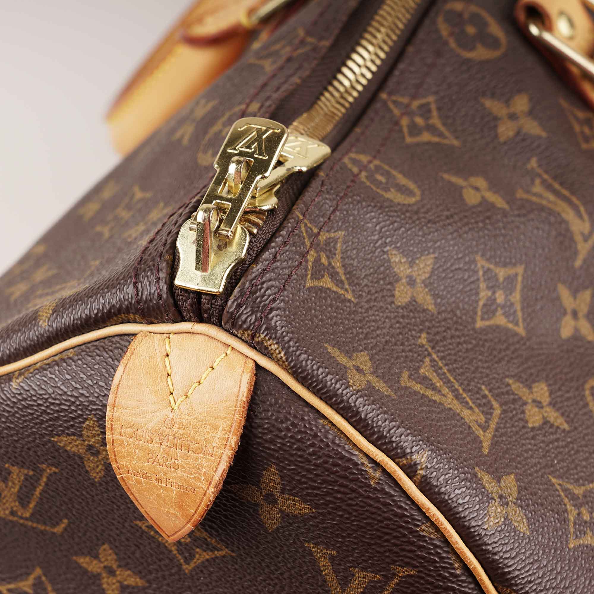 This bag is made of durable Monogram-coated canvas. natural cowhide leather details. gold-colored hardware. and a brown textile interior. This amazing bag is the best and most elegant travel partner for you because of its perfect size (cabin size) and spacious interior. Comfortable to wear by hand by the dual leather top handles. Don't miss out!