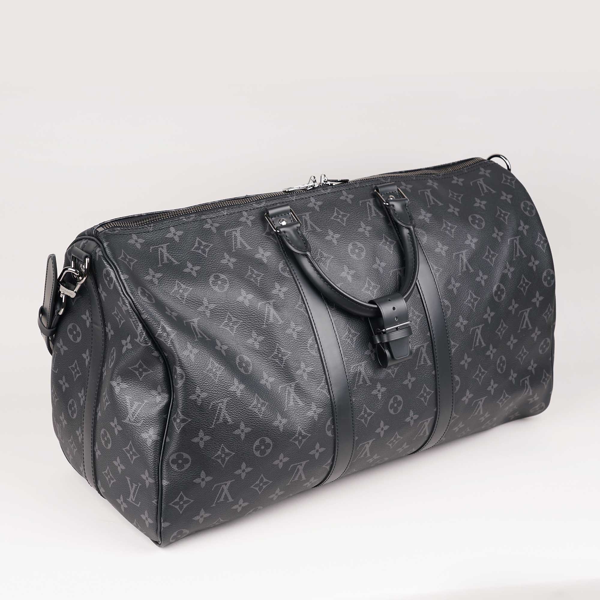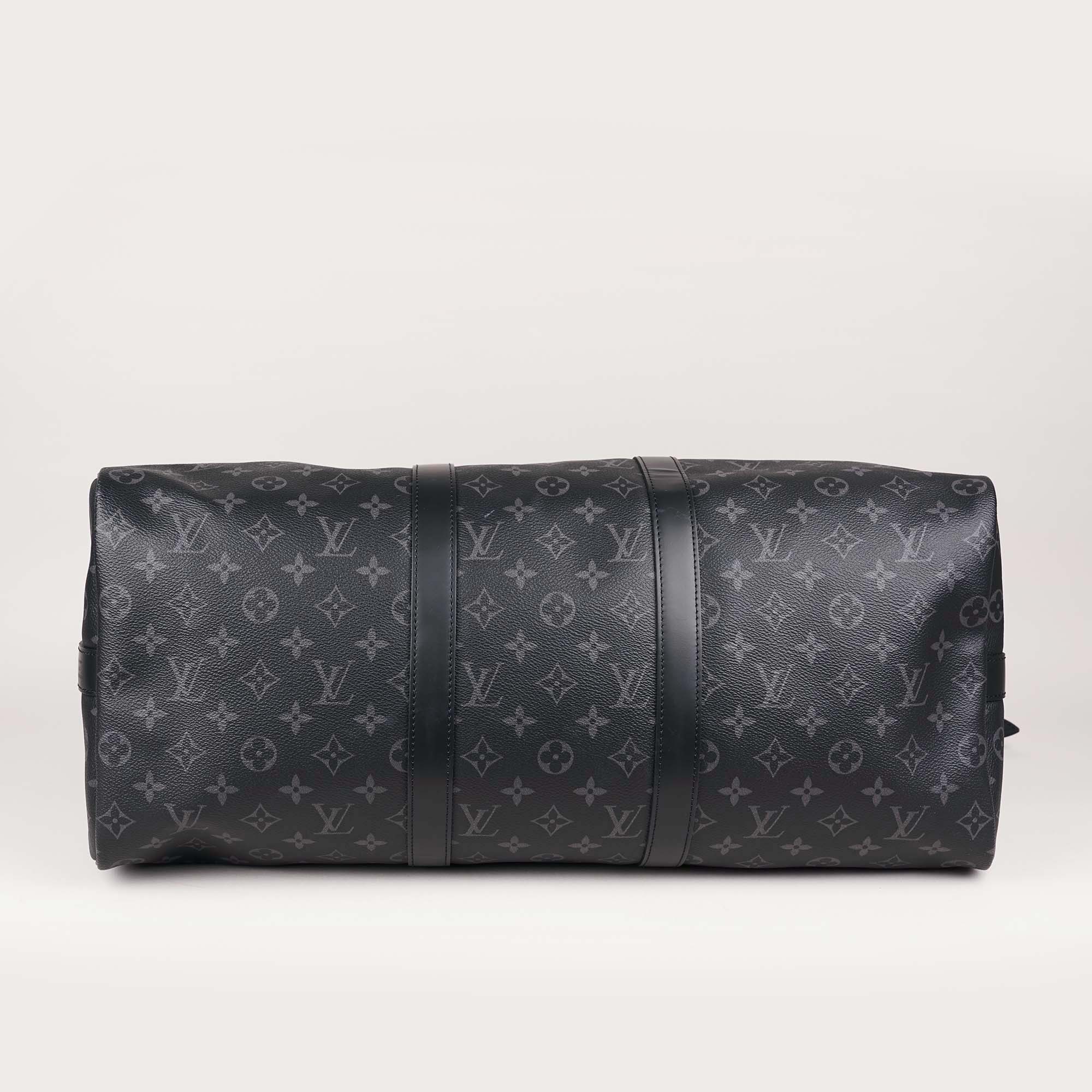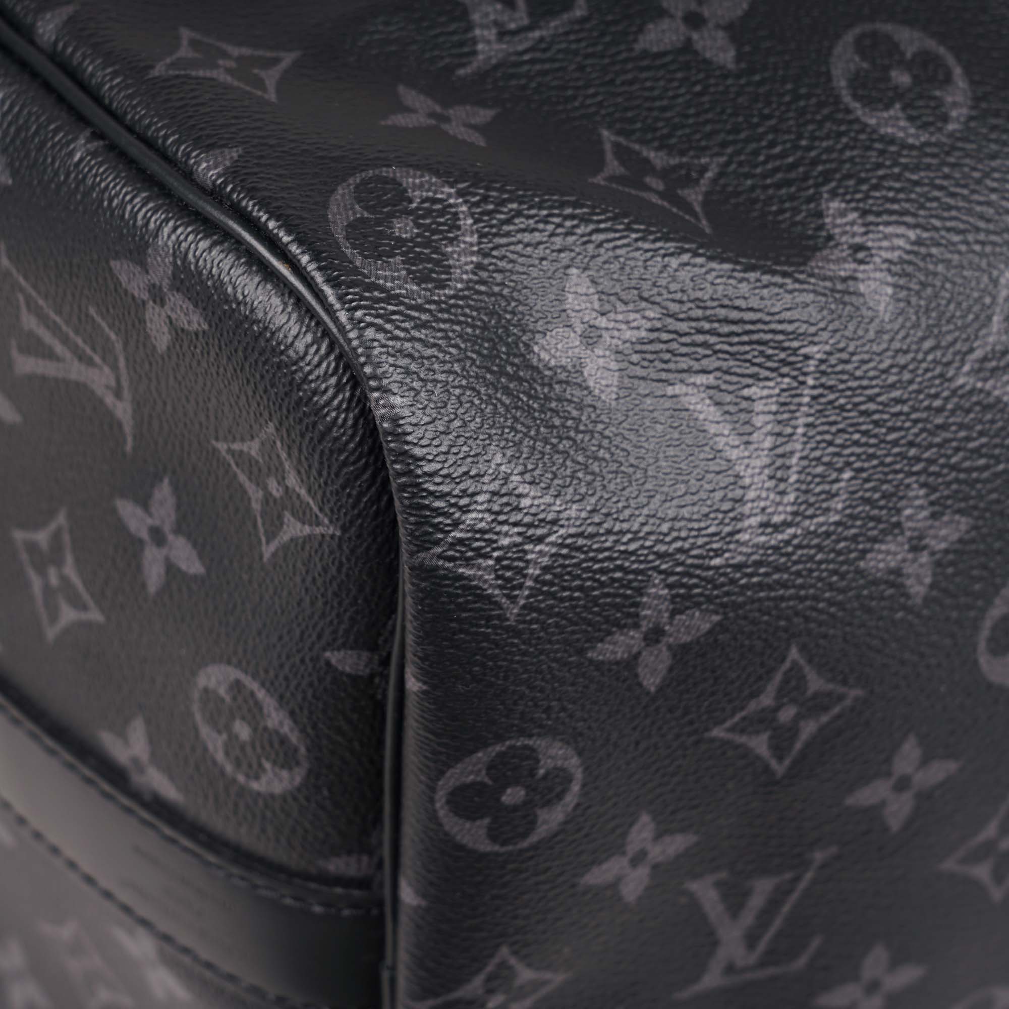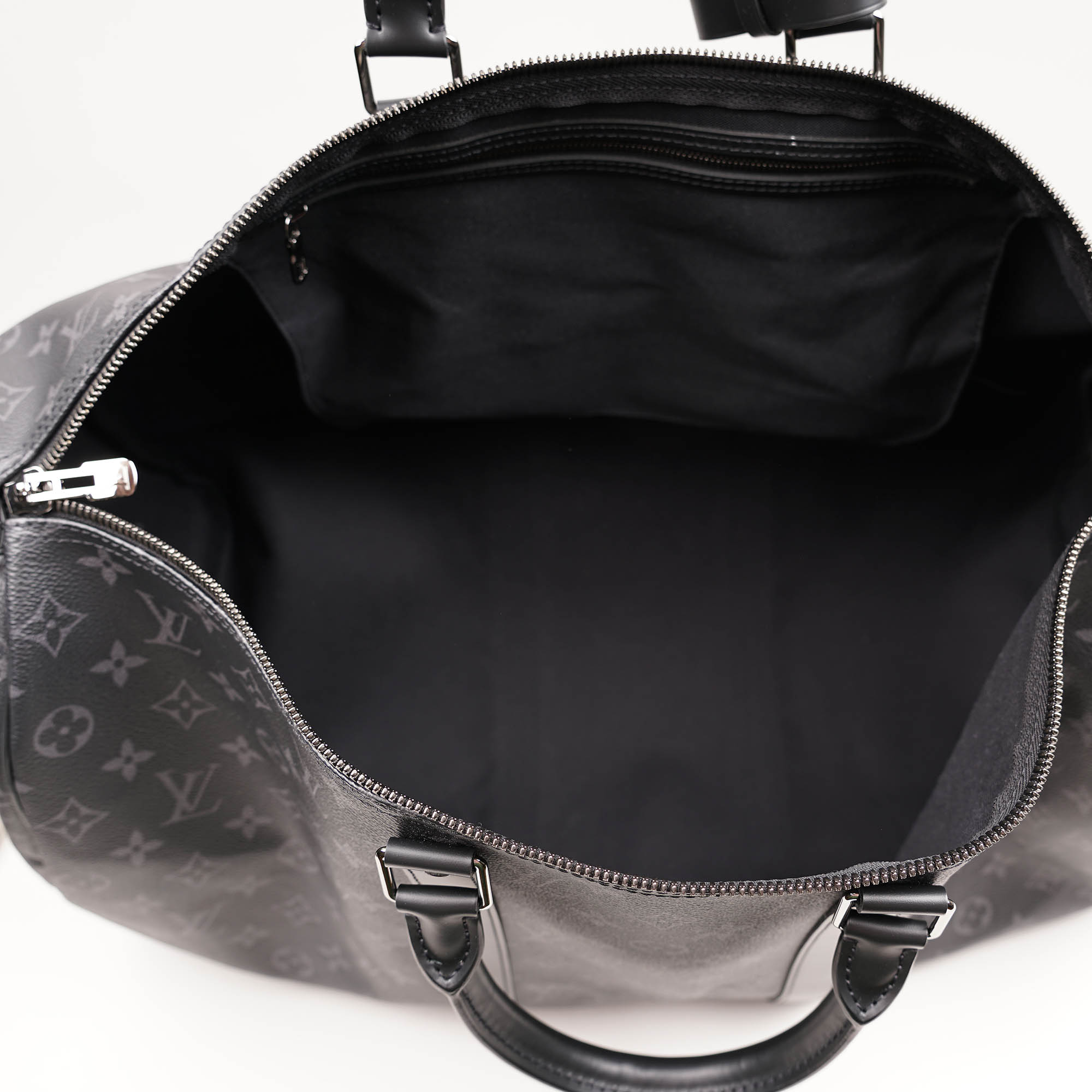 This is an authentic Louis Vuitton Keepall Bandoulière 55 Handbag in Monogram Eclipse Canvas.