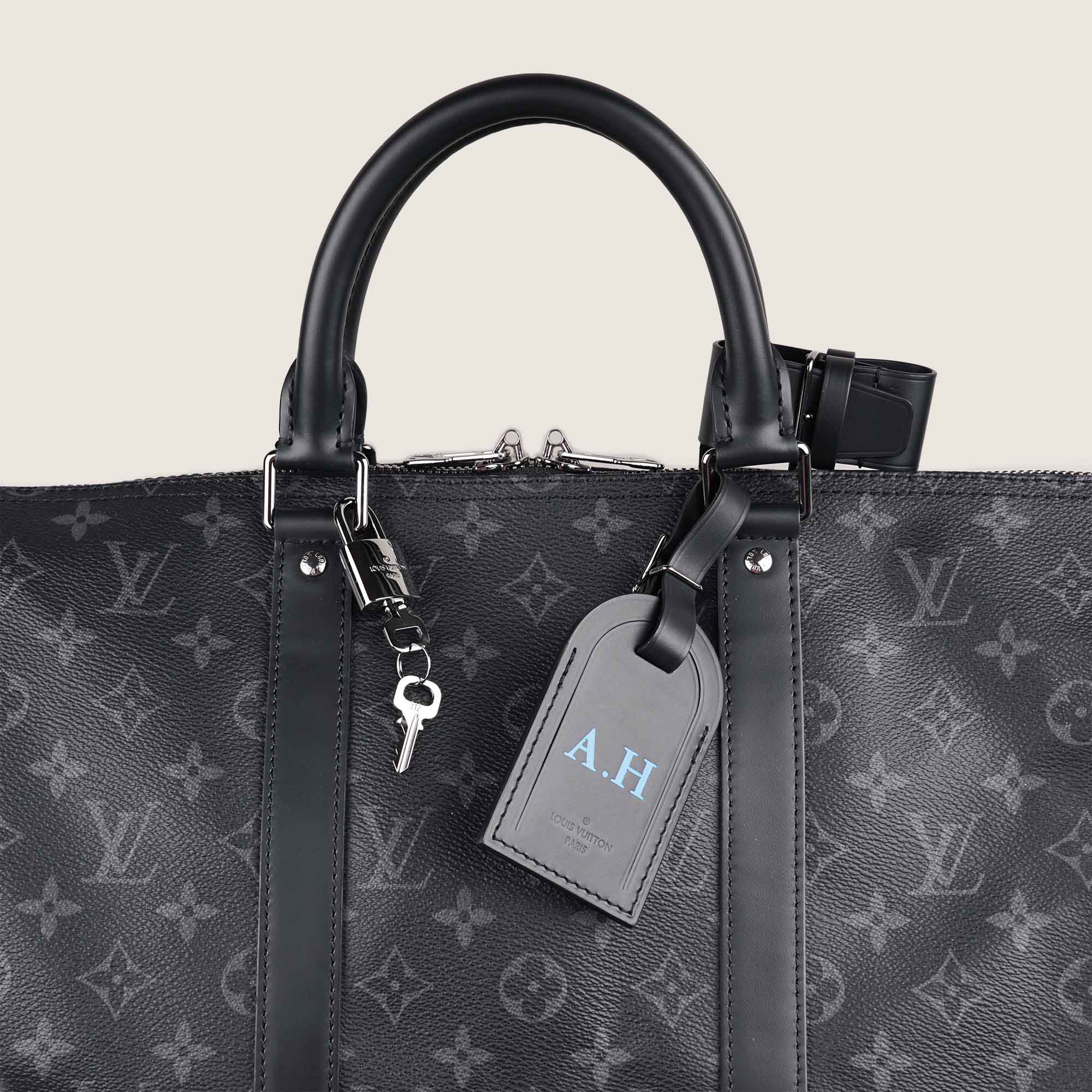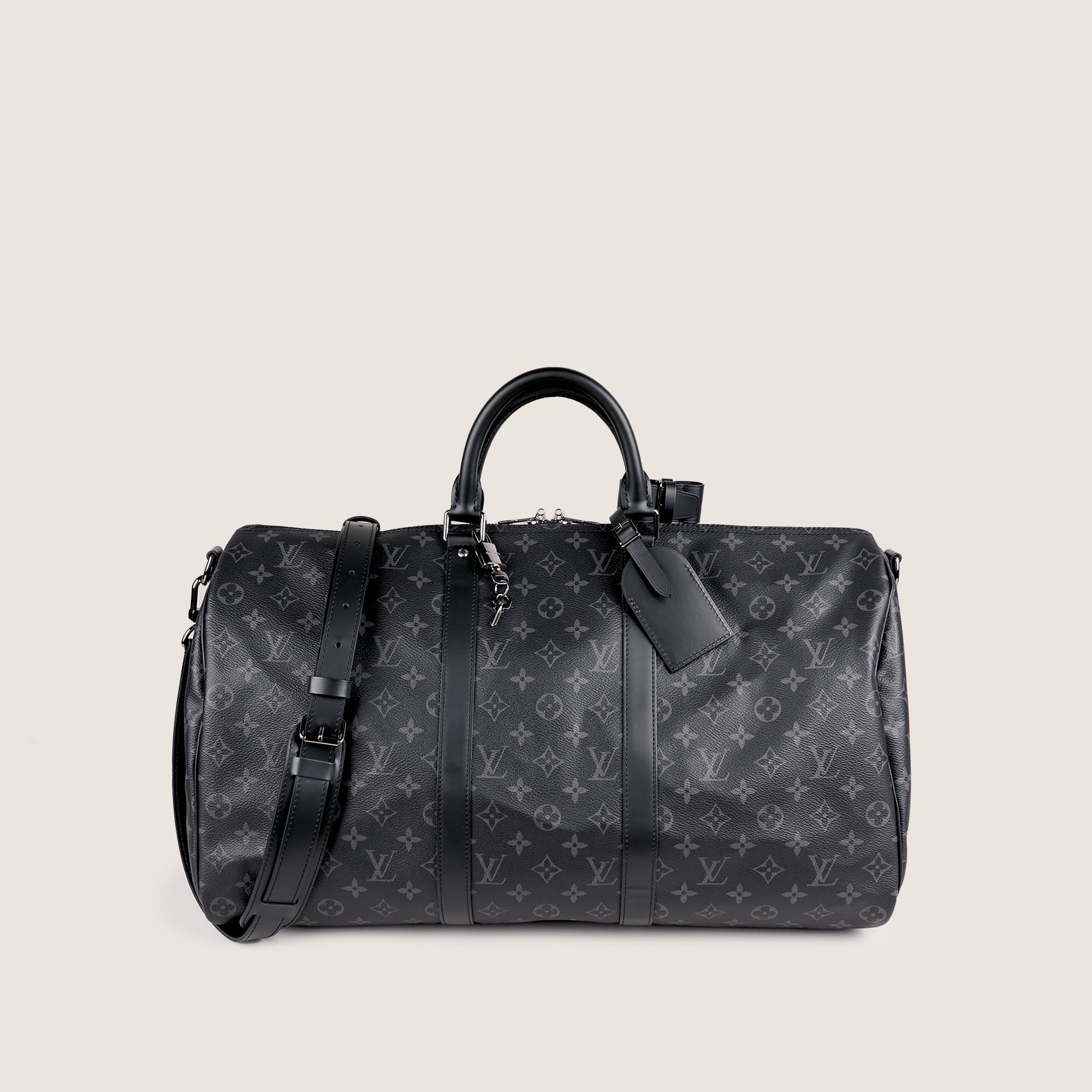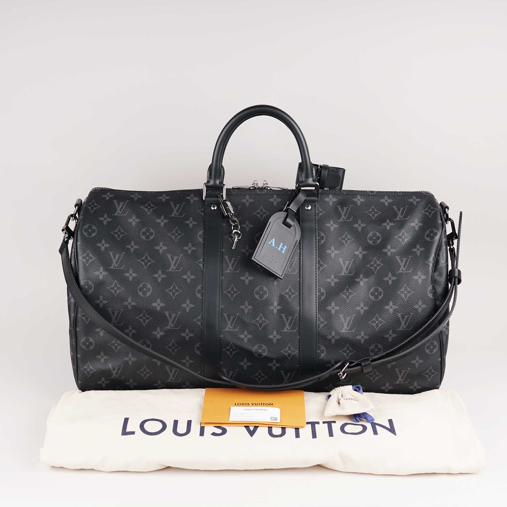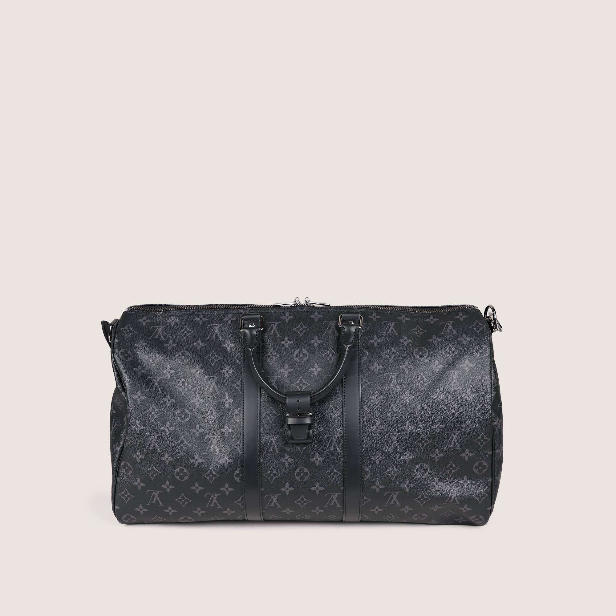 This is an authentic Louis Vuitton Keepall Bandoulière 55 Handbag in Monogram Eclipse Canvas.