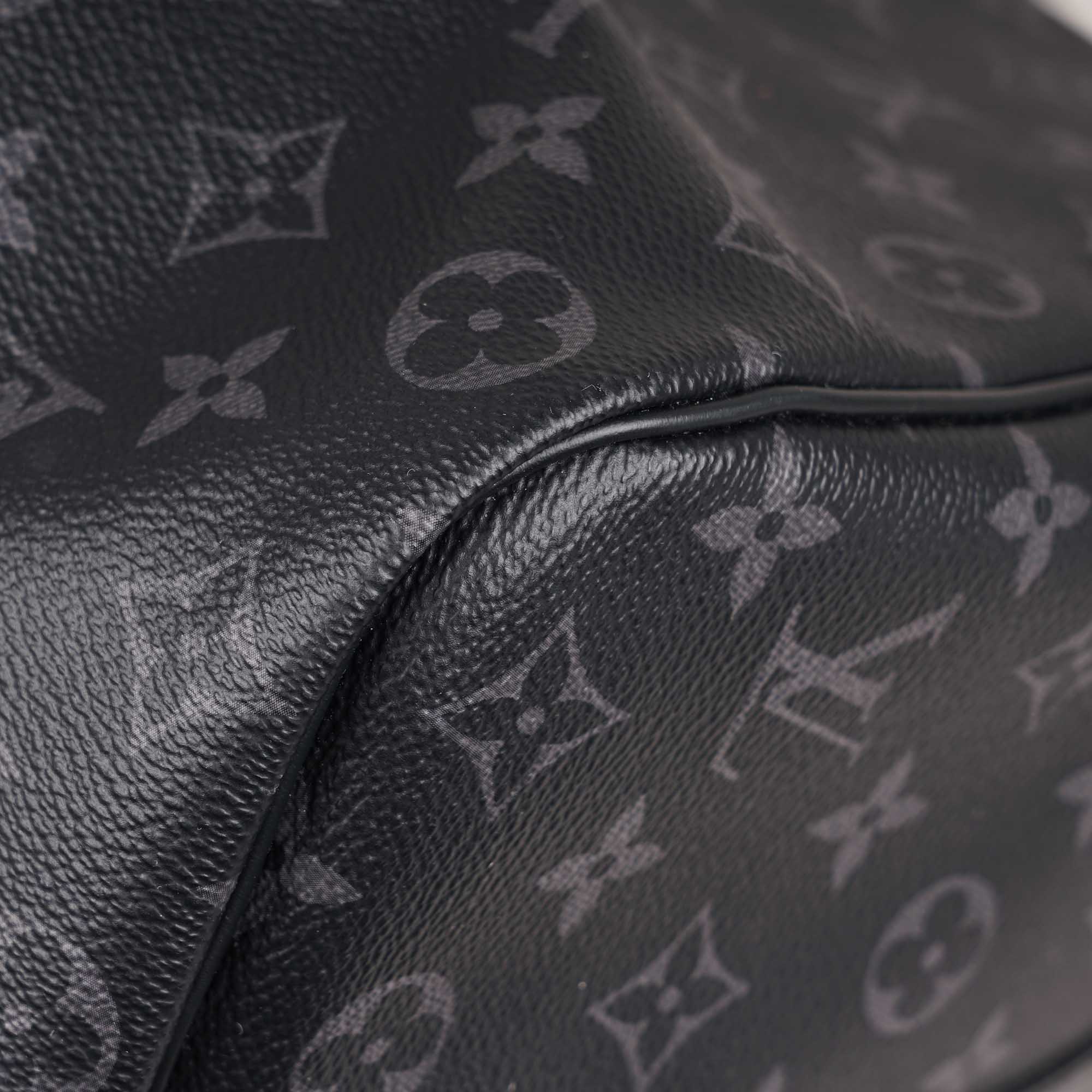 This bag is made of durable Monogram Eclipse coated canvas. black cowhide leather details. silver-colored hardware. and a black textile interior. This amazing bag is the best and most elegant travel partner because of its perfect size (cabin size). spacious interior. and multiple wearing options. It's comfortable to wear on your shoulder or crossbody due to the removable and adjustable shoulder strap. If you prefer to carry it by hand. simply switch to the dual leather top handles. Don't miss out!