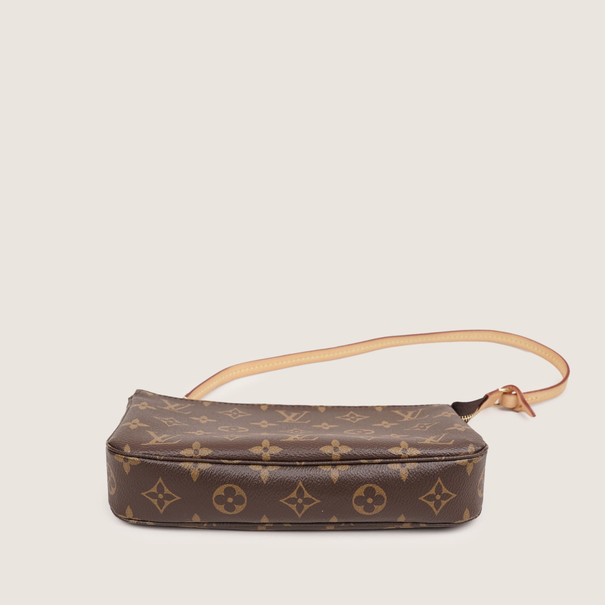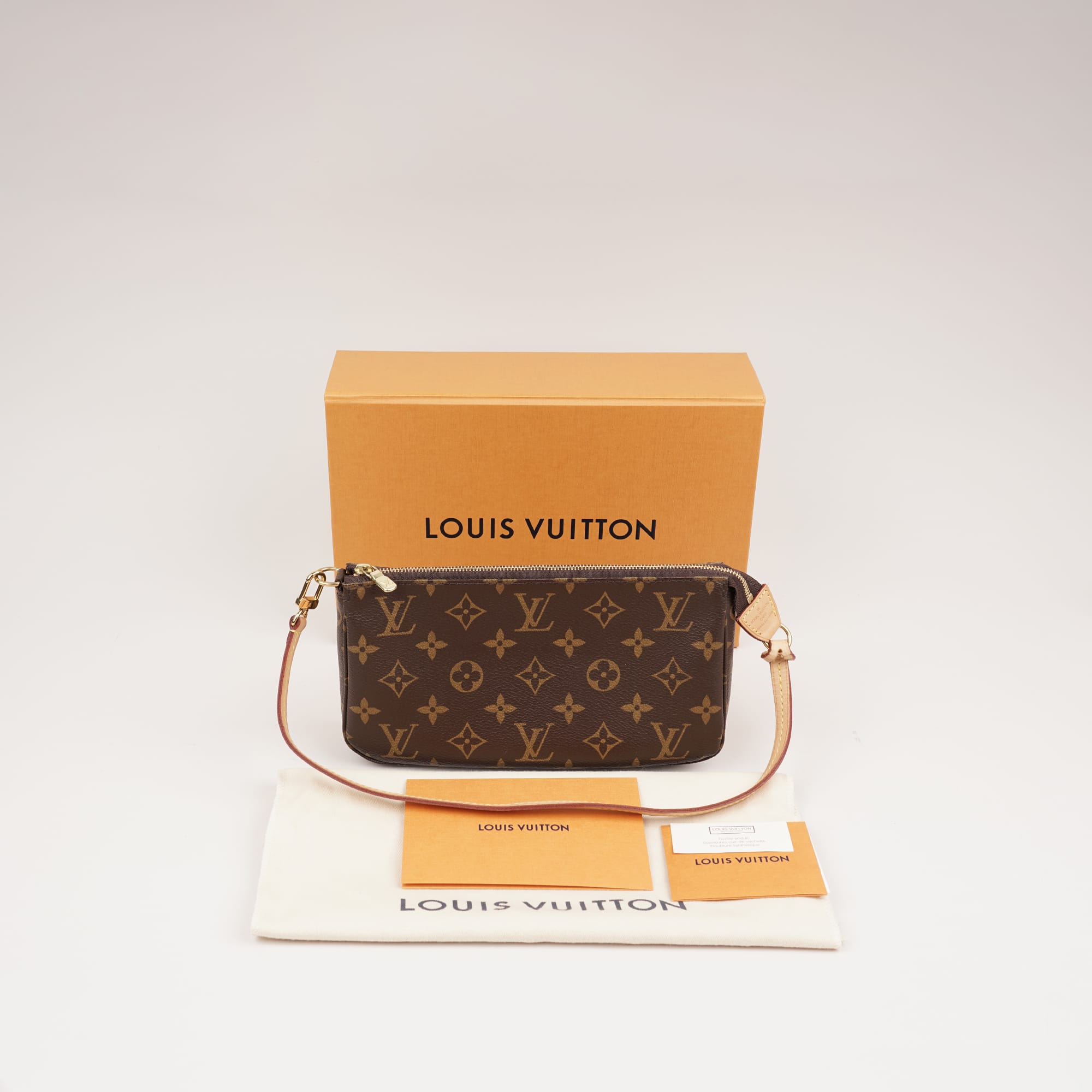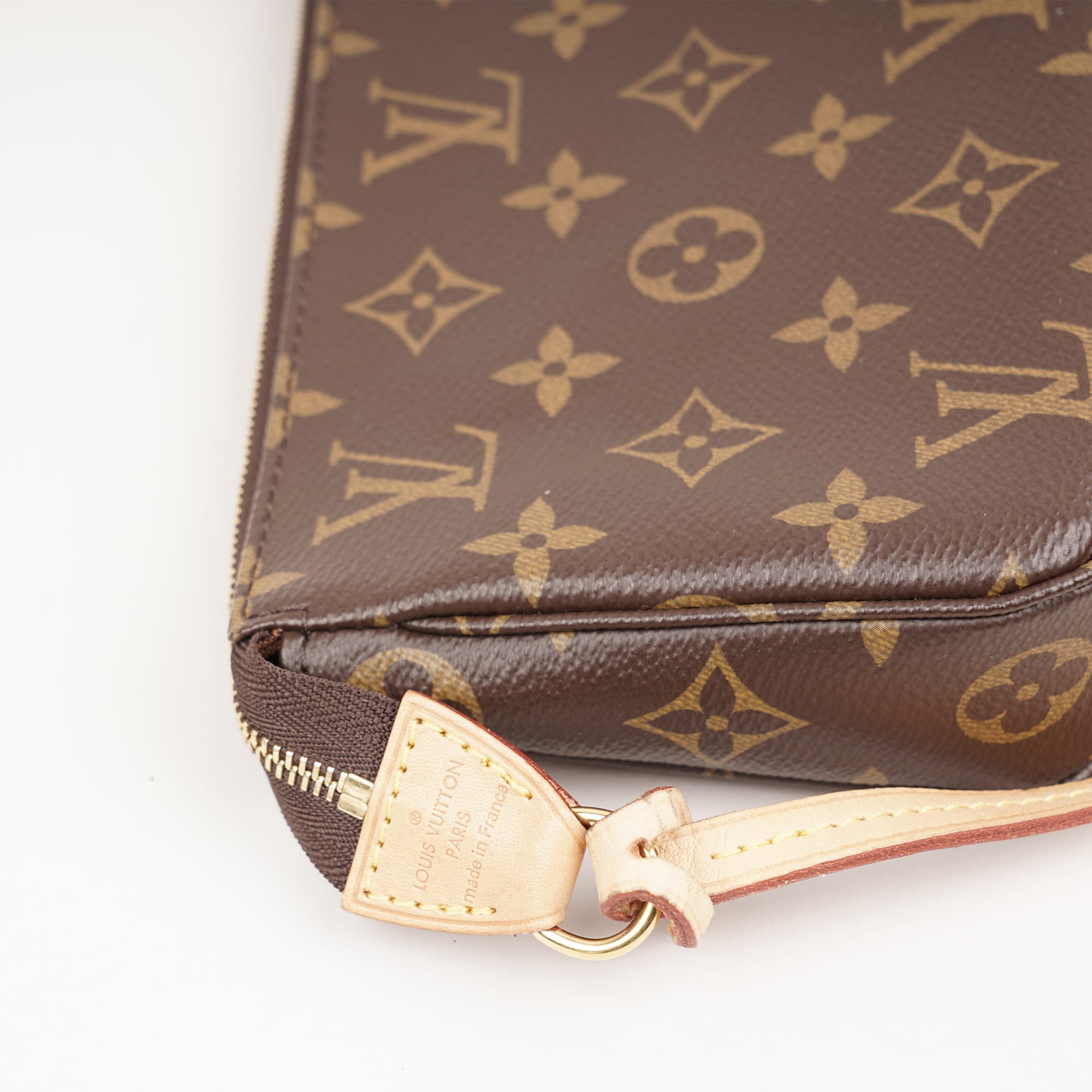 This versatile pochette is perfect to wear to any occasion. It can be worn on your shoulder. by hand or be used as a cosmetic bag. It fits all of your daily needs such as your Smartphone. wallet. keys and make-up. Made from durable Monogram canvas. a textile interior. vachetta leather details and gold-colored hardware. Don't miss out!