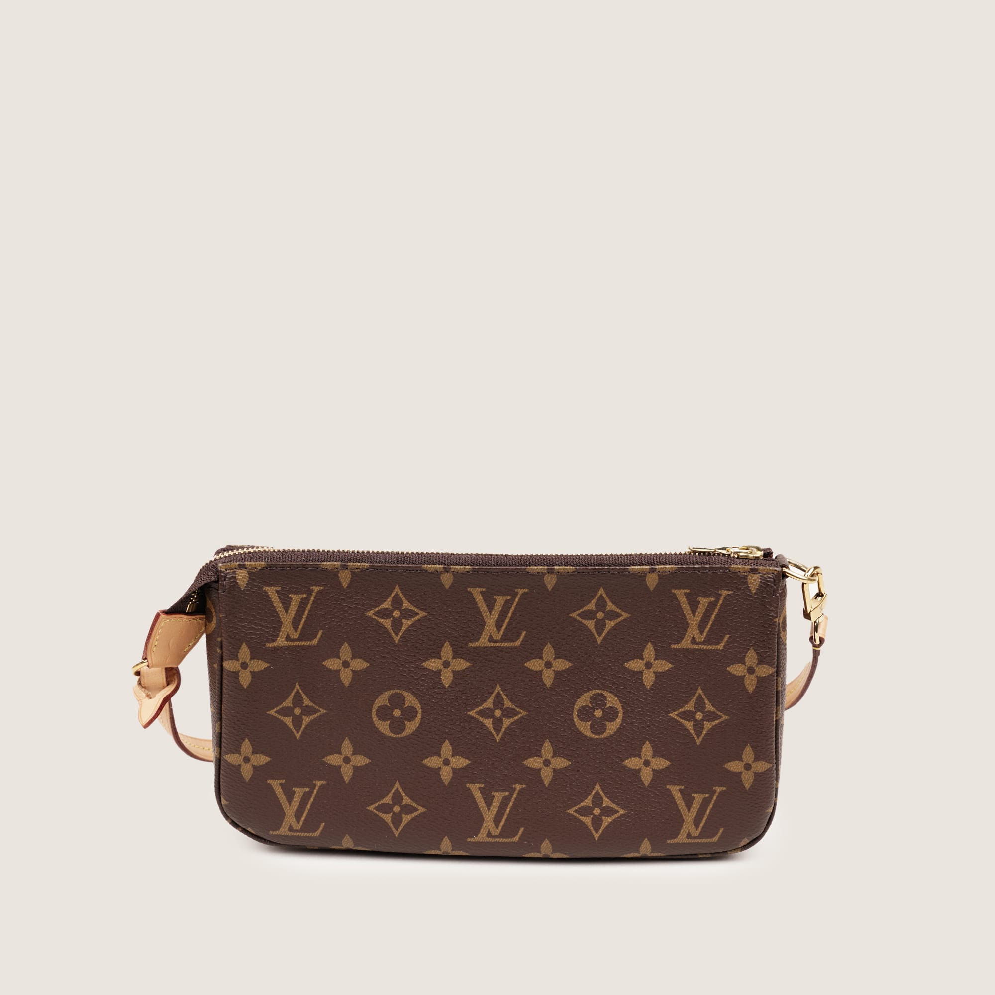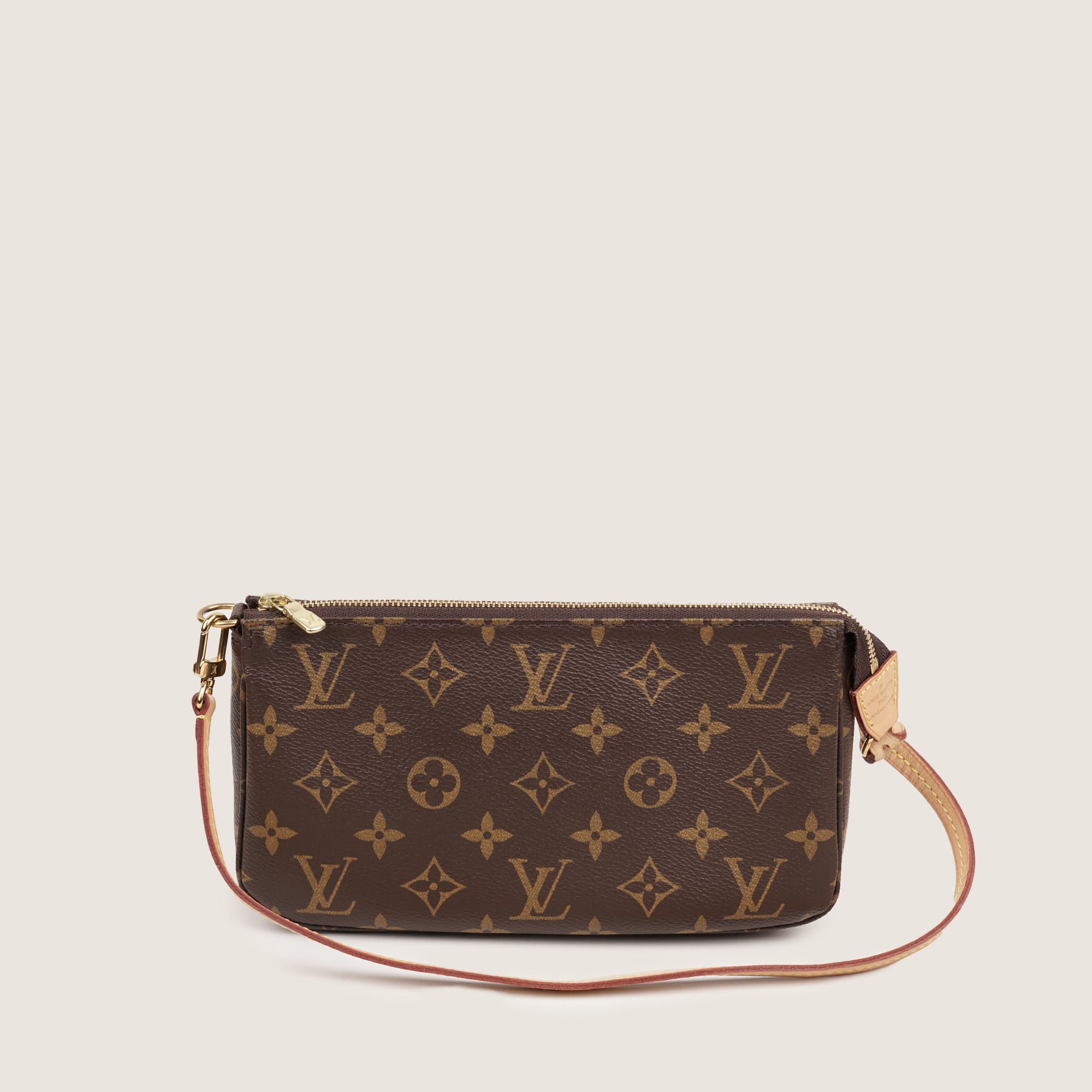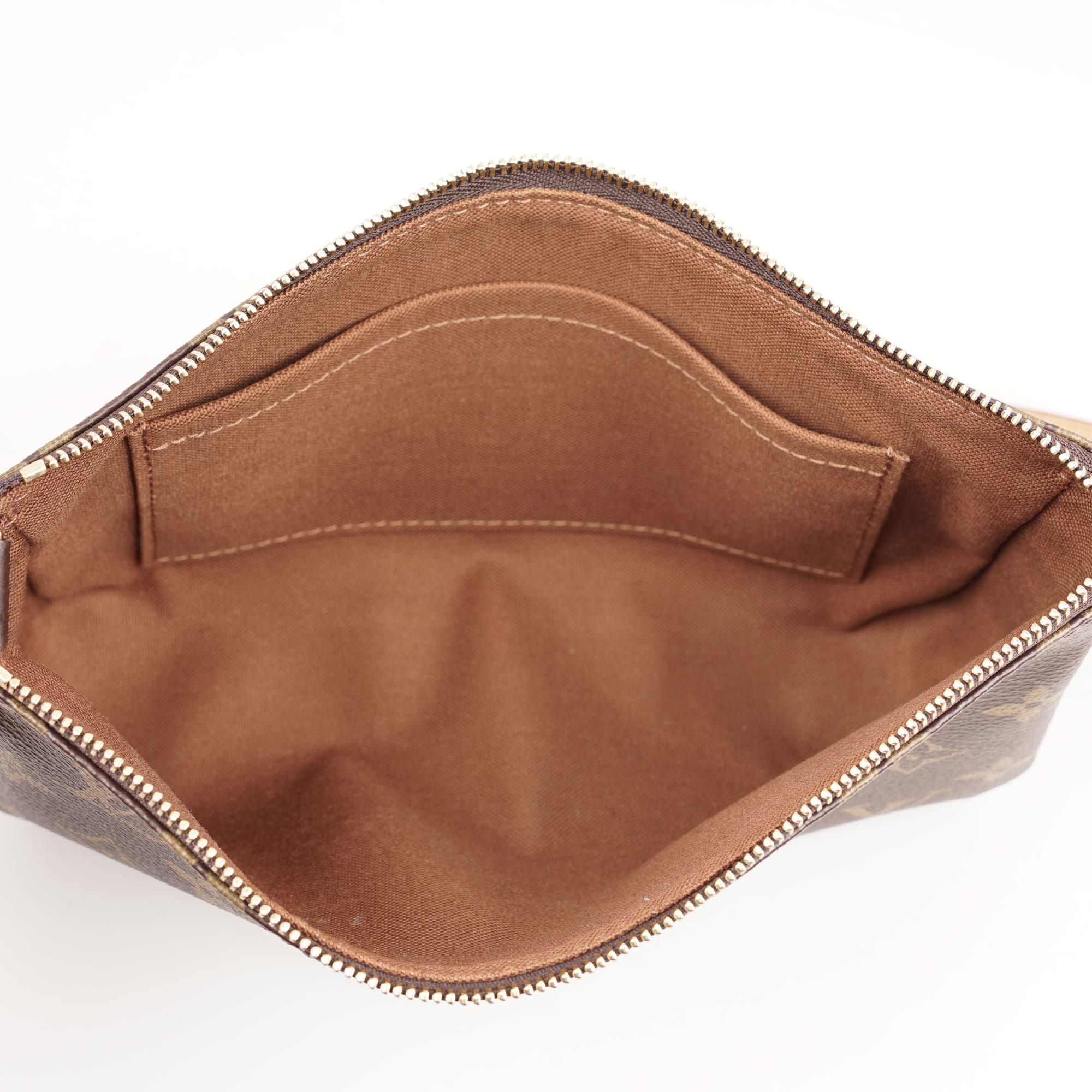 This versatile pochette is perfect to wear to any occasion. It can be worn on your shoulder. by hand or be used as a cosmetic bag. It fits all of your daily needs such as your Smartphone. wallet. keys and make-up. Made from durable Monogram canvas. a textile interior. vachetta leather details and gold-colored hardware. Don't miss out!
