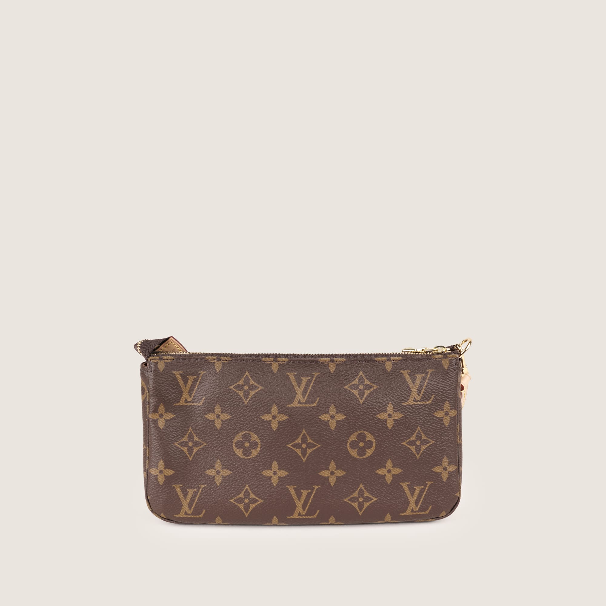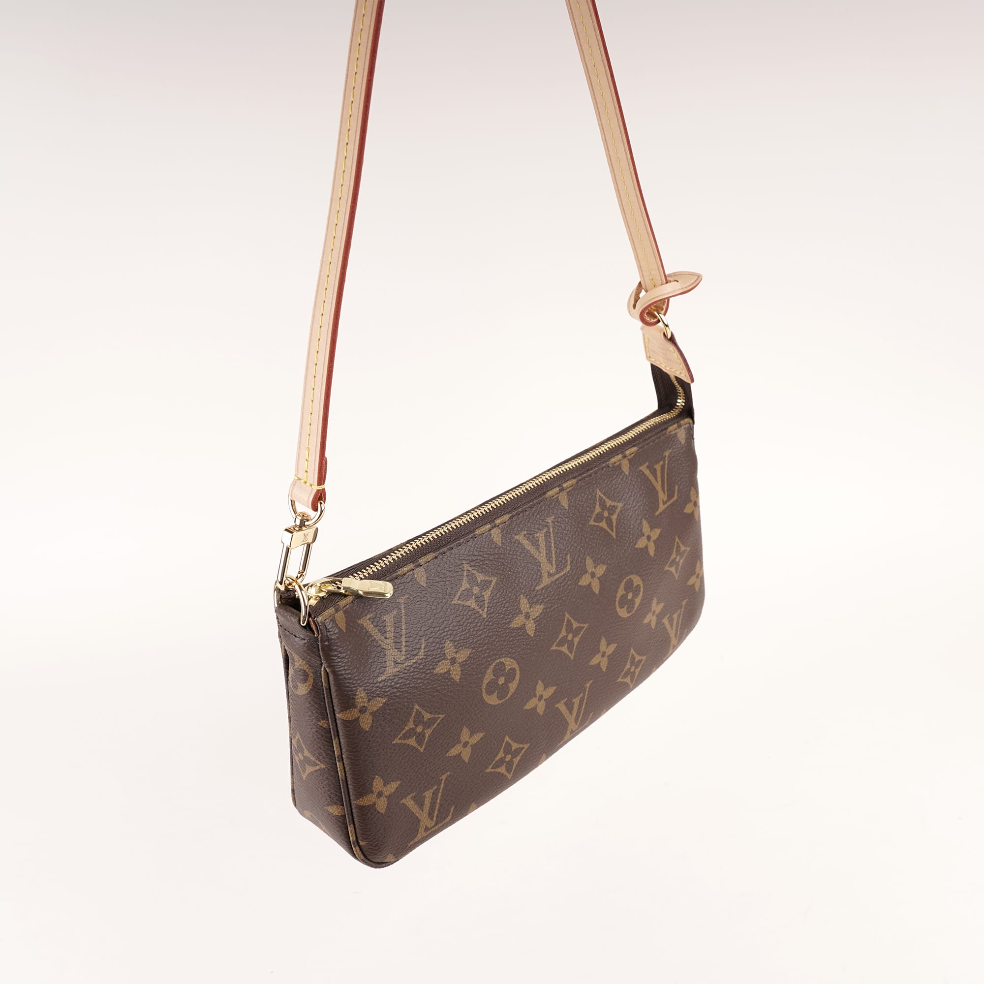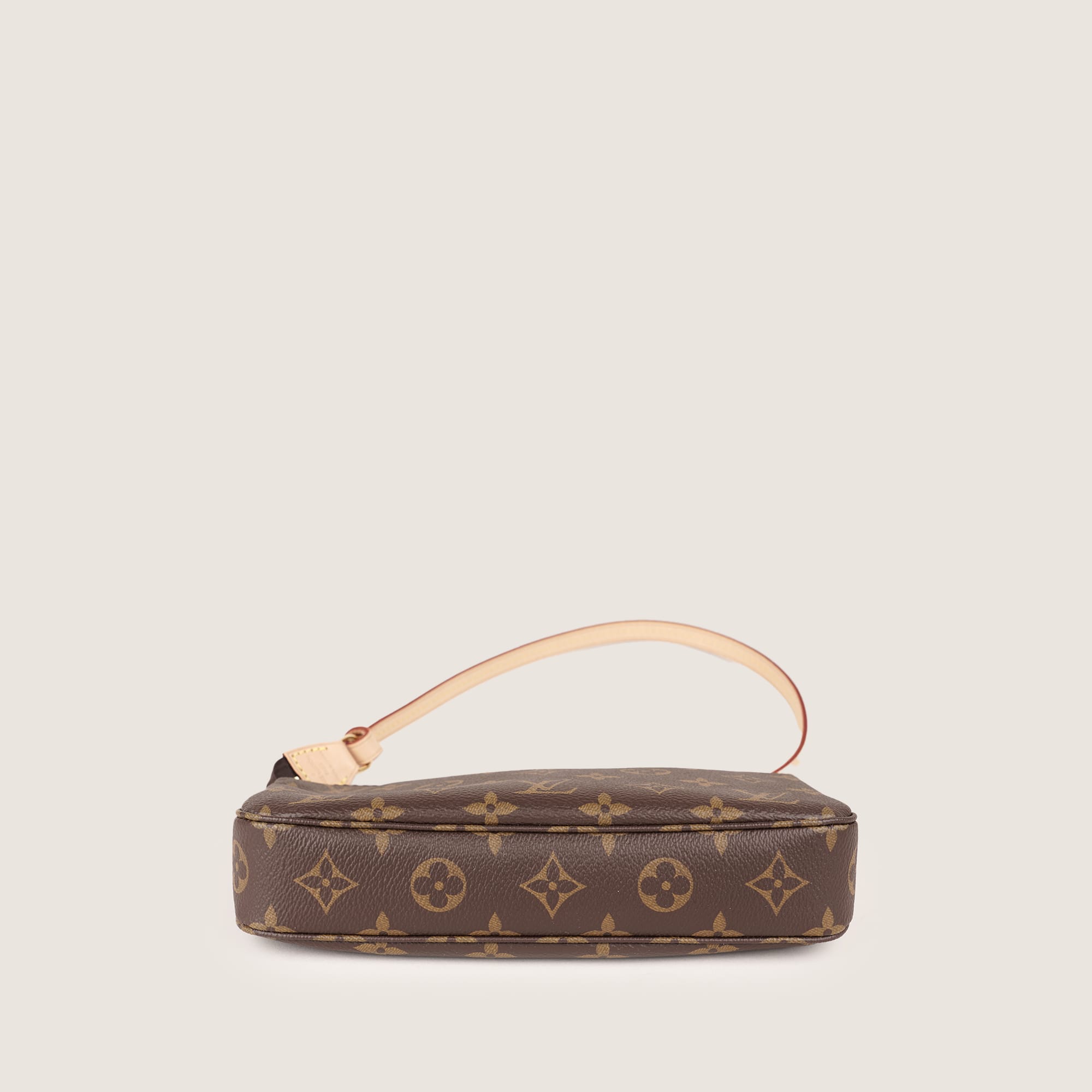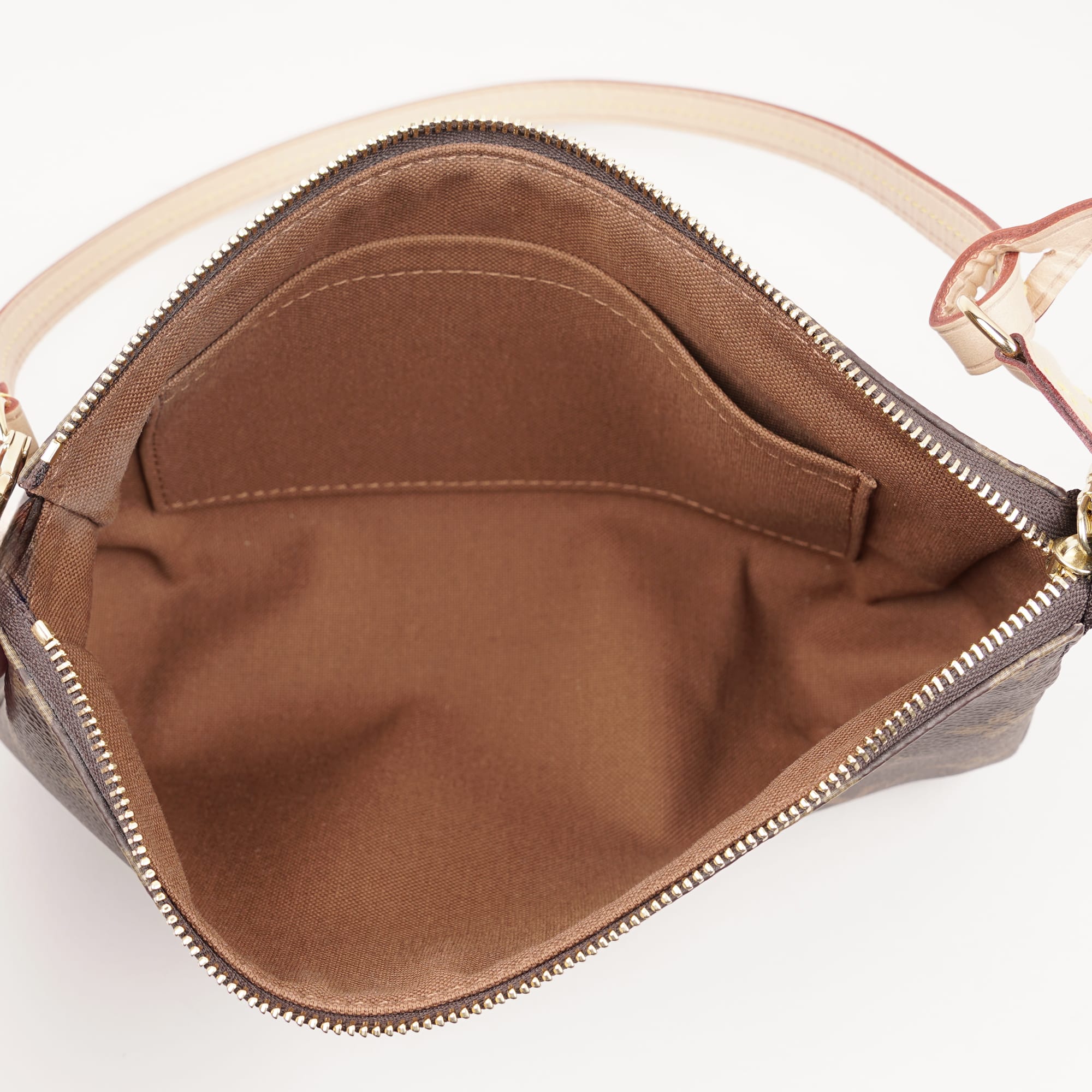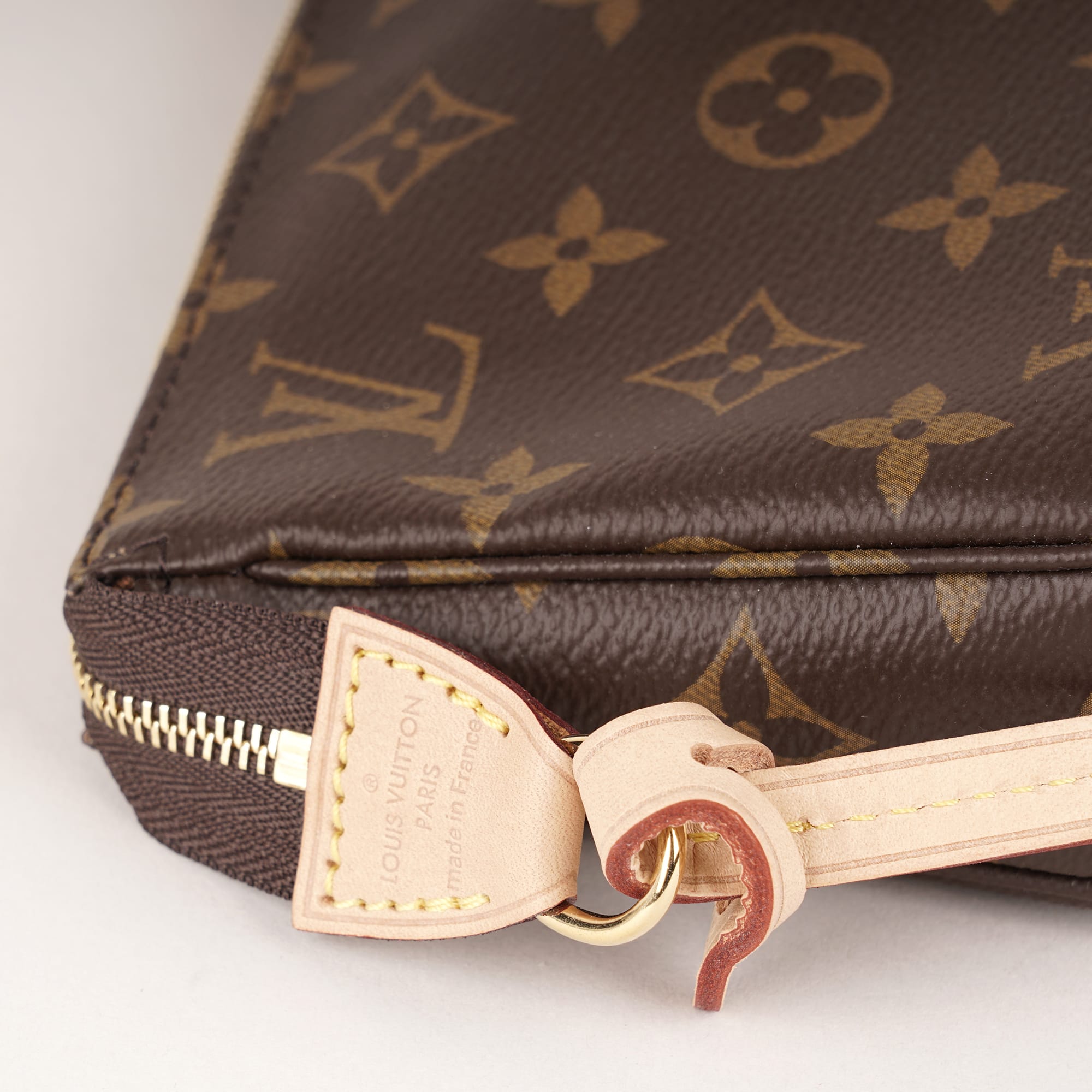 This versatile pochette is perfect to wear to any occasion. It can be worn on your shoulder. by hand. or used as a toiletry bag. It fits all of your daily needs. such as your Smartphone. wallet. keys. and make-up. Made from durable Monogram canvas. a textile interior. vachetta leather details and gold-colored hardware. Don't miss out!