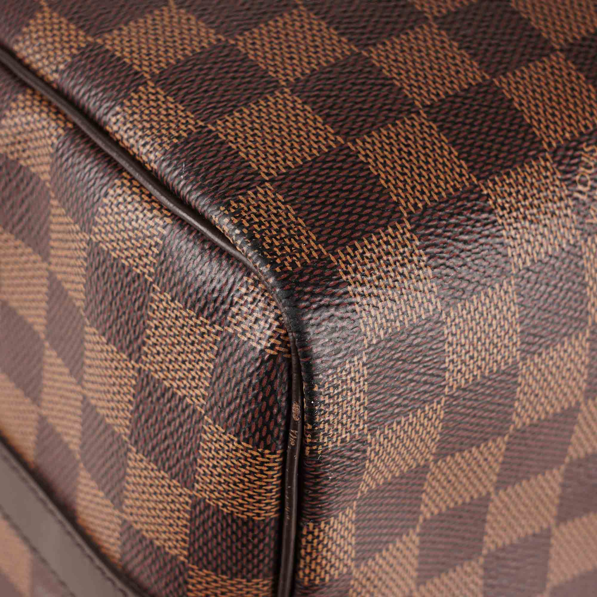 This bag is made of durable Damier Ebene coated canvas. brown cowhide leather details. gold-colored hardware and a red textile interior. It's perfect for everyday use. gym or when traveling because of its perfect size. roomy interior and multiple wearing options. It's comfortable to wear on your shoulder or crossbody due to the removable and adjustable shoulder strap. Simply carry the bag by hand for a more chic look. Don't miss out!