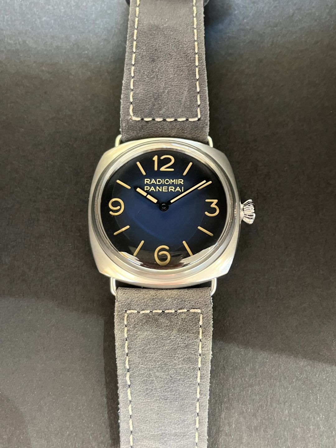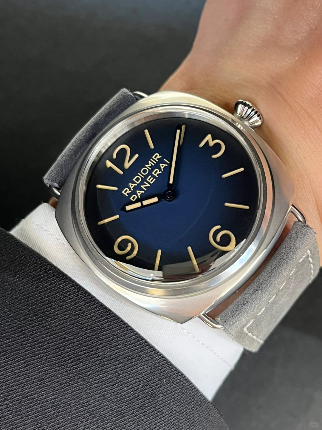An ode to luxurious yet functional timekeeping. this Radiomir Tre Giorni model is presented in a robust 45mm polished Patina steel case with a complementary Scamosciato Blu profondo strap.