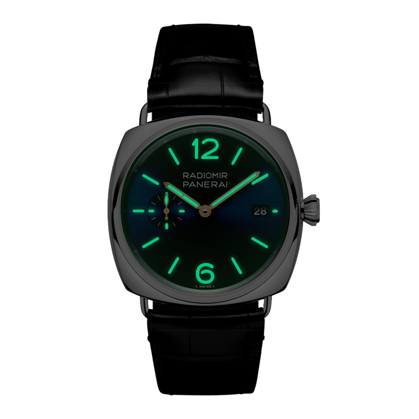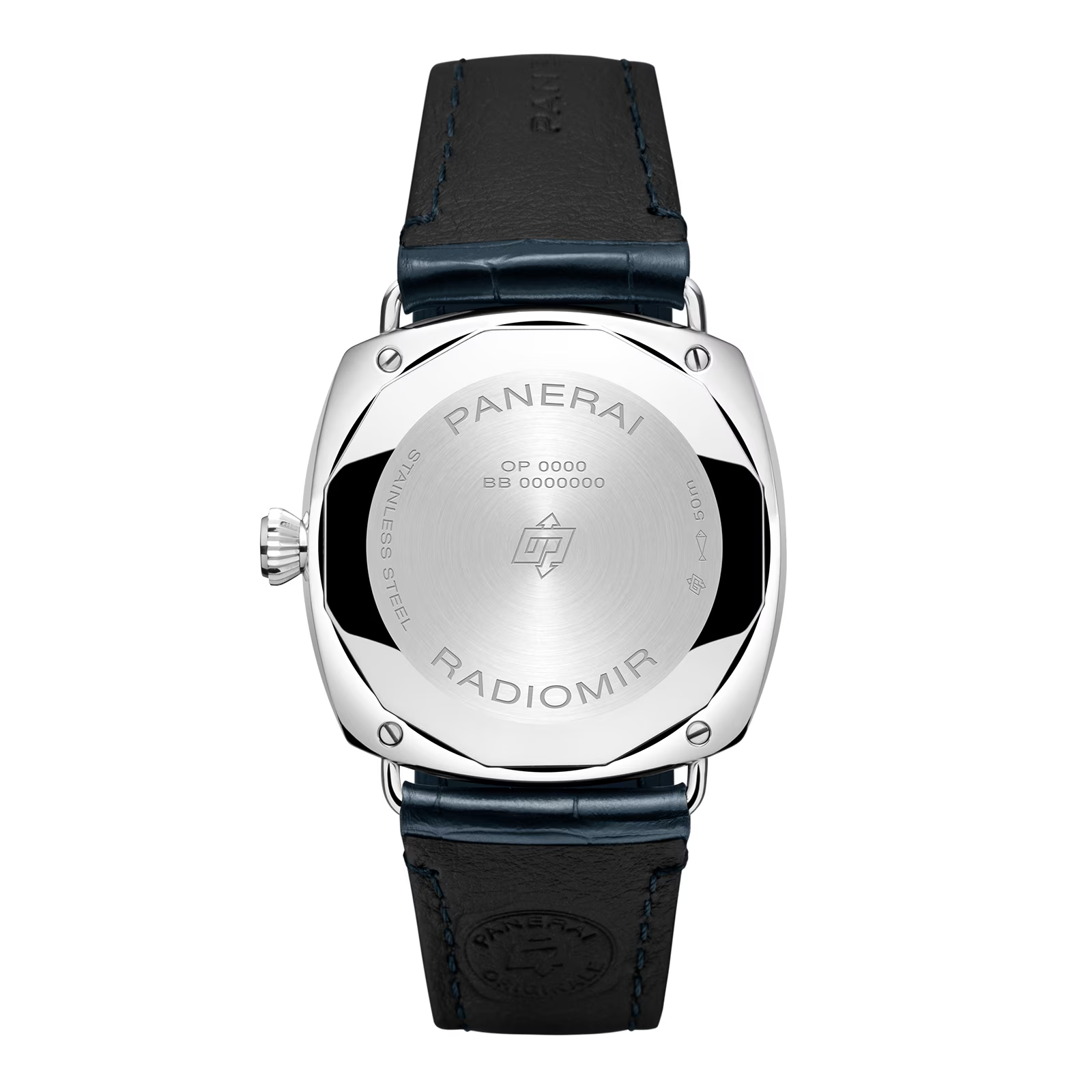 An ode to luxurious yet functional timekeeping. this Radiomir Quaranta model is presented in a robust 40mm polished steel case with a complimentary blu profondo leather strap.