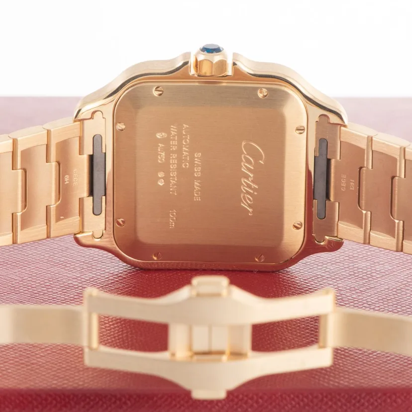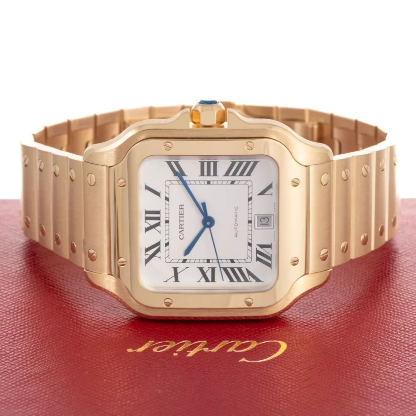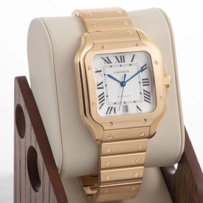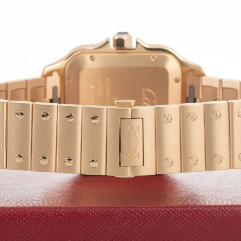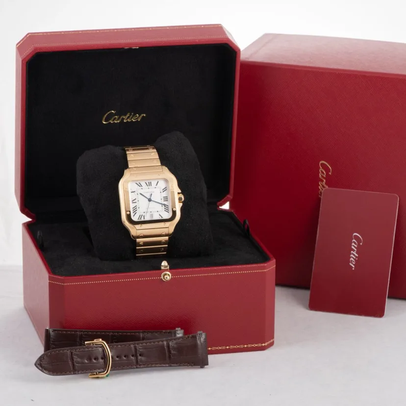 Santos watch. medium model. mechanical movement with automatic winding. calibre 1847 MC. 18K yellow gold case. 18K yellow gold 7-sided crown set with a faceted sapphire. silvered opaline dial. blued-steel sword-shaped hands. sapphire crystal. 18K yellow gold bracelet with ��SmartLink�� adjustment system. Second bracelet in alligator skin. with interchangeable 18K yellow gold folding buckle. Both bracelets are fitted with the ��QuickSwitch�� interchangeability system. Case width: 35.1 mm. thickness: 8.83 mm. Water-resistant to 10 bar (approx. 100 metres).