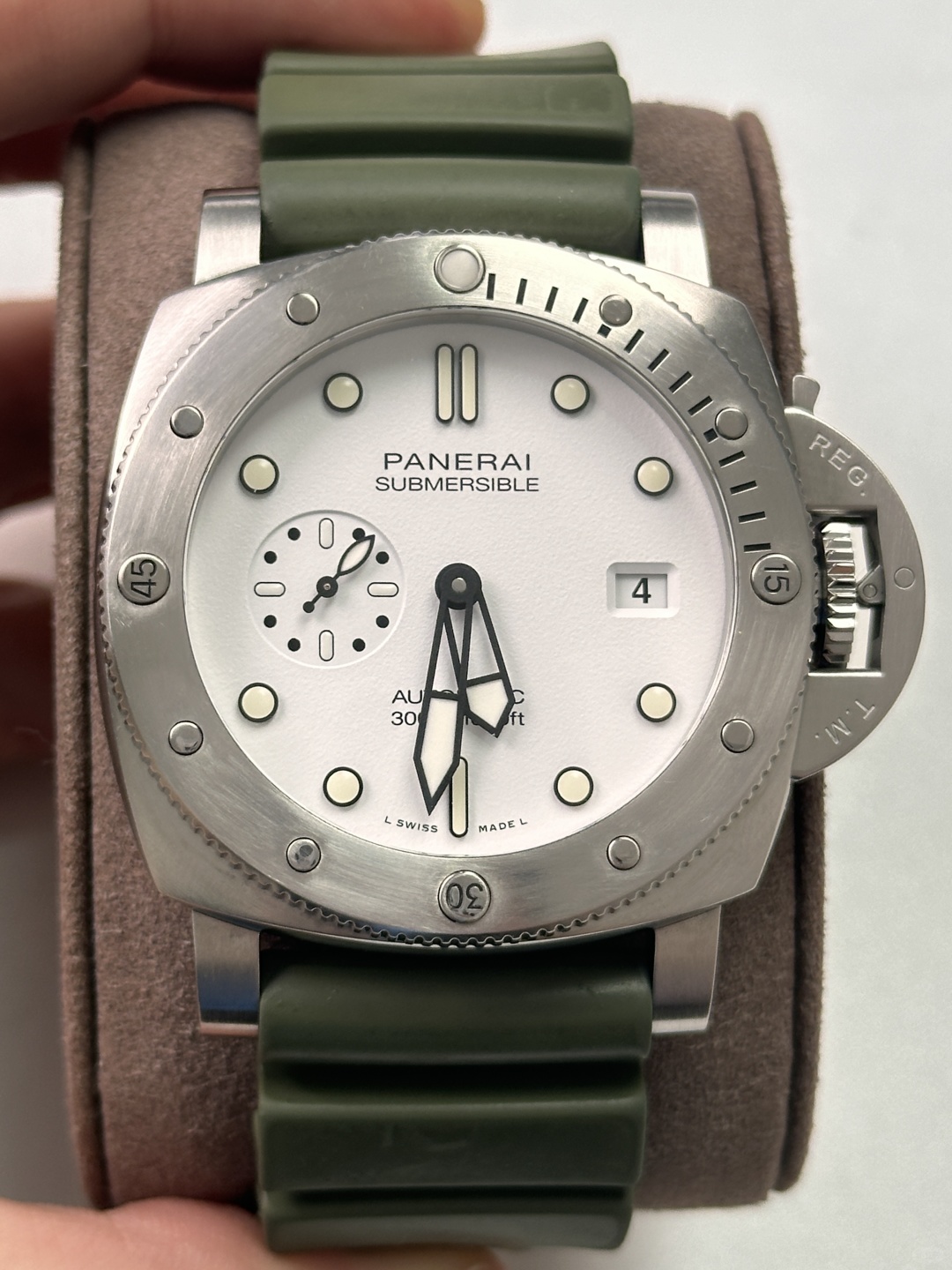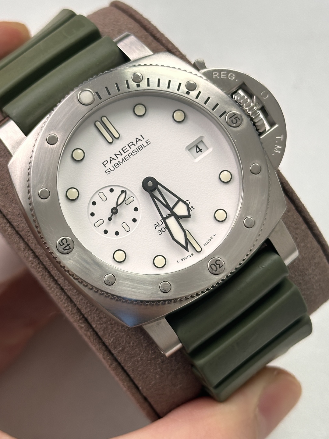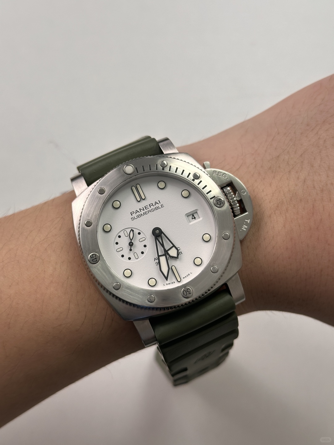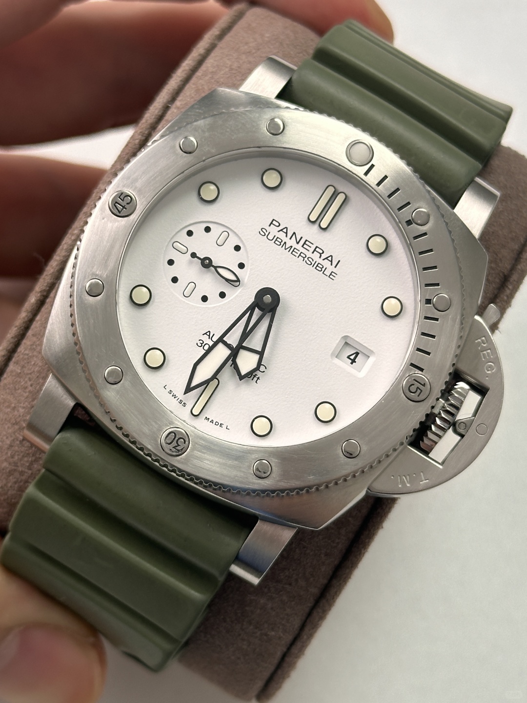 White with luminous hour markers and dots. Date at 3 o'clock. small seconds at 9 o'clock
