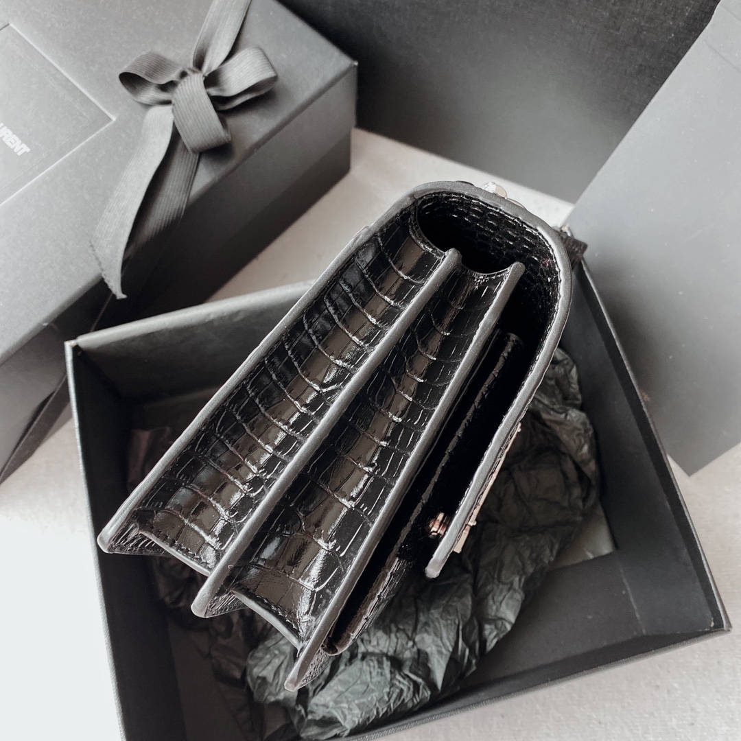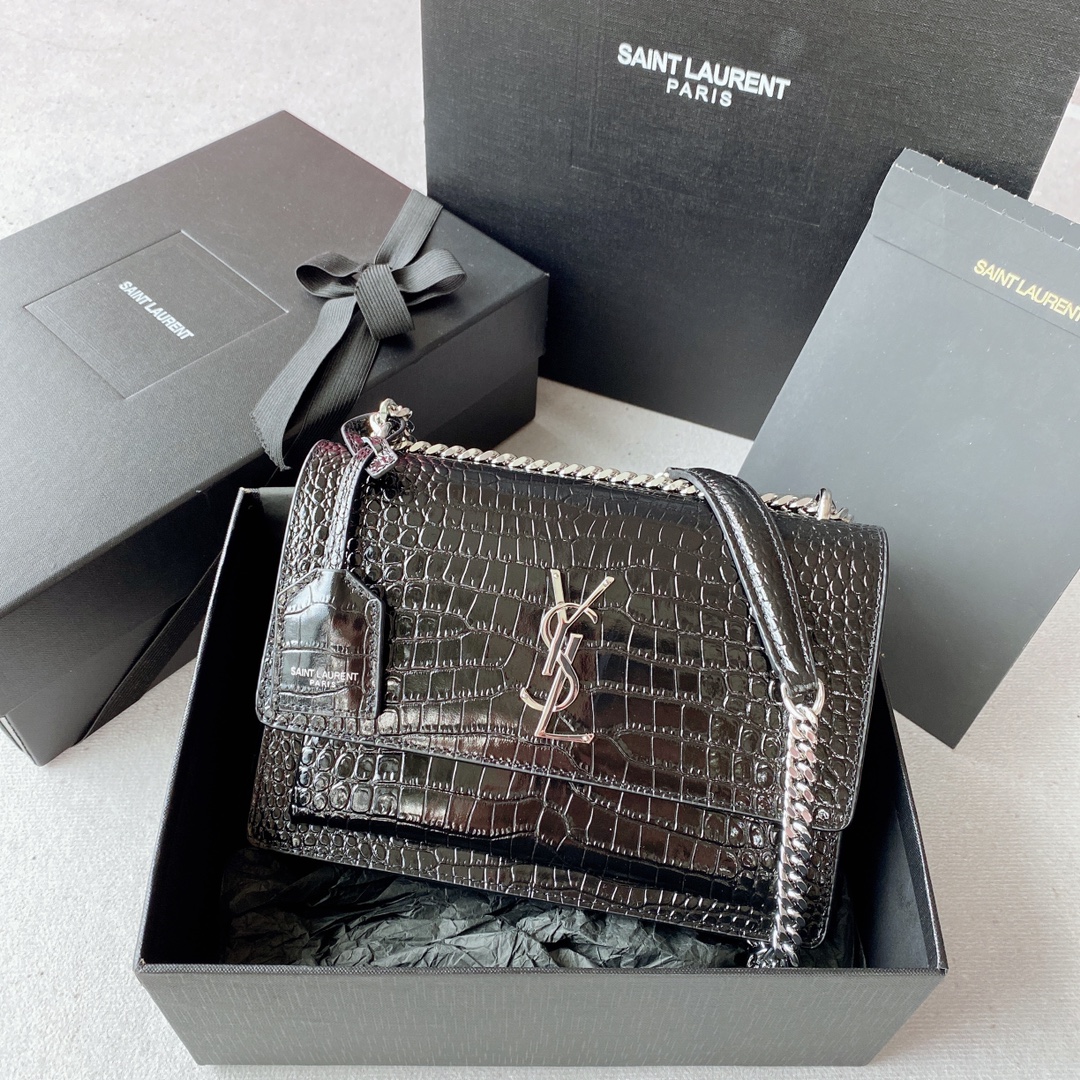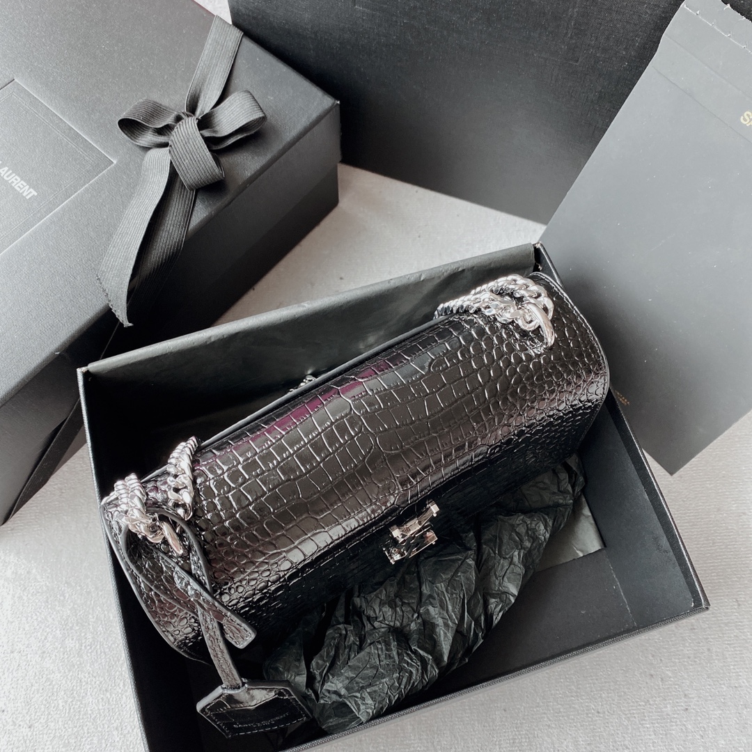 BORSA CON PATTA SUL DAVANTI. CARATTERIZZATA DA SOFFIETTI LATERALI. UNA TRACOLLA IN PELLE E CON CATENA CHE PU ESSERE INDOSSATA A TRACOLLA O ACCORCIATA PER UNA PORTABILIT A SPALLA. UN PORTACHIAVI CON CUSTODIA IN PELLE E INIZIALI YSL IN METALLO.