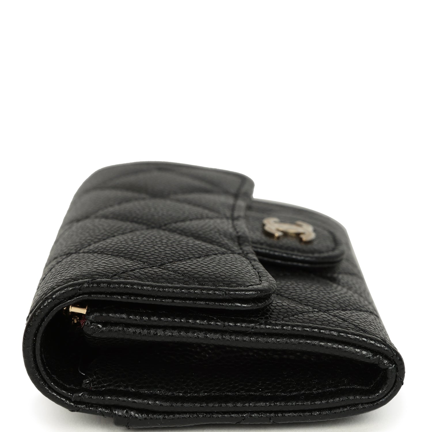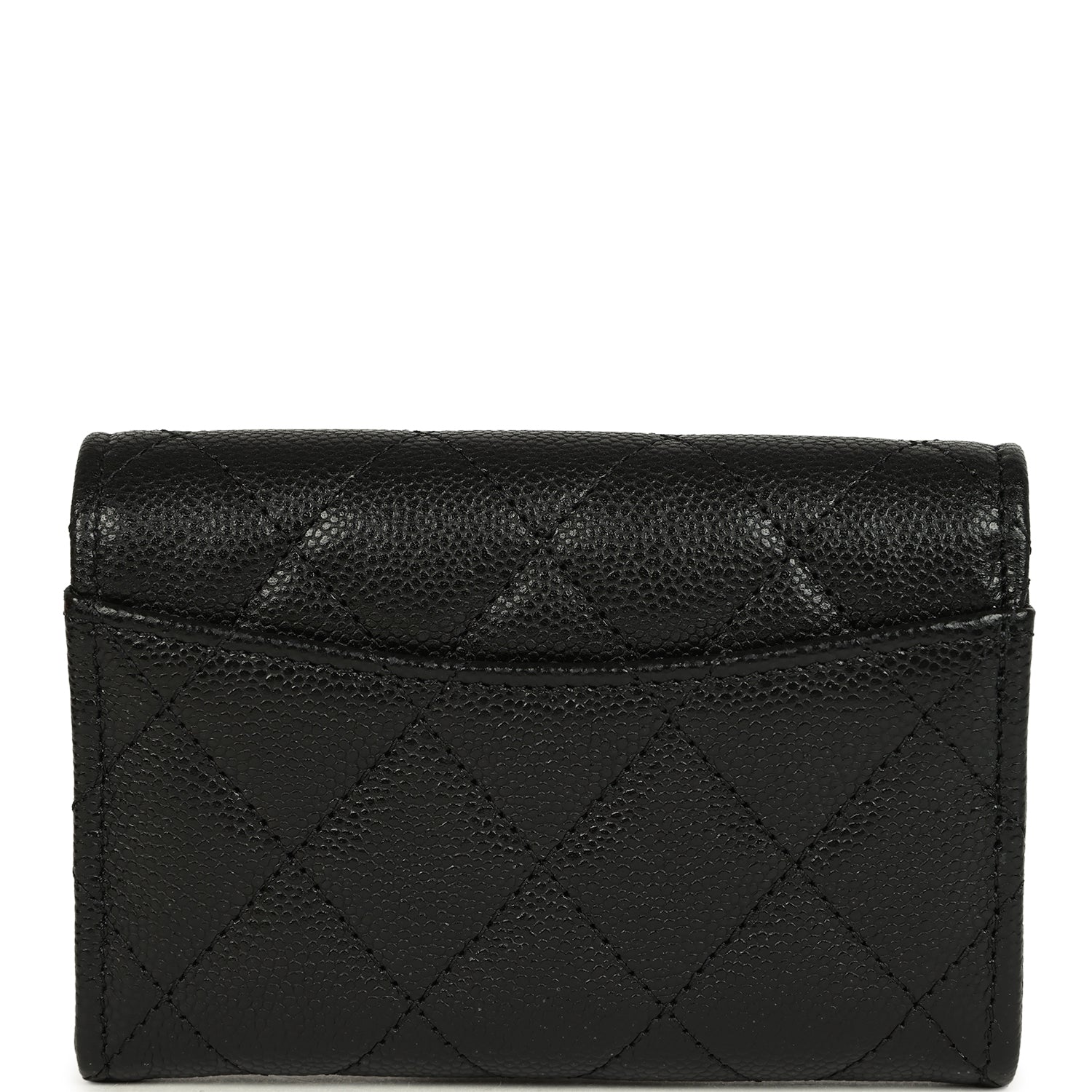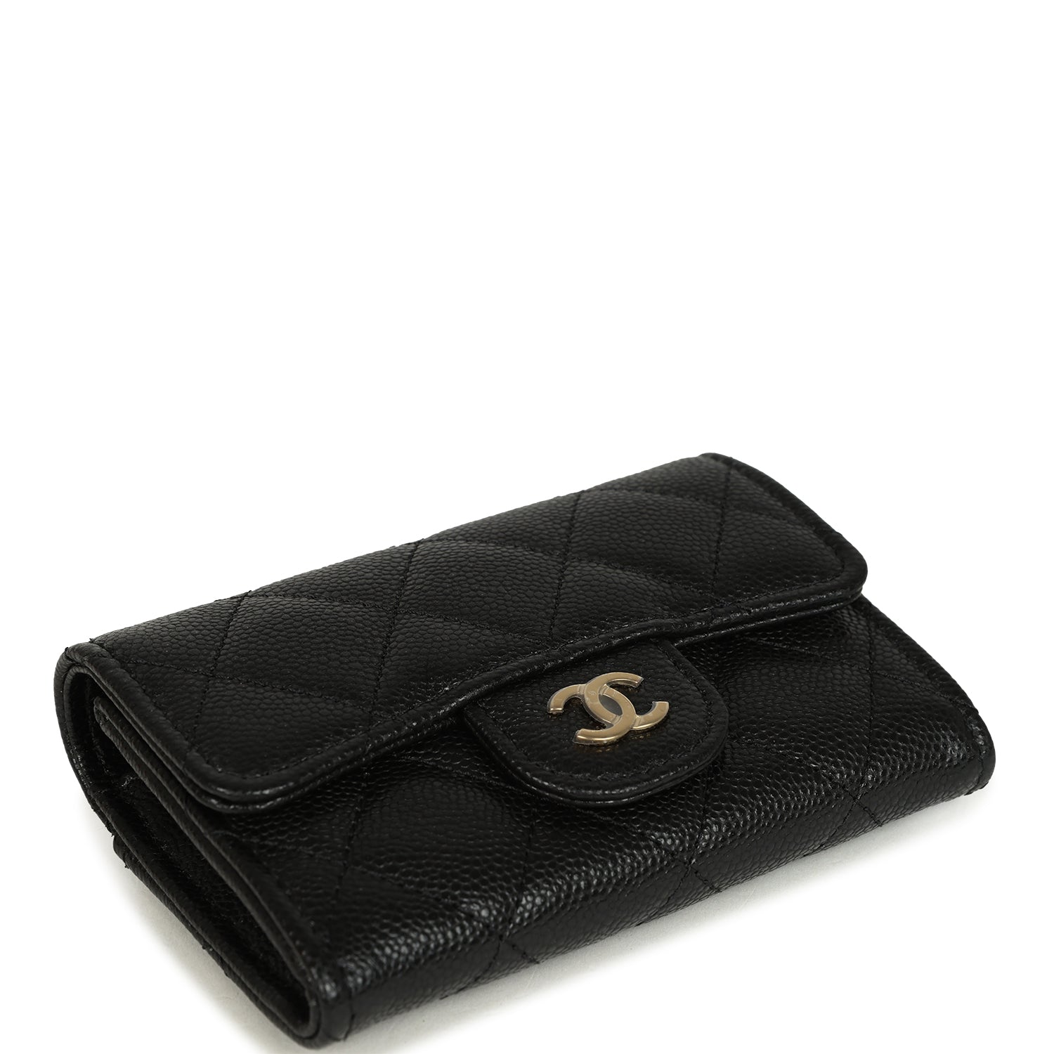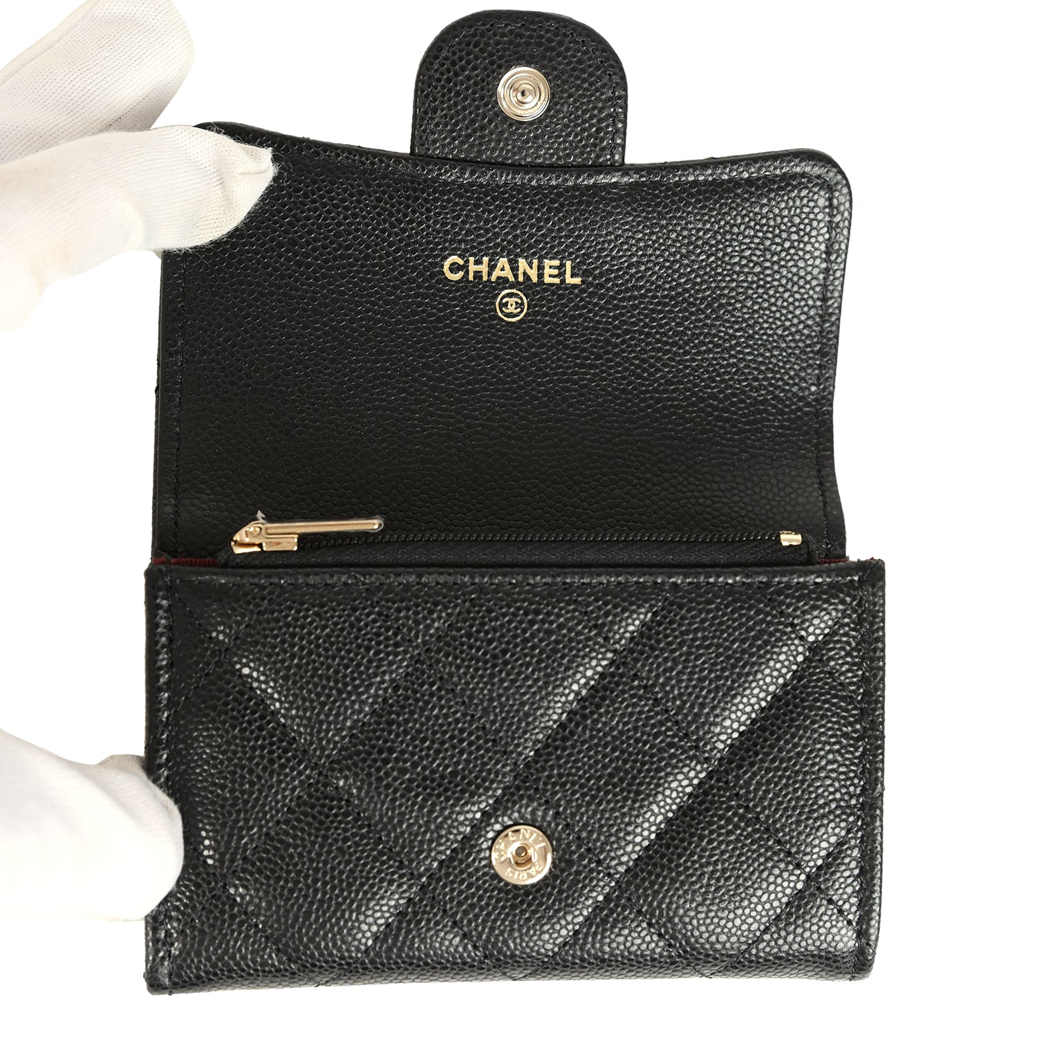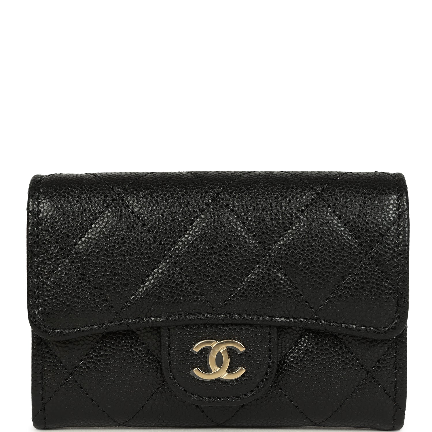 This Chanel Classic Card Holder Wallet in black caviar leather with light gold tone hardware featuring. signature "CC" logo on the front flap. a snap closure. and signature half-moon pocket on the back.