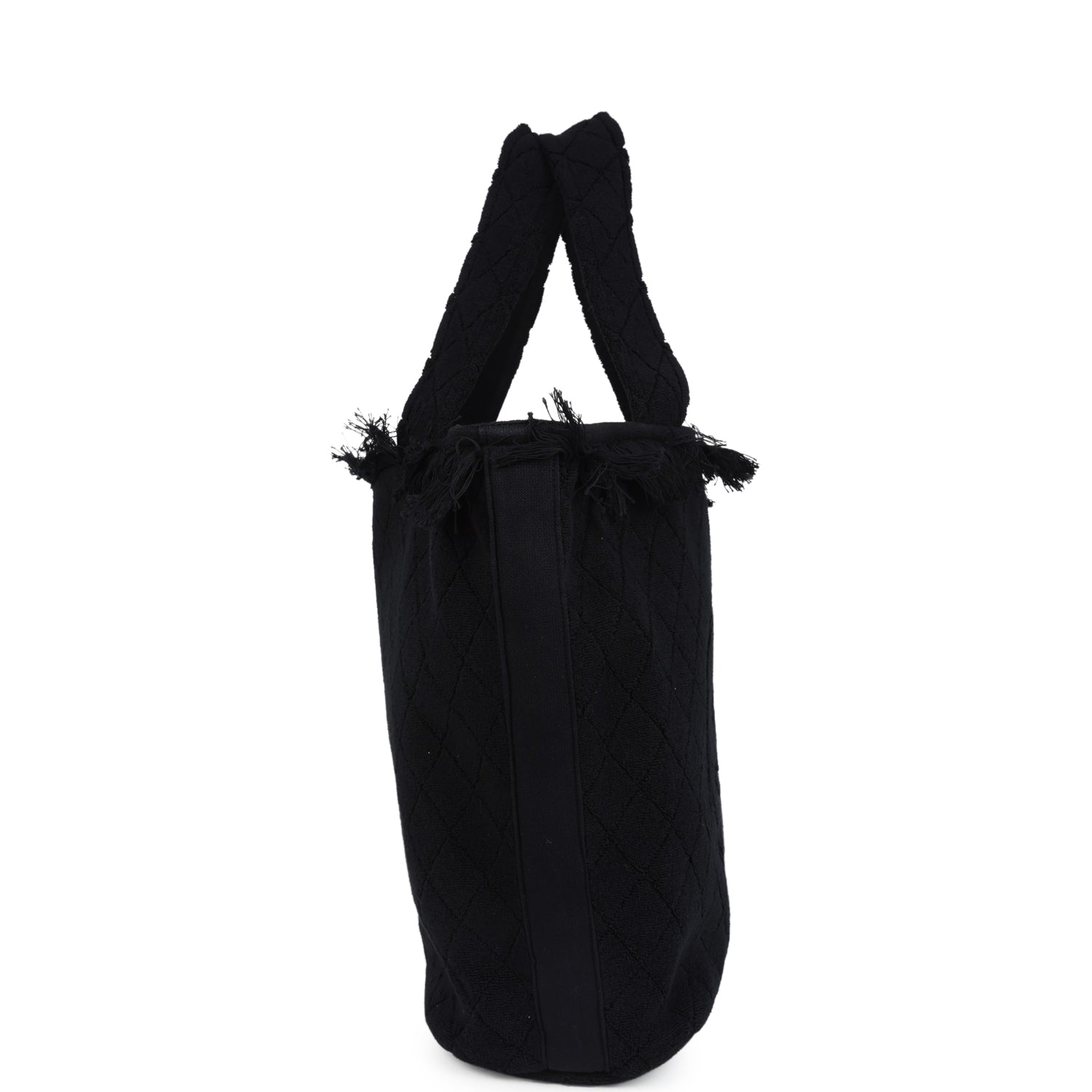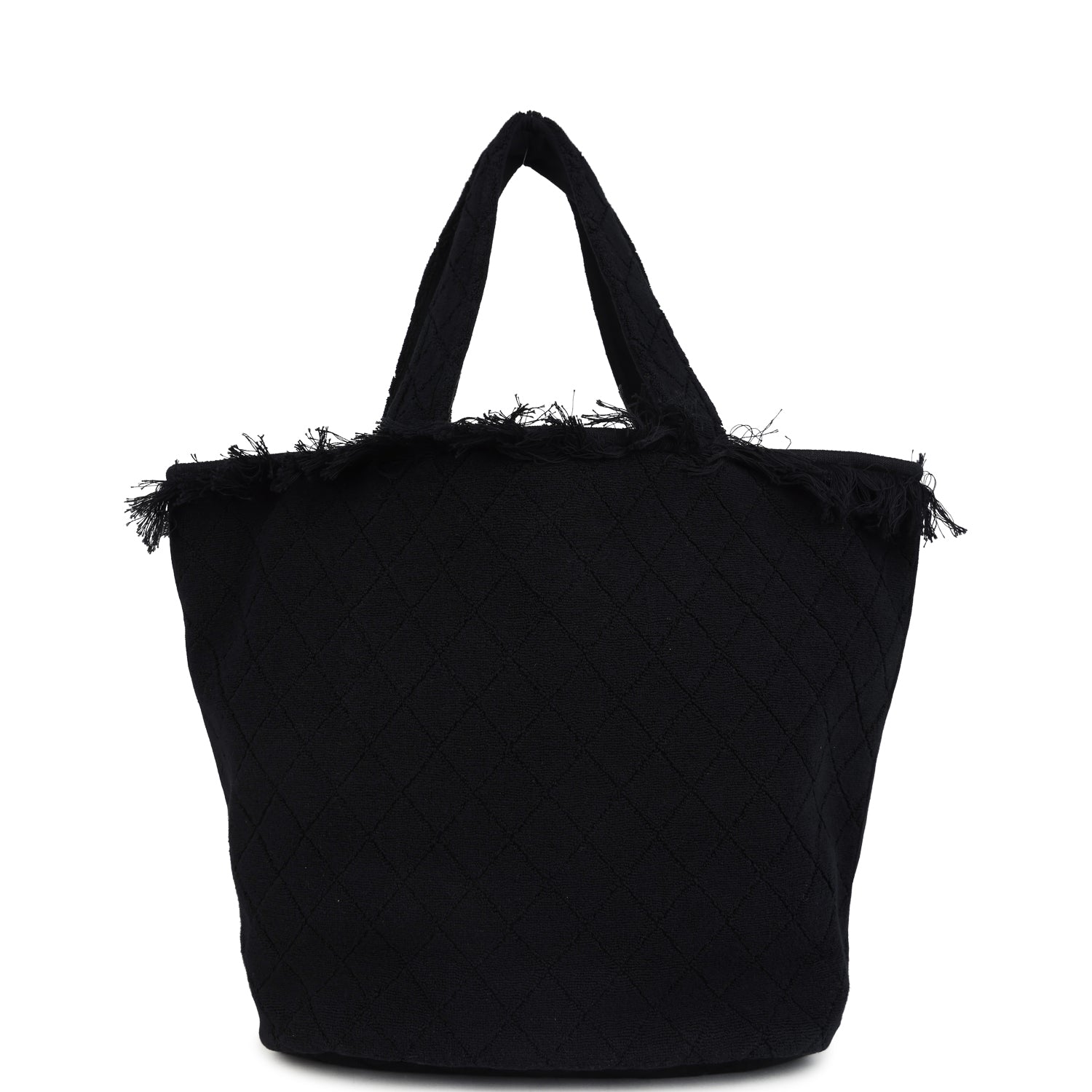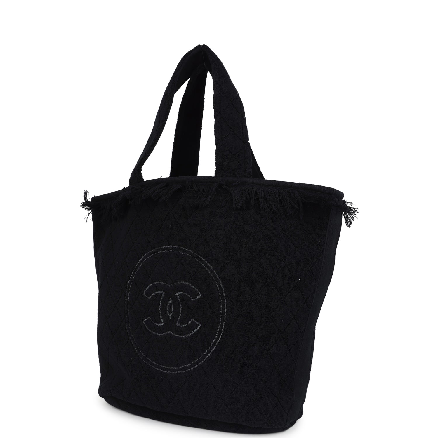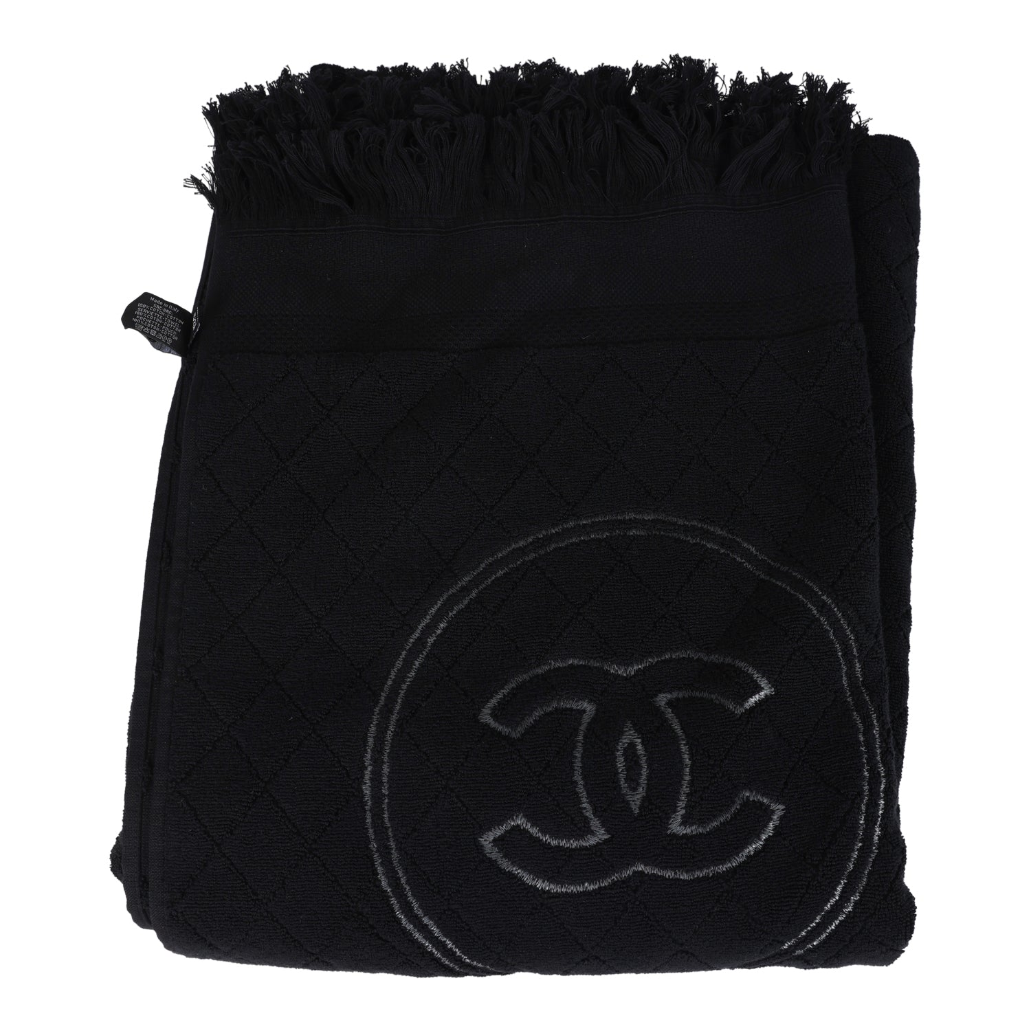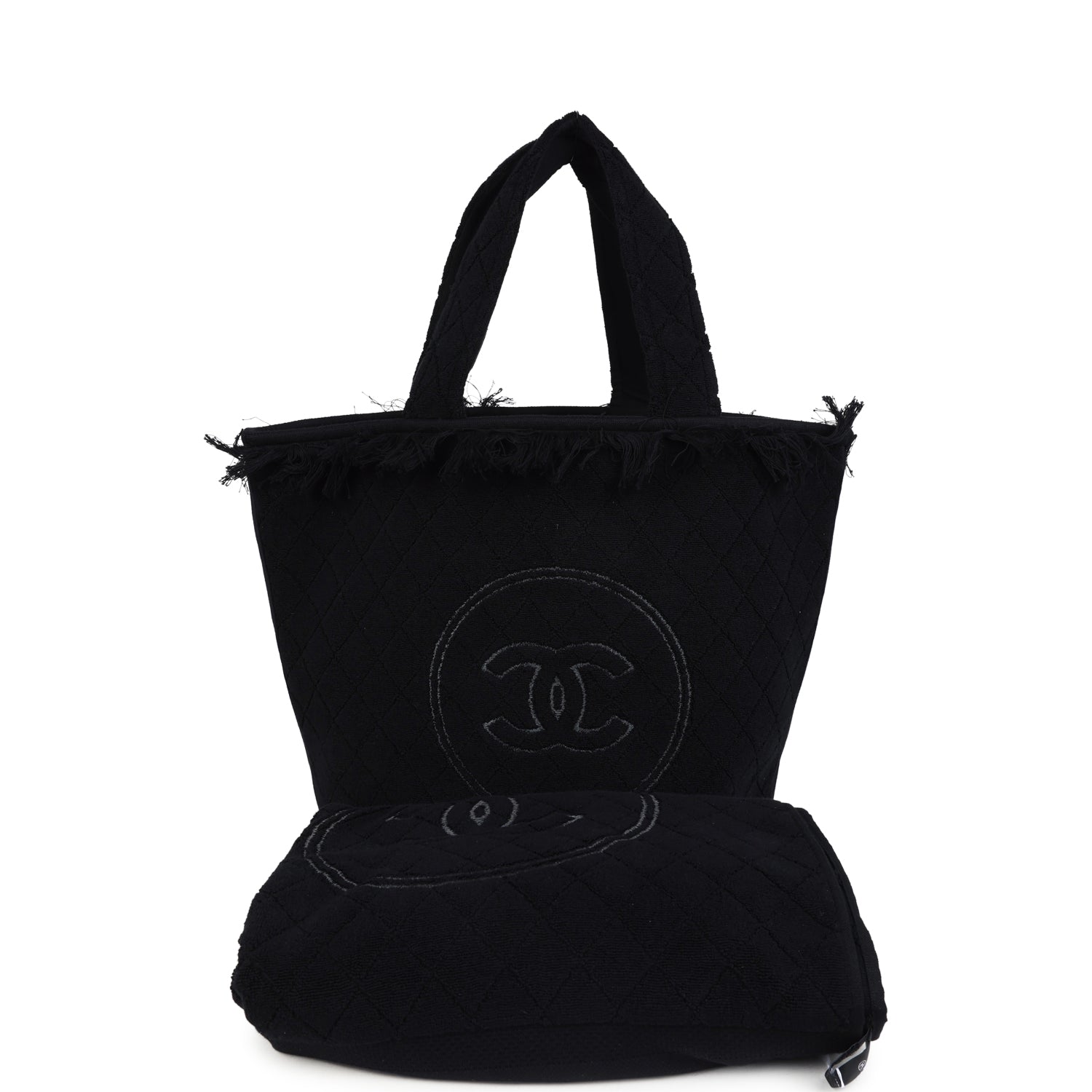 This CC Beach Tote Bag & Towel Set is in black cotton terrycloth fabric features quilted terry fabric. tonal fringe along the top of the tote bag. a large signature CC logo on the front. a removable pouch and a CC cotton towel.