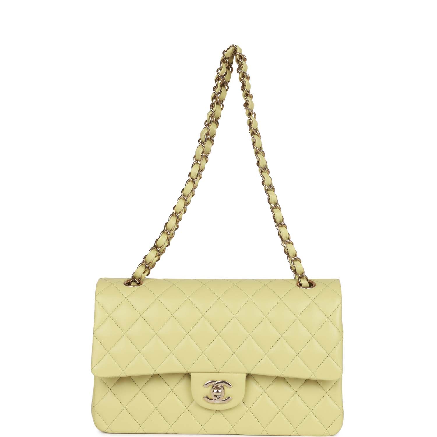 This Medium Classic Double Flap bag is in light green lambskin leather with light gold tone hardware and features a front flap with signature CC turnlock closure. half moon back pocket. and adjustable interwoven light gold tone chain link and light green leather shoulder strap.