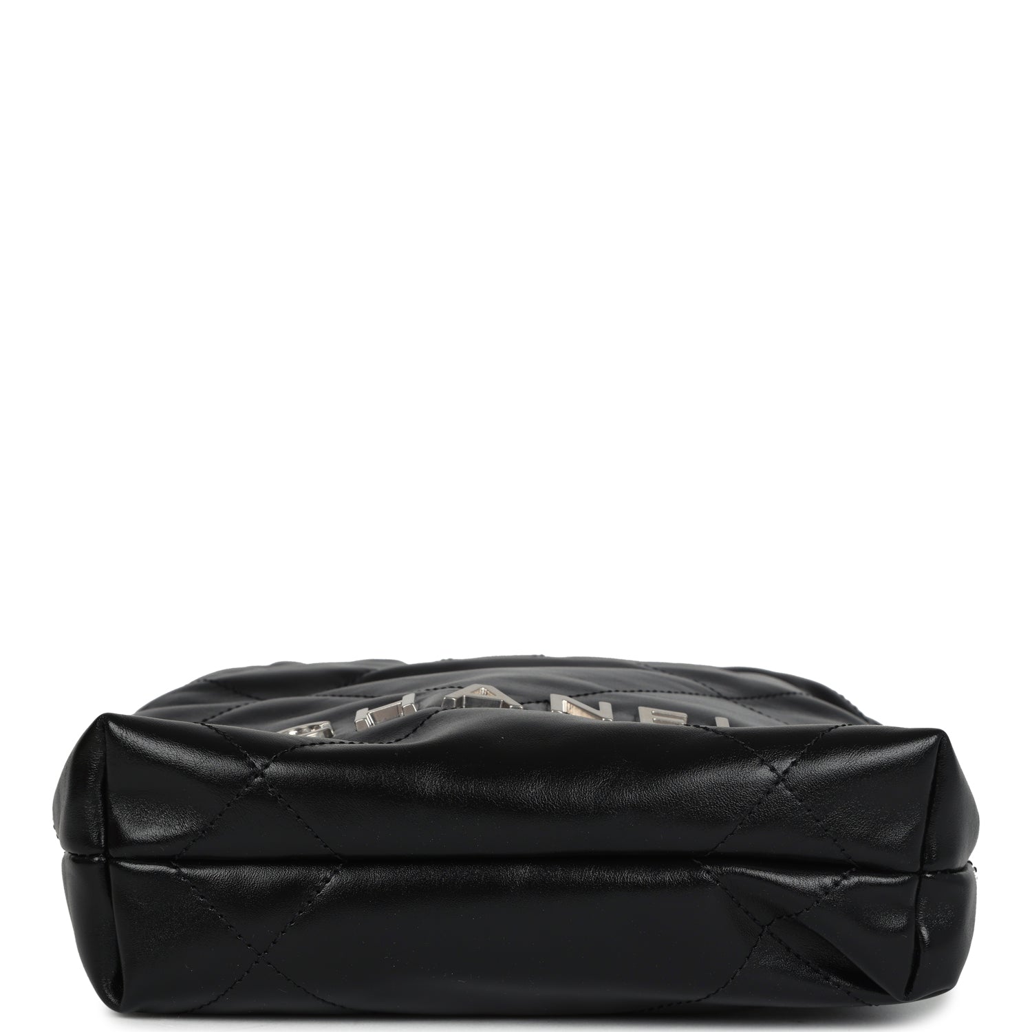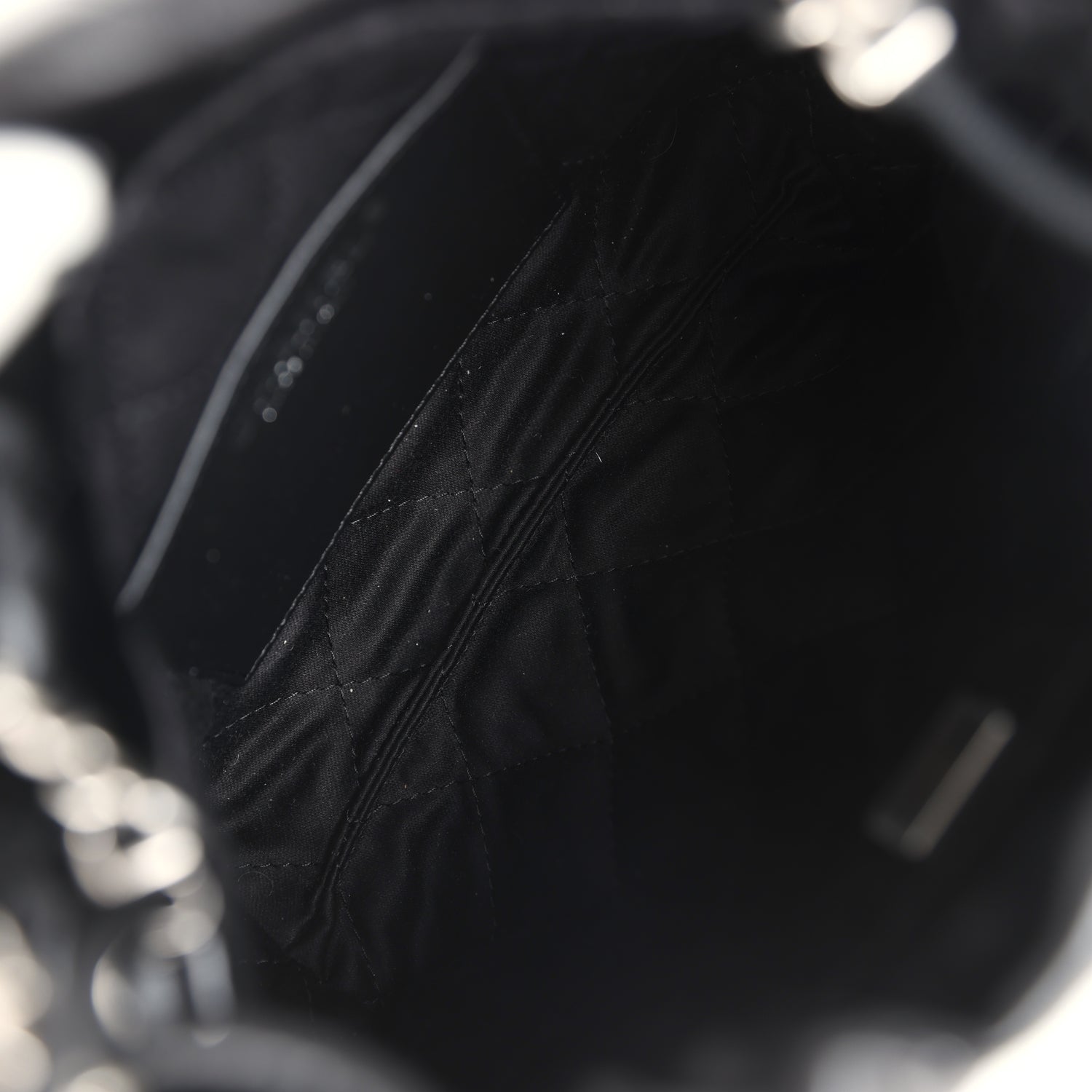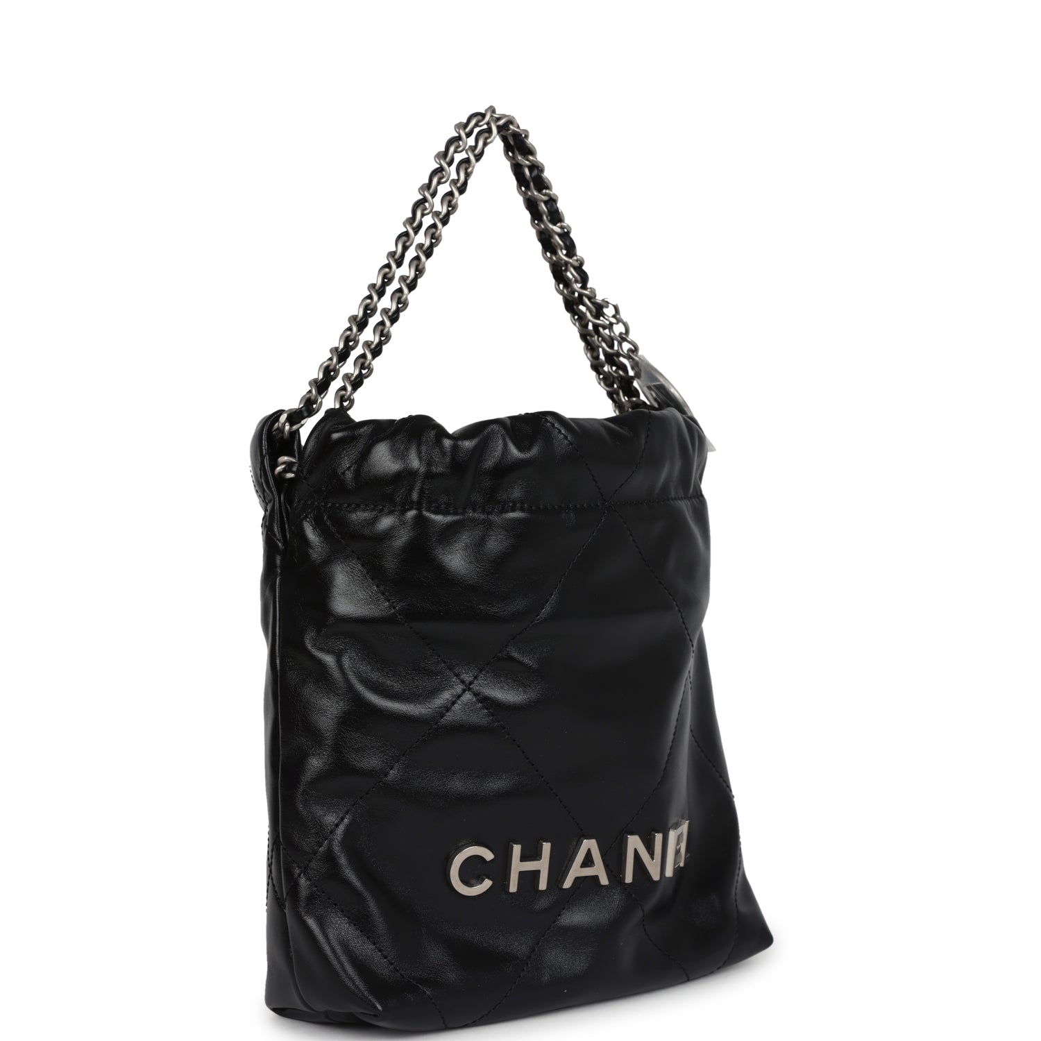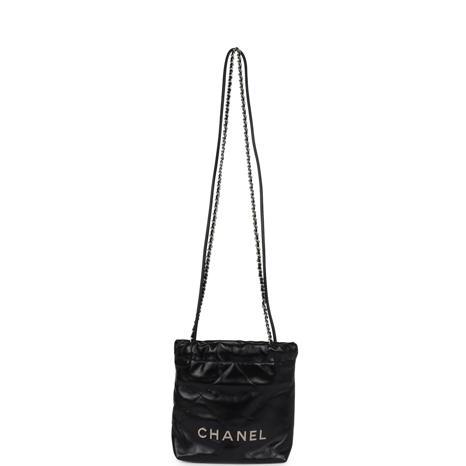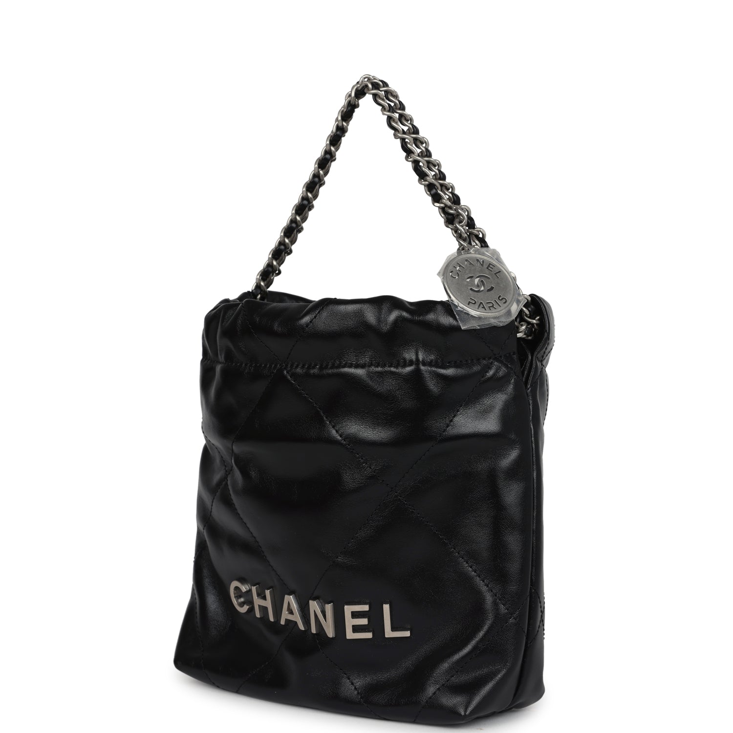 This Chanel Mini 22 Hobo Bag is in black shiny calfskin Leather with brushed silver tone hardware. has signature quilt leather. brushed silver tone metal "Chanel" logo on front of bag. Chanel Paris metal hang tag. brushed silver chain link interwoven with leather and one removable long leather cord act as shoulder and cross body strap.
