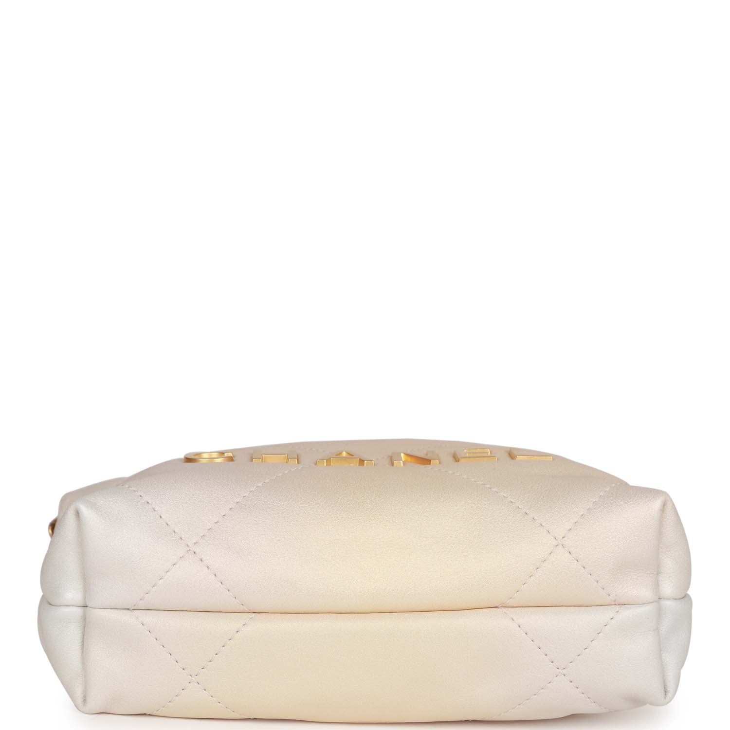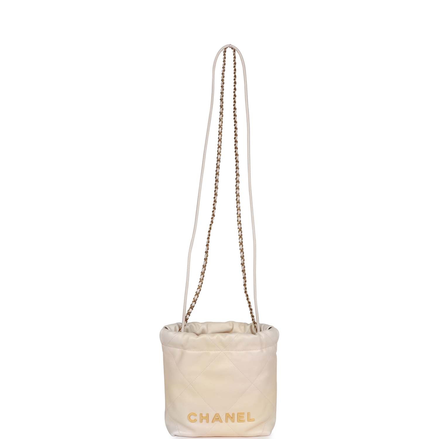 This Mini 22 Hobo Bag is in Champagne Iridescent calfskin with gold tone hardware. has the signature diamond quilting. CHANEL on the front in gold tone metal. and a long gold tone and champagne leather interwoven chain.