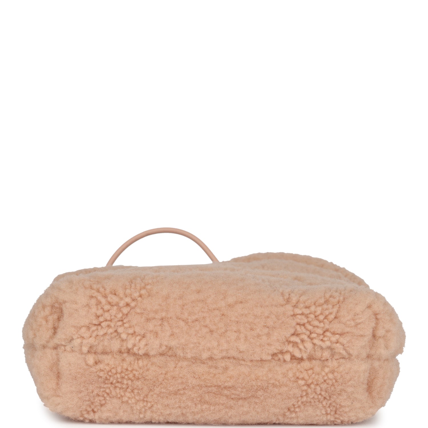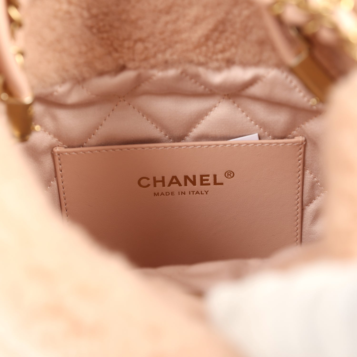This Mini 22 Hobo Bag is in light pink shearling with gold tone hardware. has the signature diamond quilt. a gold tone metal "Chanel" logo on front of bag. Chanel Paris metal hang tag. interwoven chain link with gold metal and light pink leather shoulder straps. one long leather cord and one long leather and interwoven gold chainlink strap.