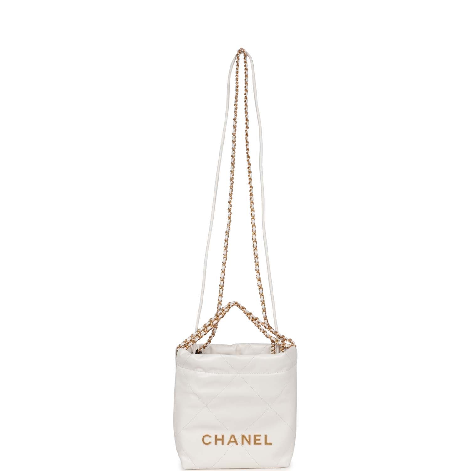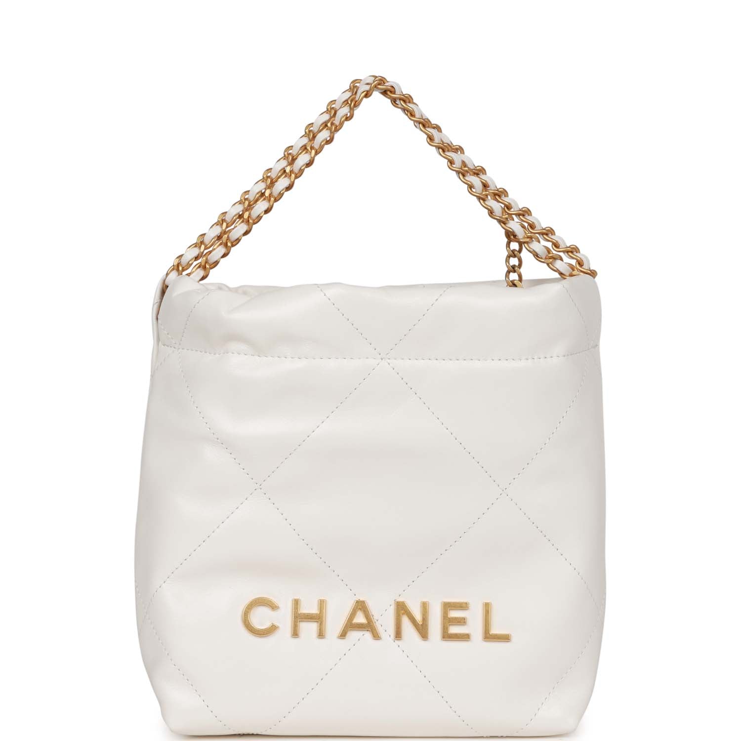 This Chanel Mini 22 hobo bag in white calfskin with antique gold tone hardware and has the signature diamond quilting. CHANEL on the front in antique gold metal. and long antique gold tone and white leather interwoven chain.