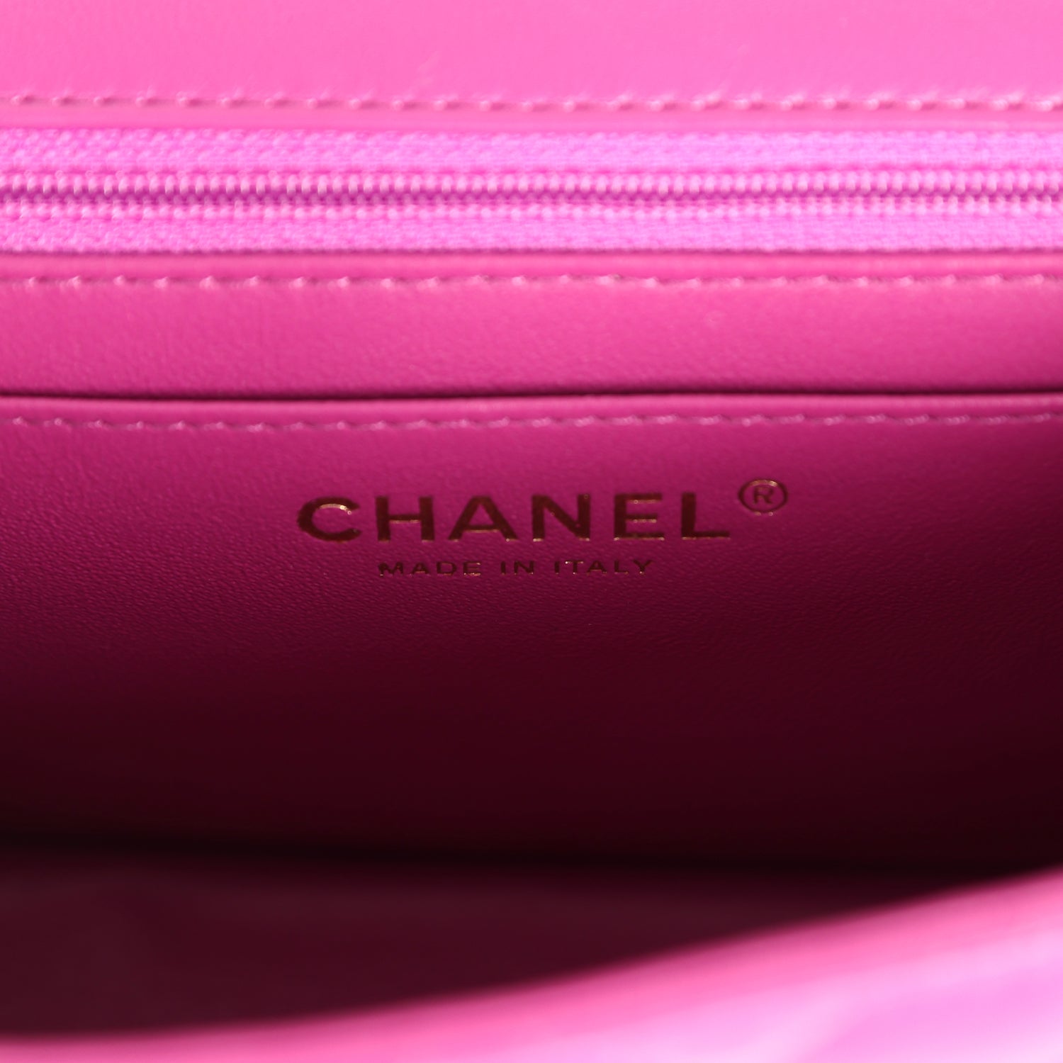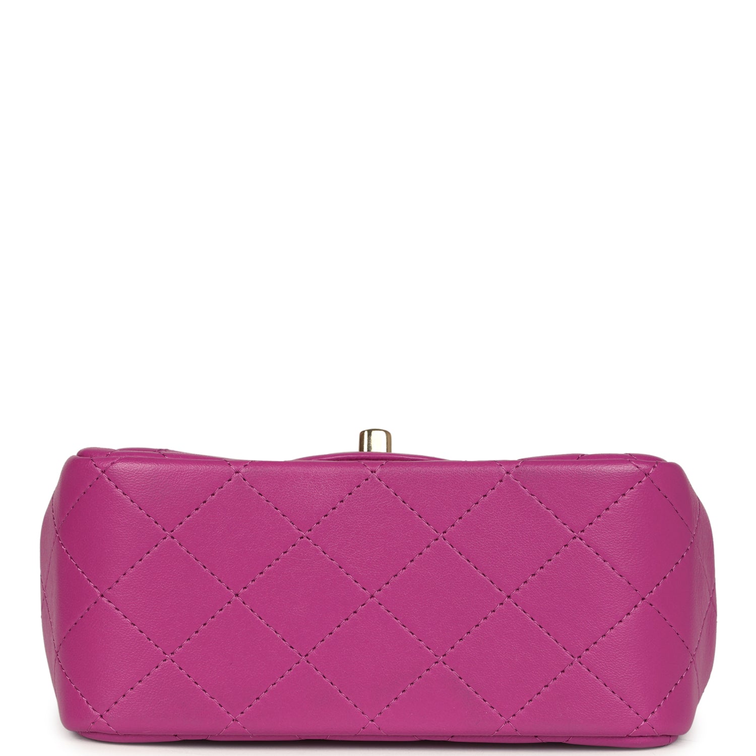 This Chanel Mini Square flap bag is of purple lambskin with gold hardware and has a front flap with signature CC turnlock closure. rear half moon pocket. and an interwoven purple leather and gold tone chain link shoulder/crossbody strap.