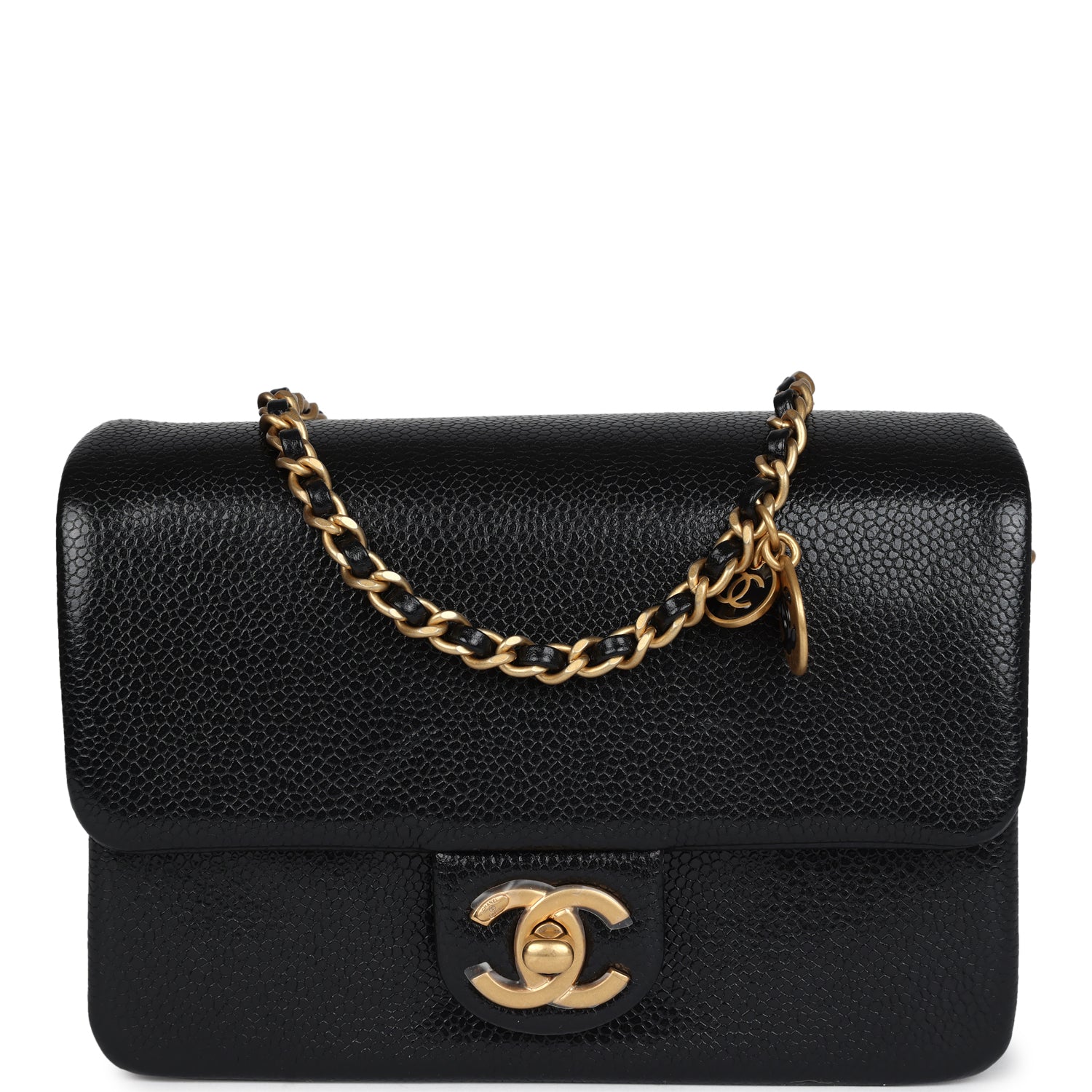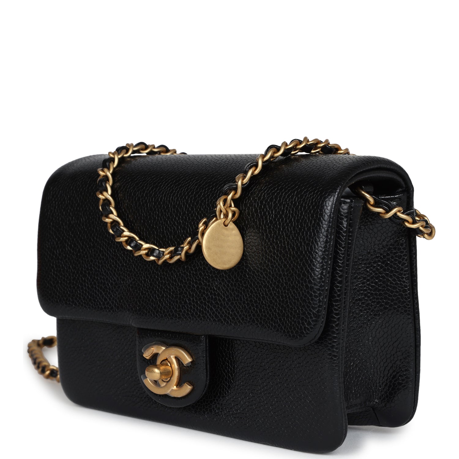This Chanel Mini Flap Bag is of black grained shiny calfskin leather with brushed Gold Hardware. featuring. a front flap CC turnlock closure and a single interwoven brushed gold and black leather shoulder strap with two round CC coin charms.