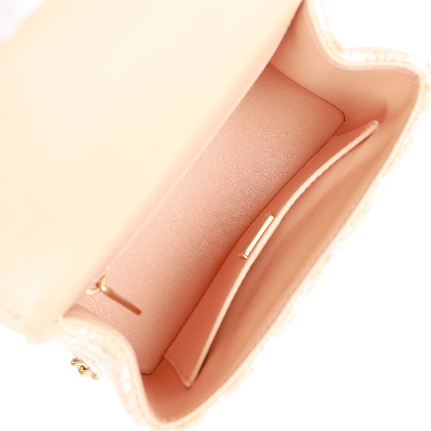 The interior is lined in orange leather and features a zipper pocket with Chanel pull and an open pocket below as well as one open pocket on the opposite wall.
