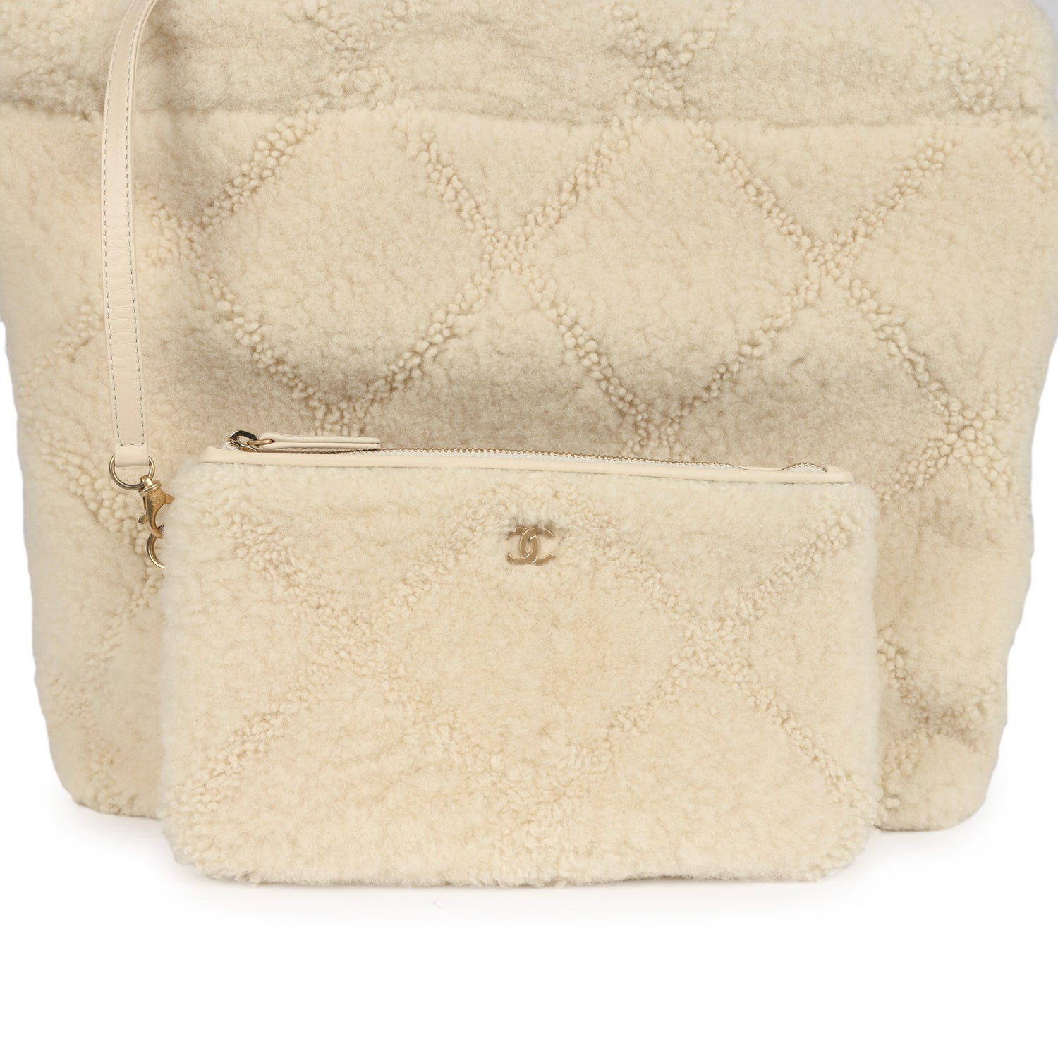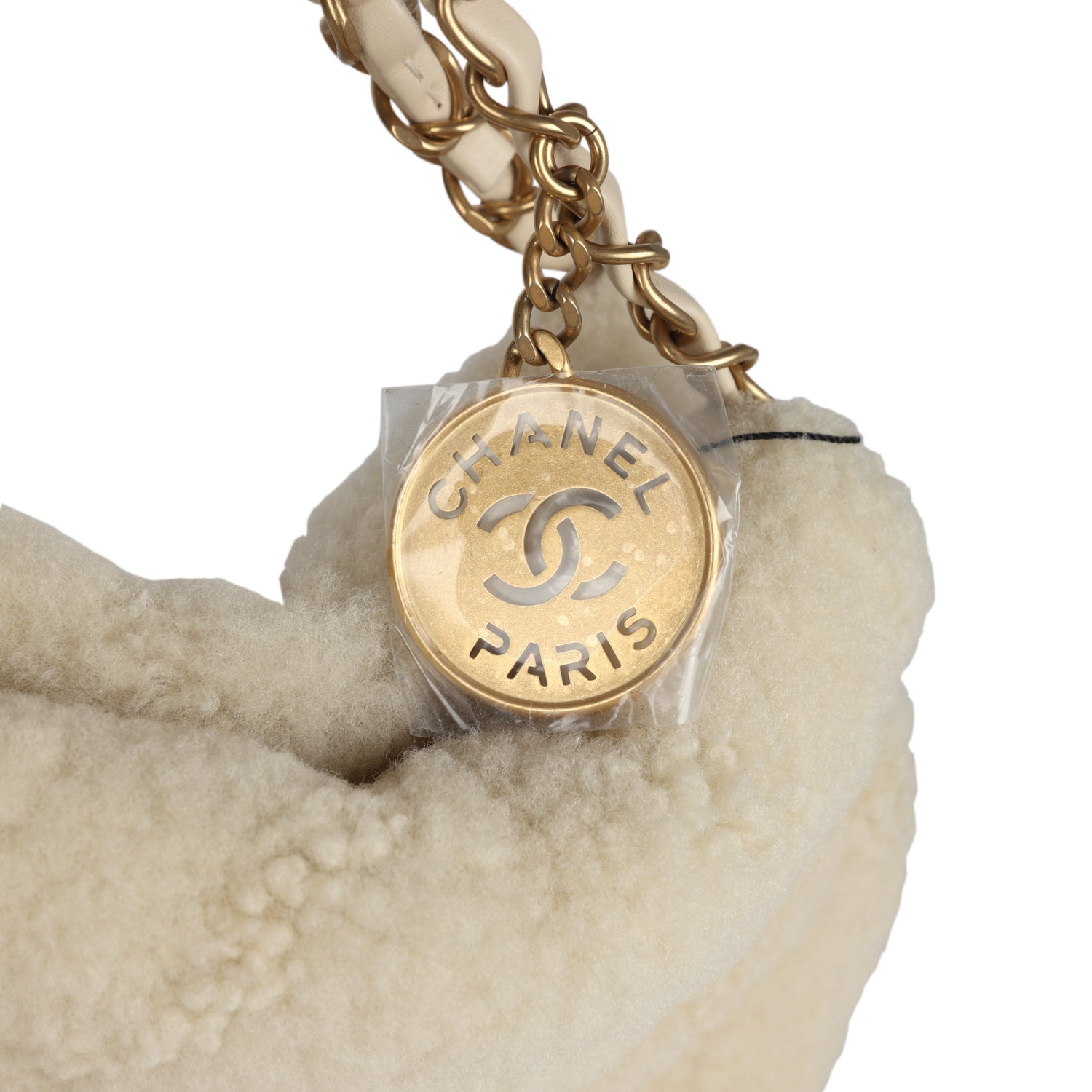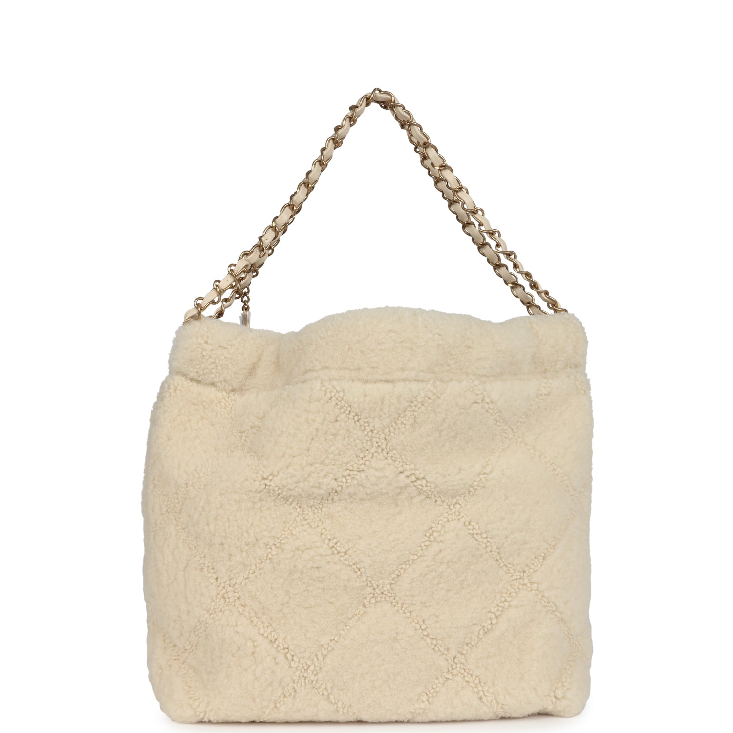 This Chanel Small 22 Hobo Bag is in ecru shearling fabric with brushed gold tone hardware. has the signature diamond quilt. gold tone metal "Chanel" logo on front of bag. Chanel Paris metal hang tag. snap closure. interwoven chain link with brushed gold metal and leather shoulder straps. and a removable shearling pouch.