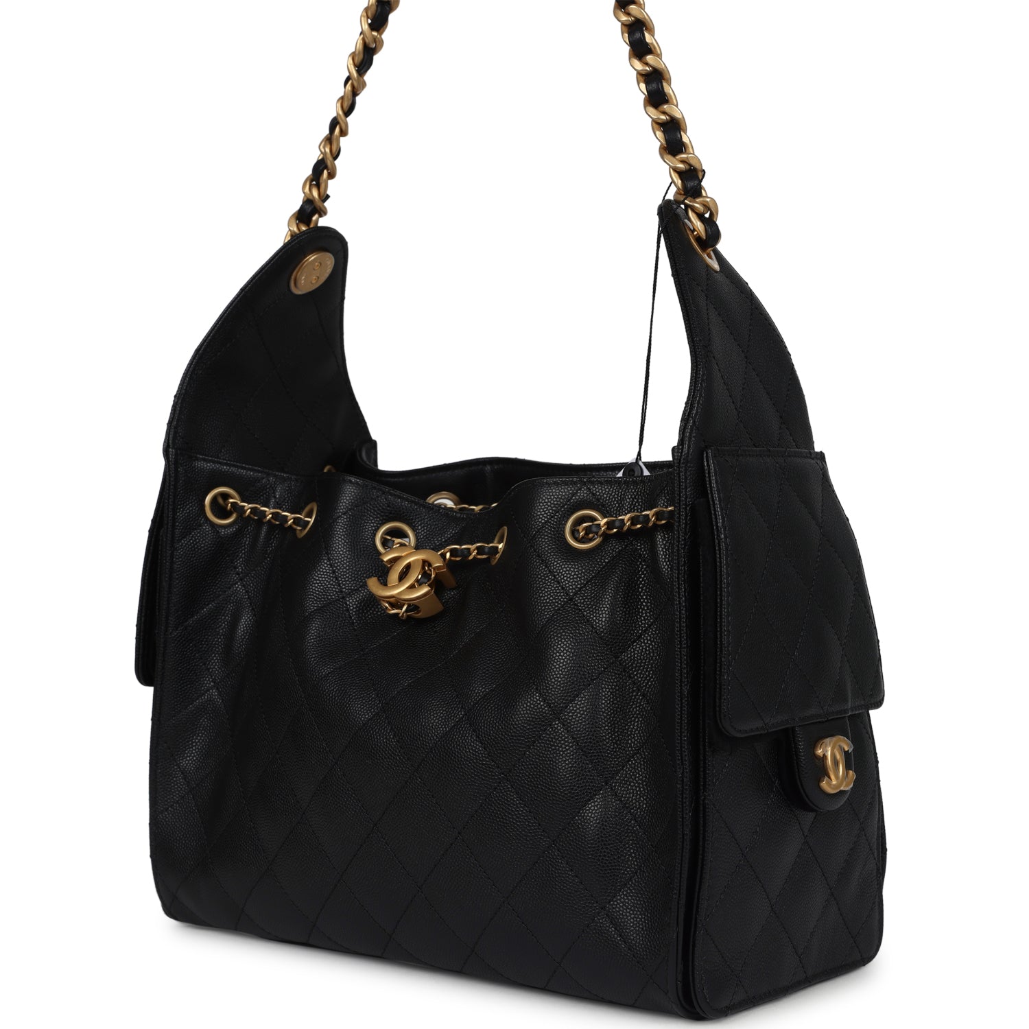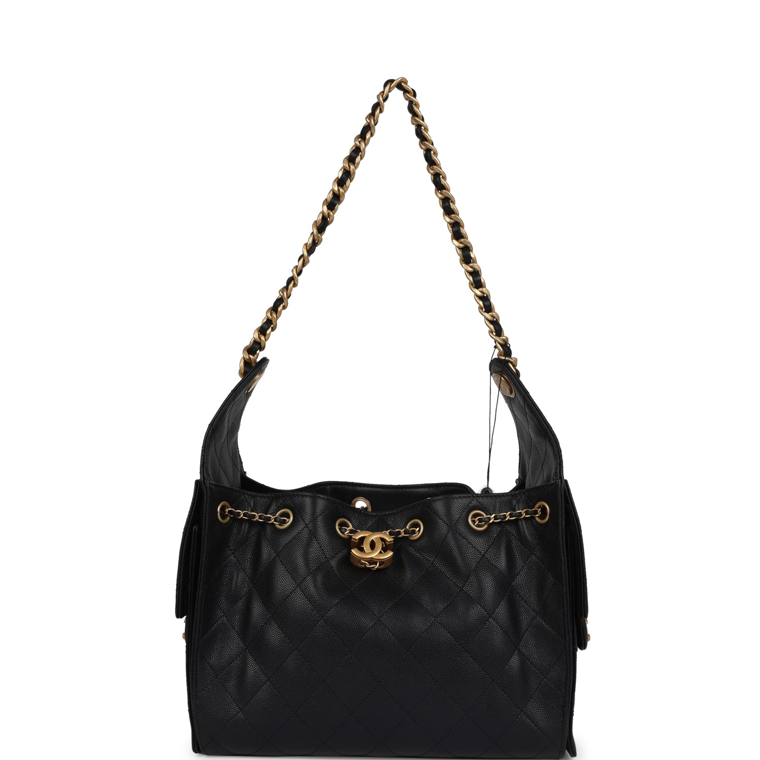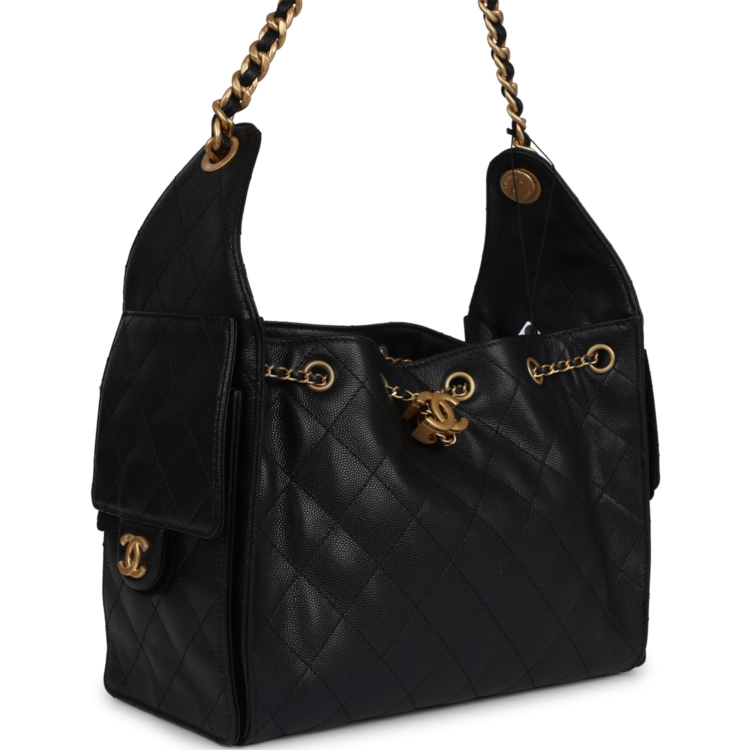 This Chanel Small 25 Hobo Bag is in black caviar leather with antique gold hardware. features signature diamond quilt. two exterior side pockets. drawstring closure. and a single interwoven antique gold and black leather shoulder strap.