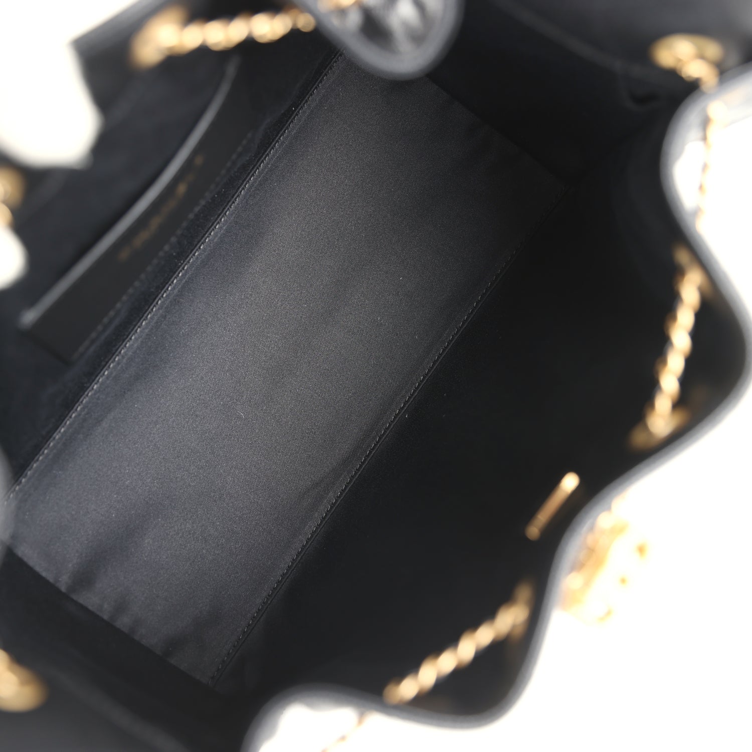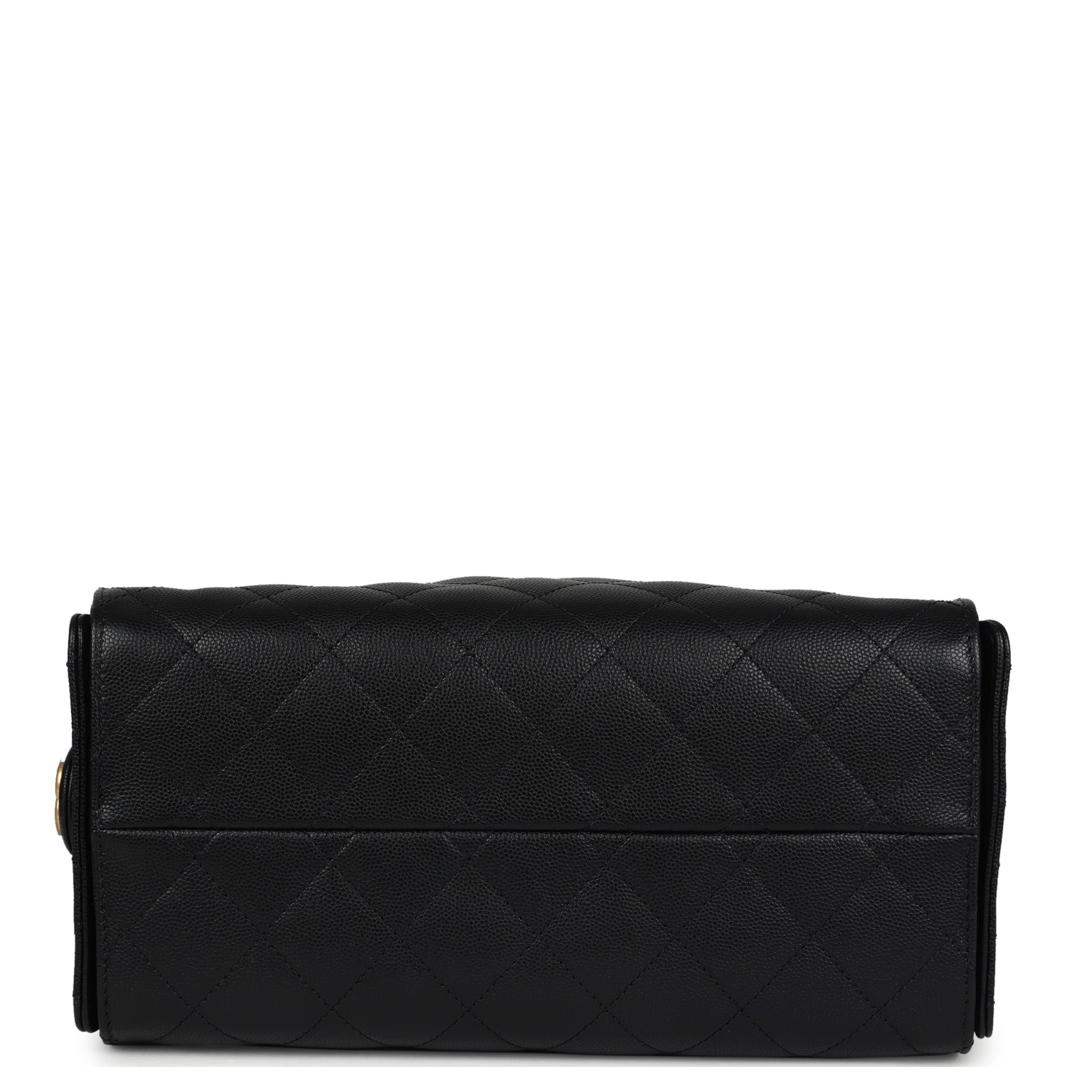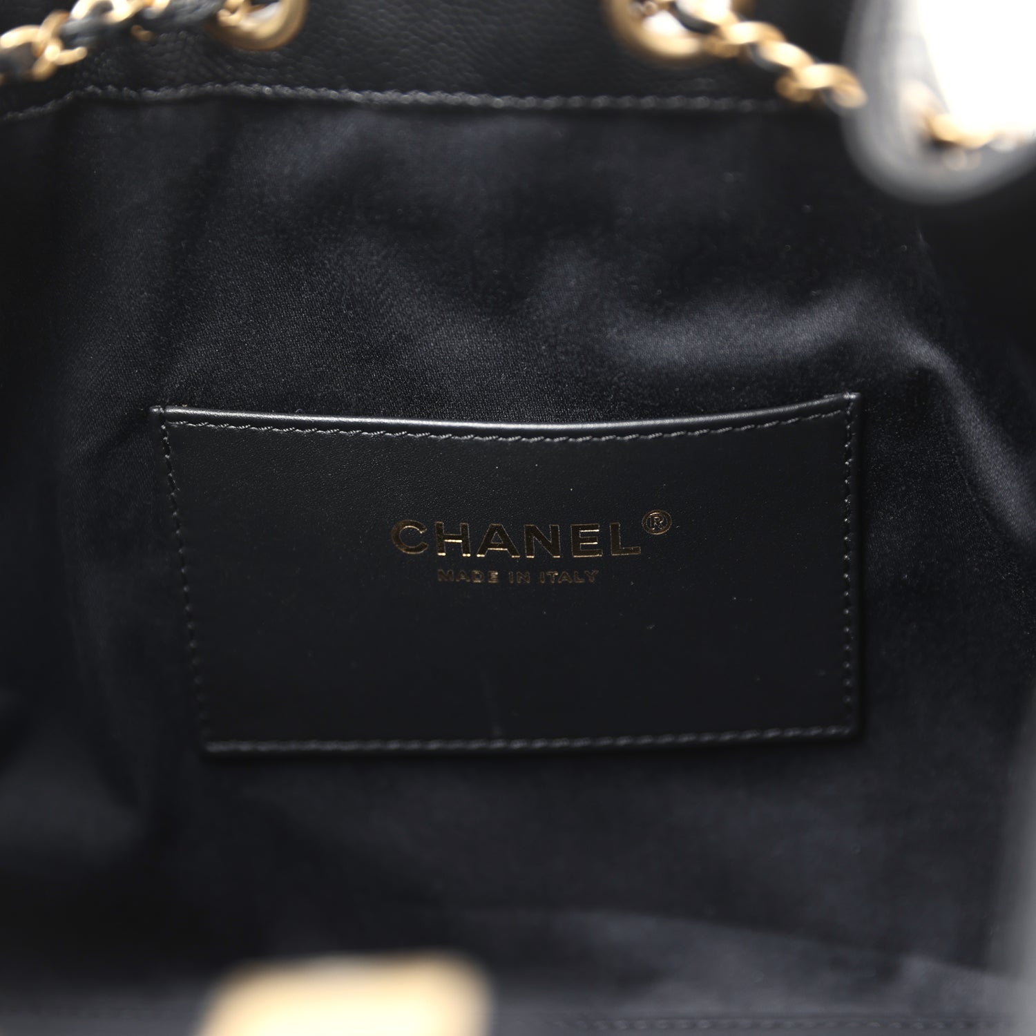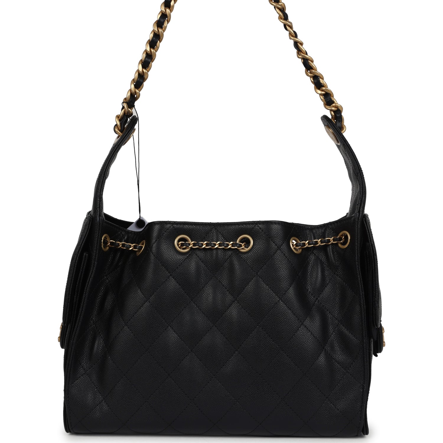 This Chanel Small 25 Hobo Bag is in black caviar leather with antique gold hardware. features signature diamond quilt. two exterior side pockets. drawstring closure. and a single interwoven antique gold and black leather shoulder strap.