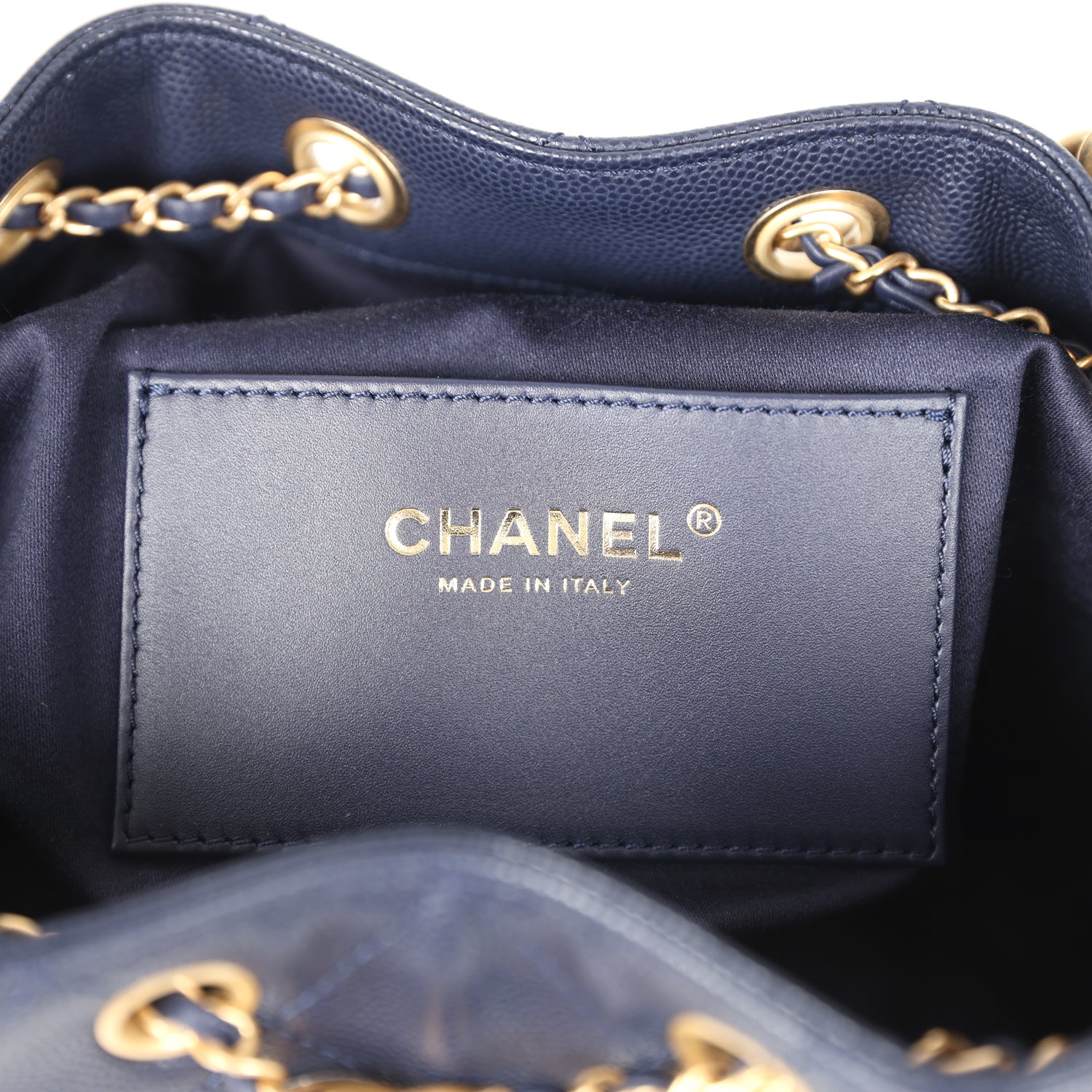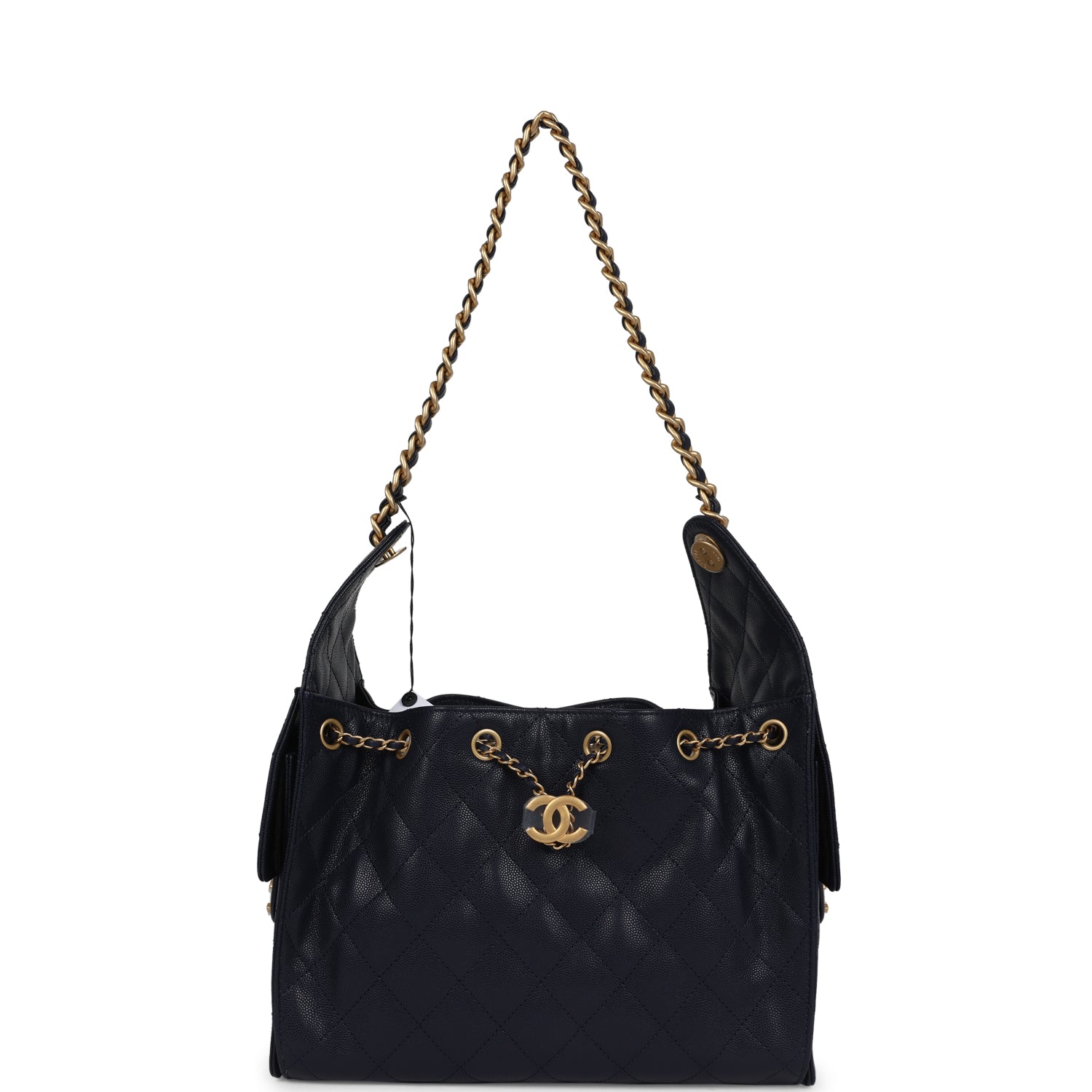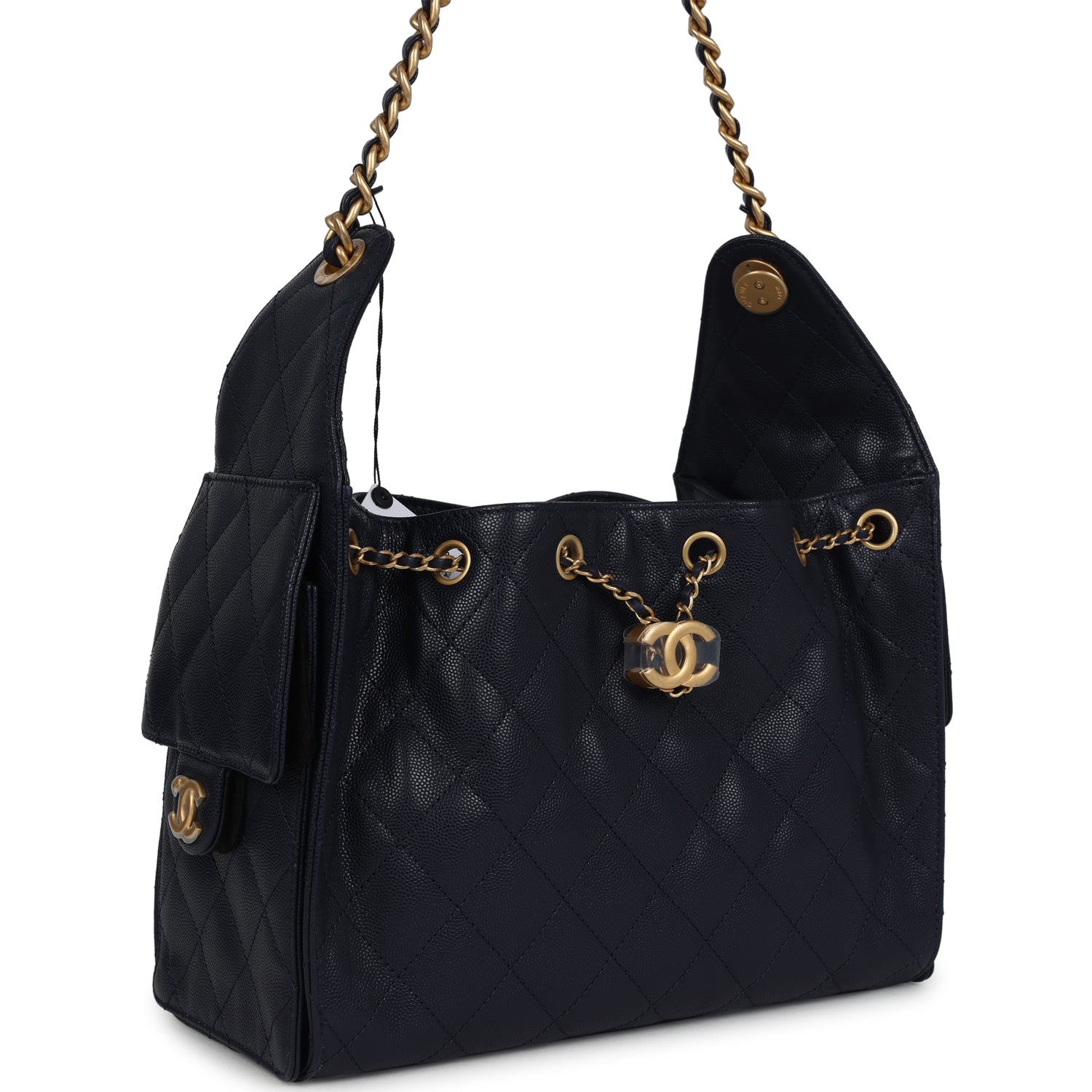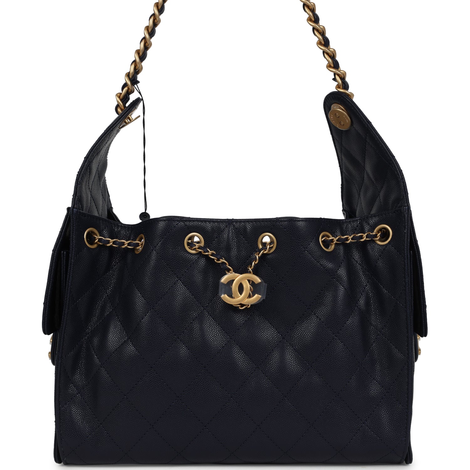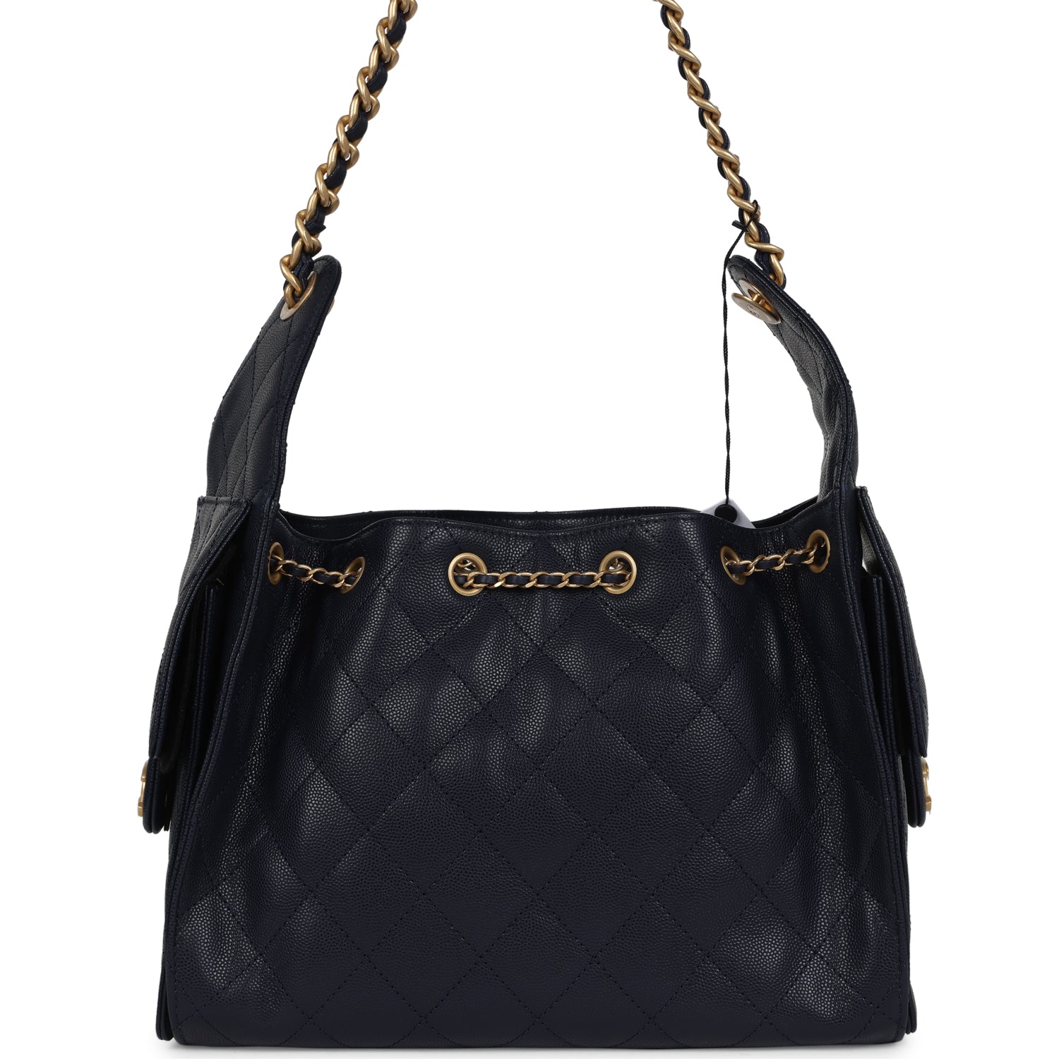This Chanel Small 25 Hobo Bag is in dark navy caviar leather with antique gold hardware. features signature diamond quilt. two exterior side pockets. drawstring closure. and a single interwoven antique gold and dark navy leather shoulder strap.