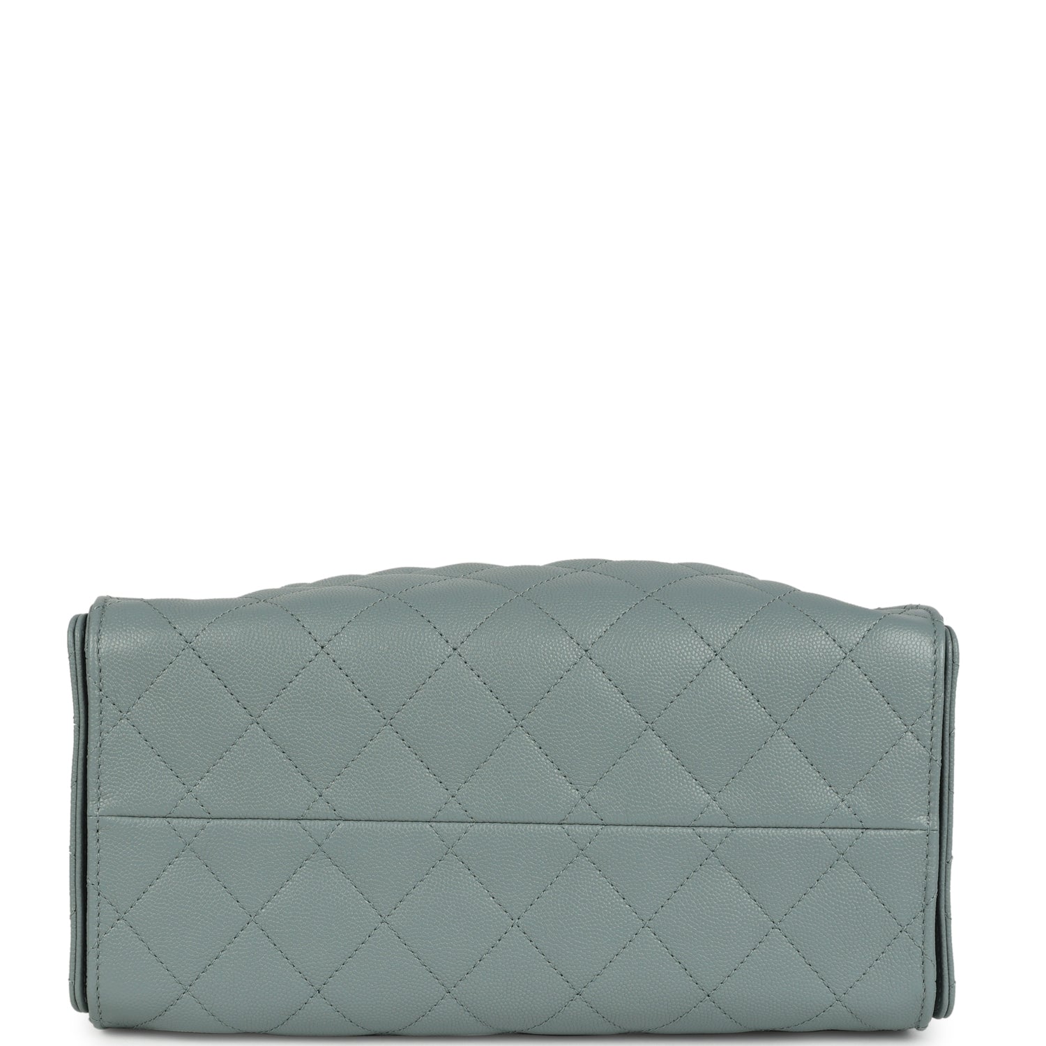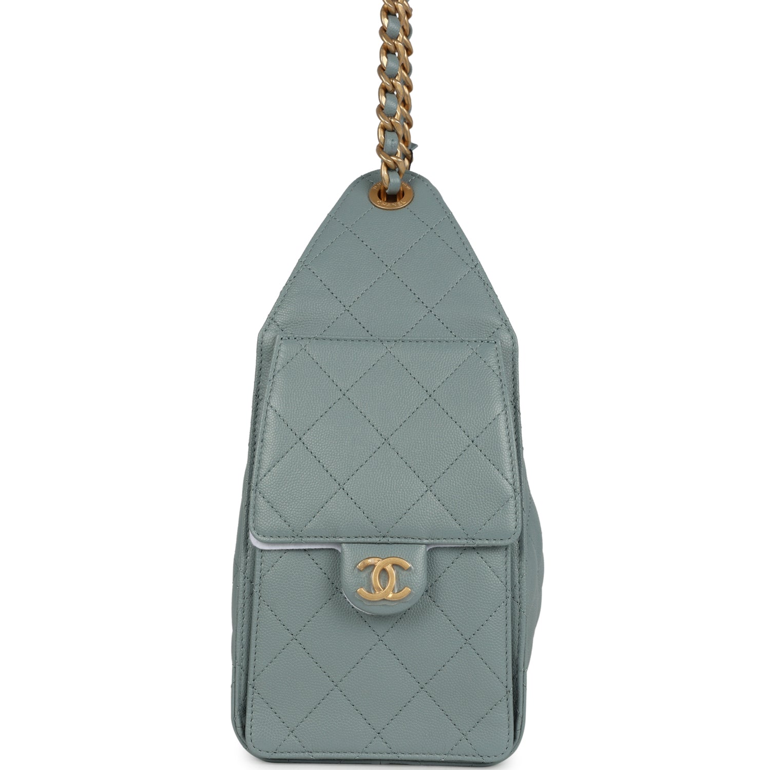 This Chanel Small 25 Hobo Bag is in green caviar leather with antique gold hardware. features signature diamond quilt. two exterior side pockets. drawstring closure. and a single interwoven antique gold and green leather shoulder strap.