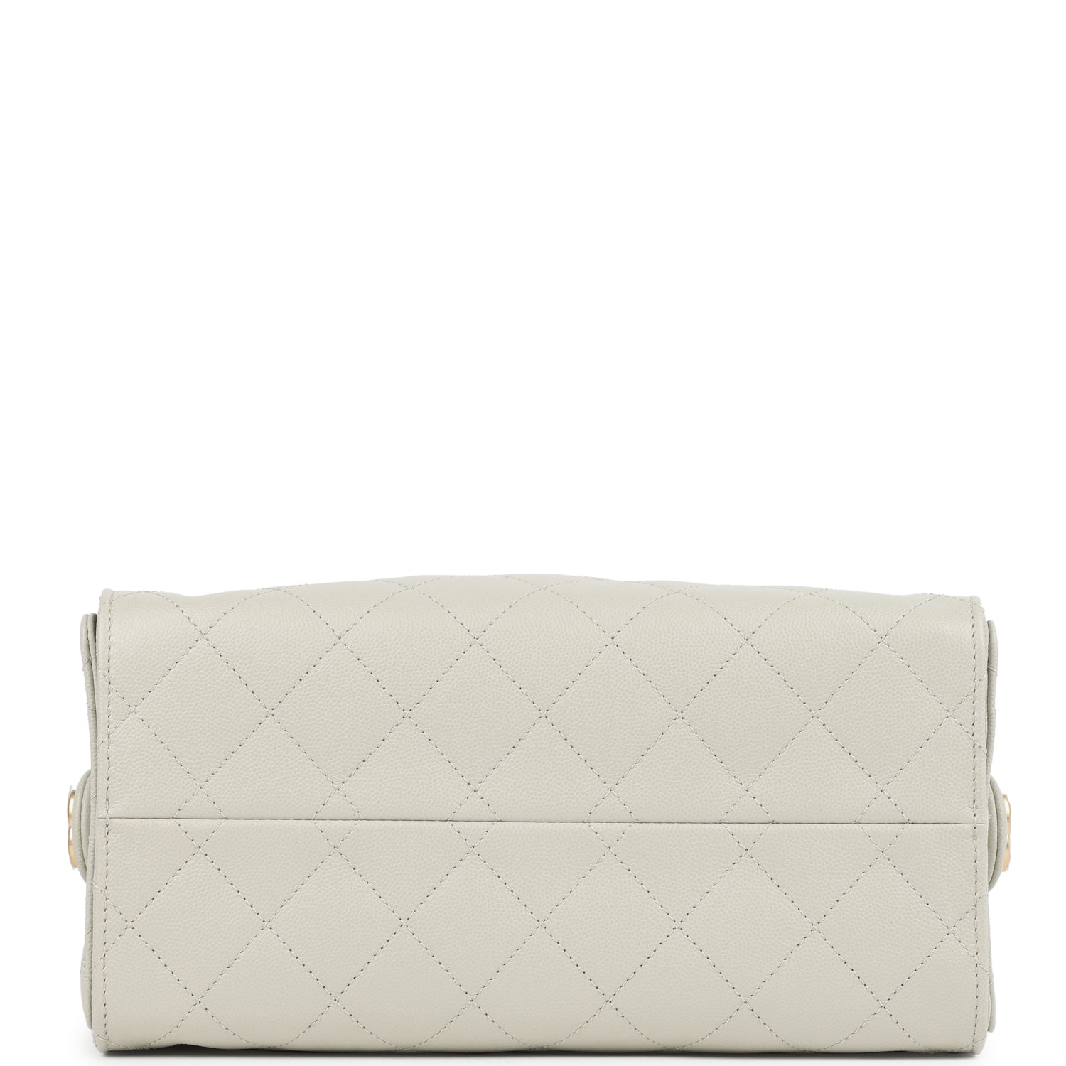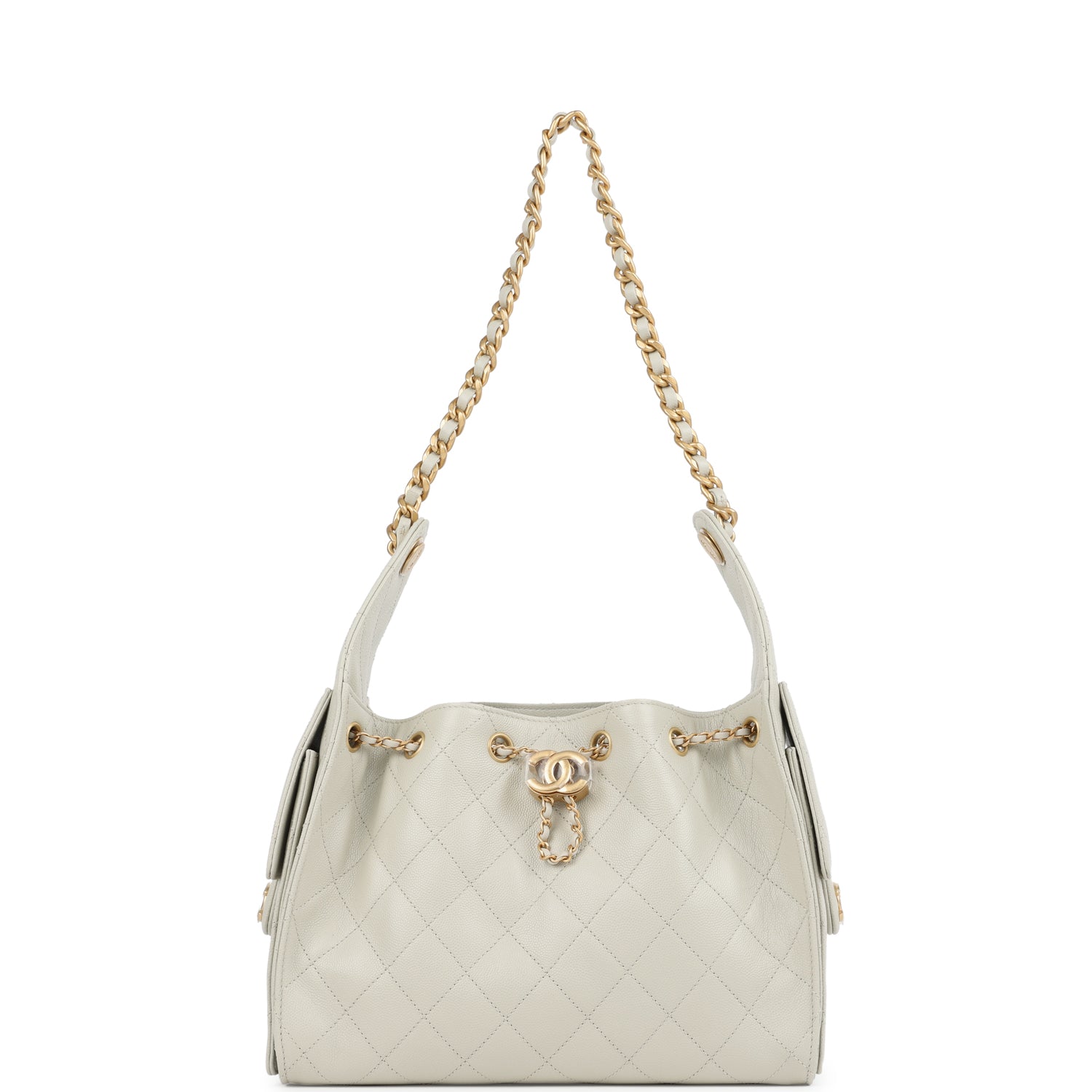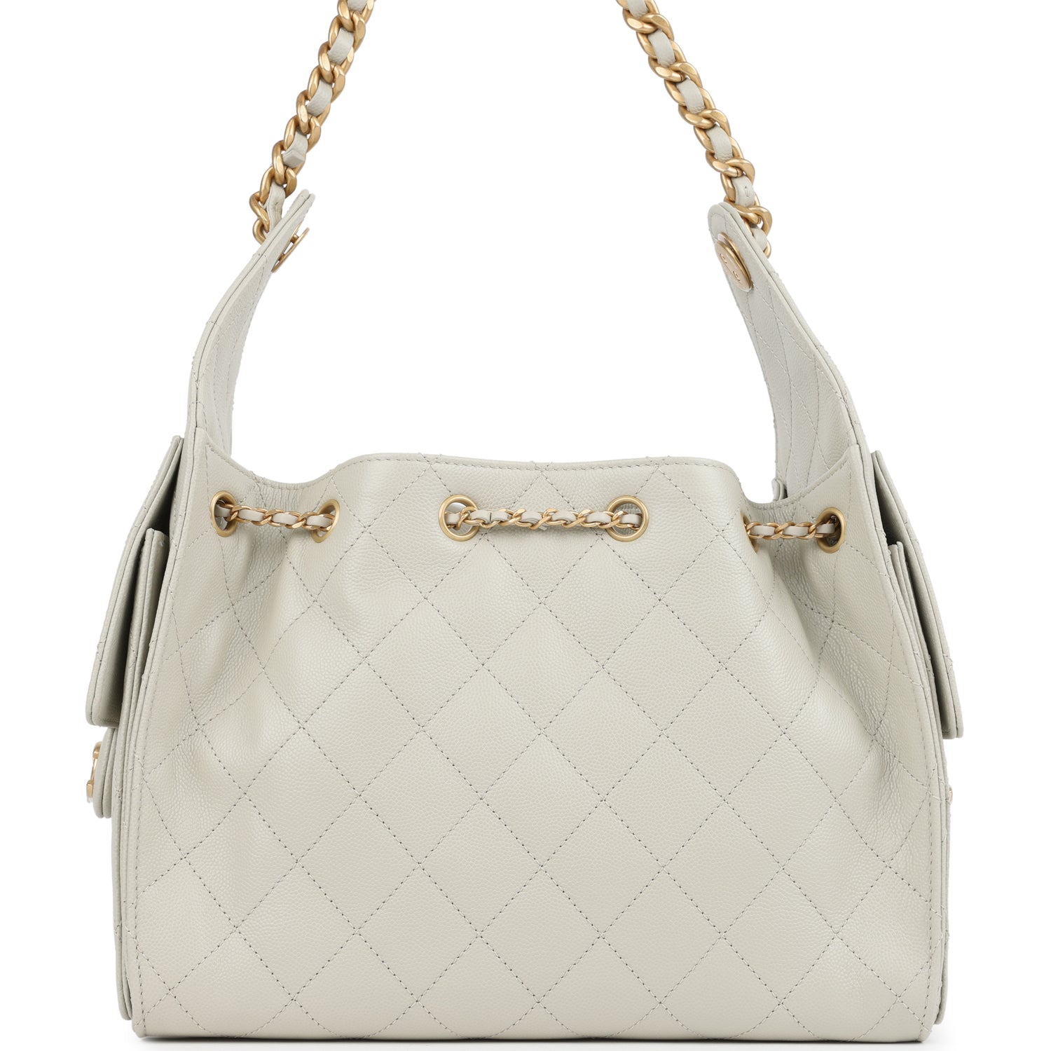 This Chanel Small 25 Hobo Bag is in light grey caviar leather with antique gold hardware. features signature diamond quilt. two exterior side pockets. drawstring closure. and a single interwoven Antique gold and light grey leather shoulder strap.
