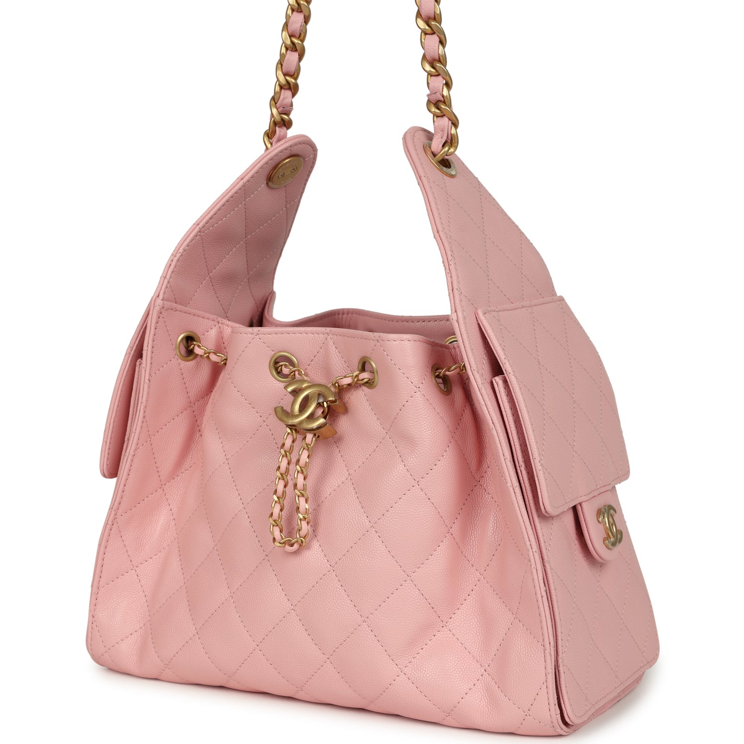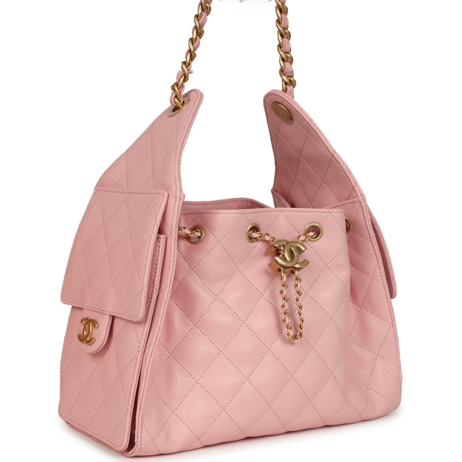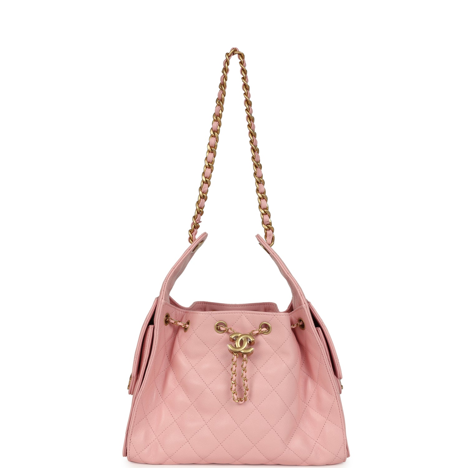This Chanel Small 25 Hobo Bag is in light pink caviar leather with antique gold hardware. features signature diamond quilt. two exterior side pockets. drawstring closure. and a single interwoven antique gold and light pink leather shoulder strap.