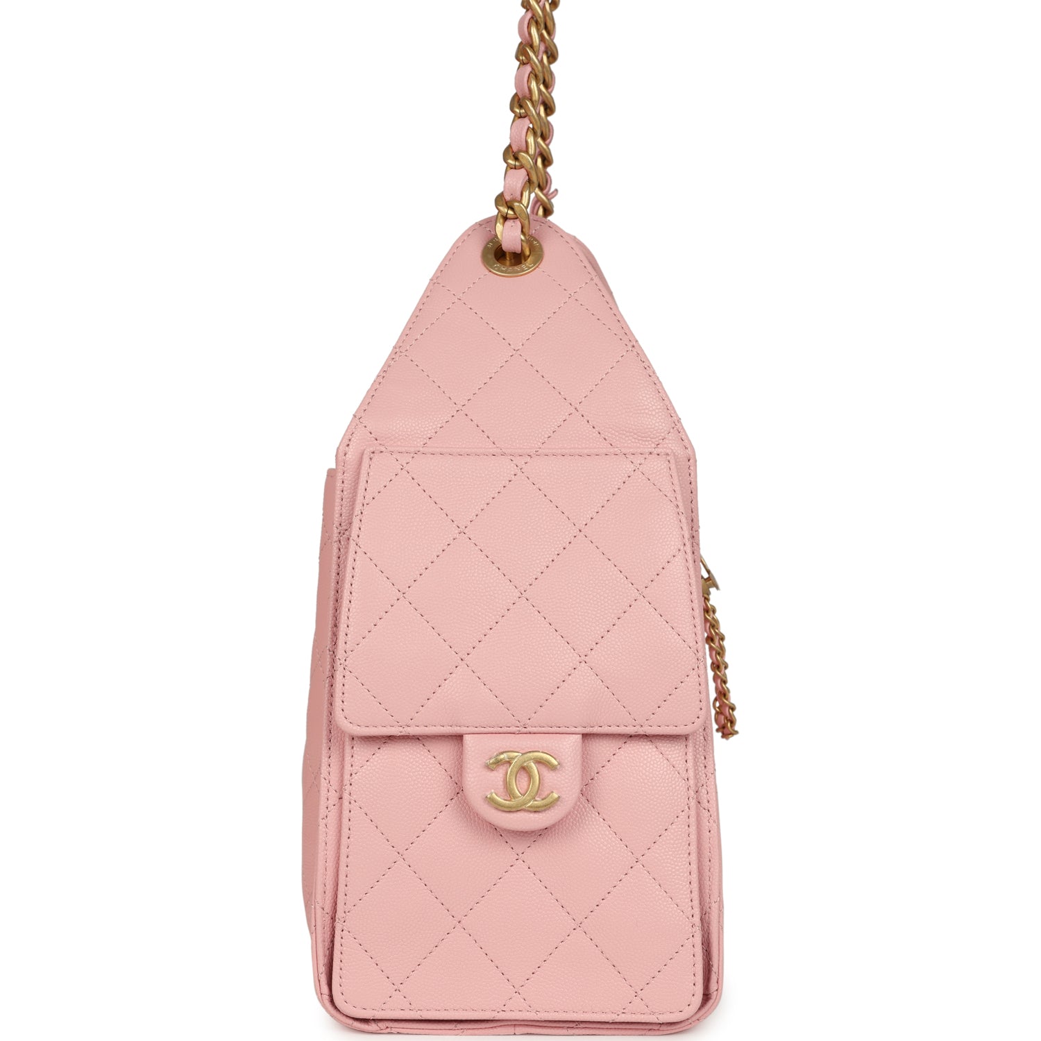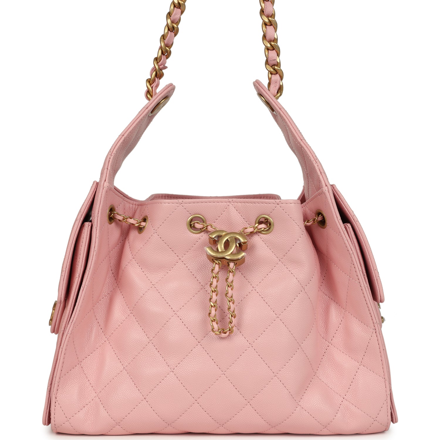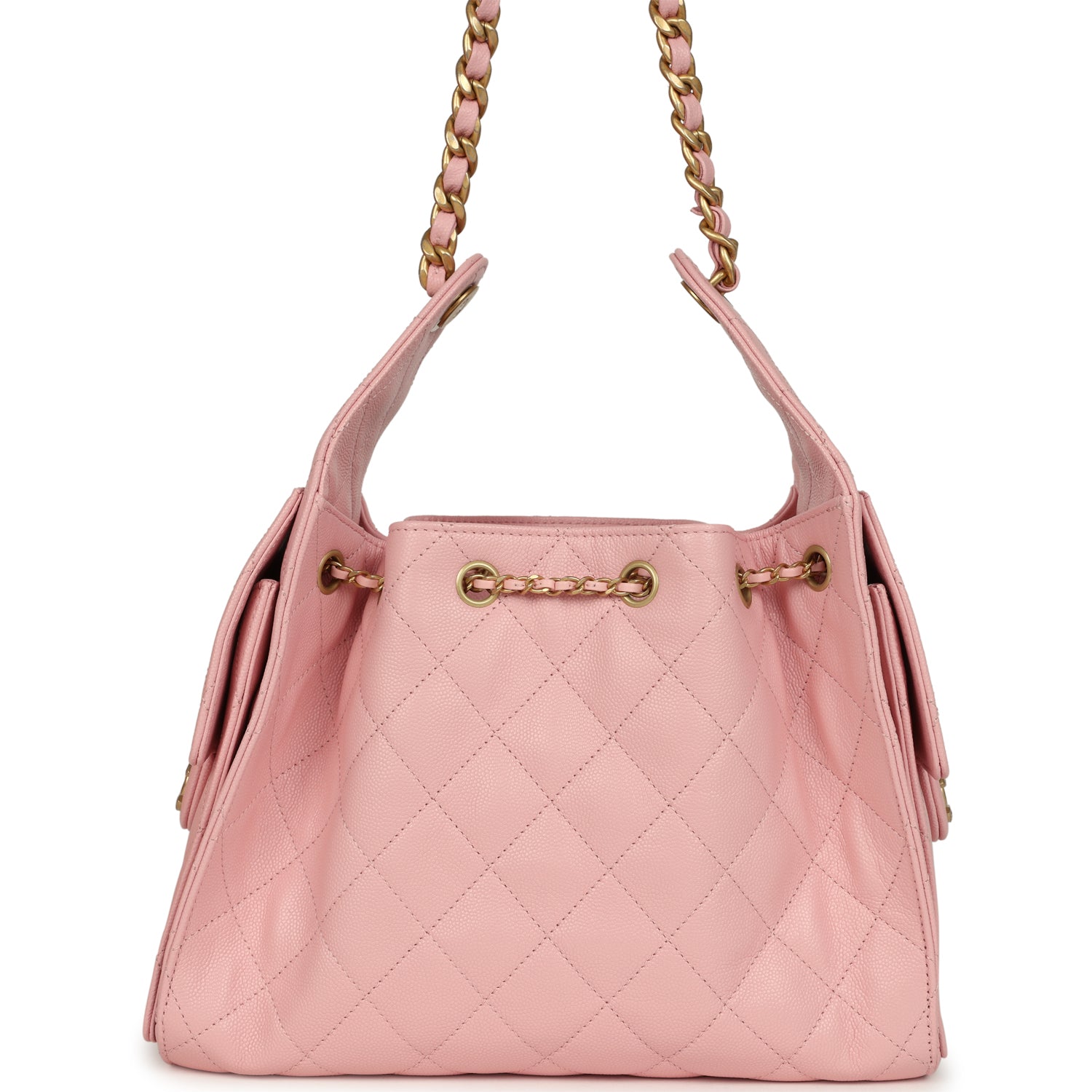 This Chanel Small 25 Hobo Bag is in light pink caviar leather with antique gold hardware. features signature diamond quilt. two exterior side pockets. drawstring closure. and a single interwoven antique gold and light pink leather shoulder strap.