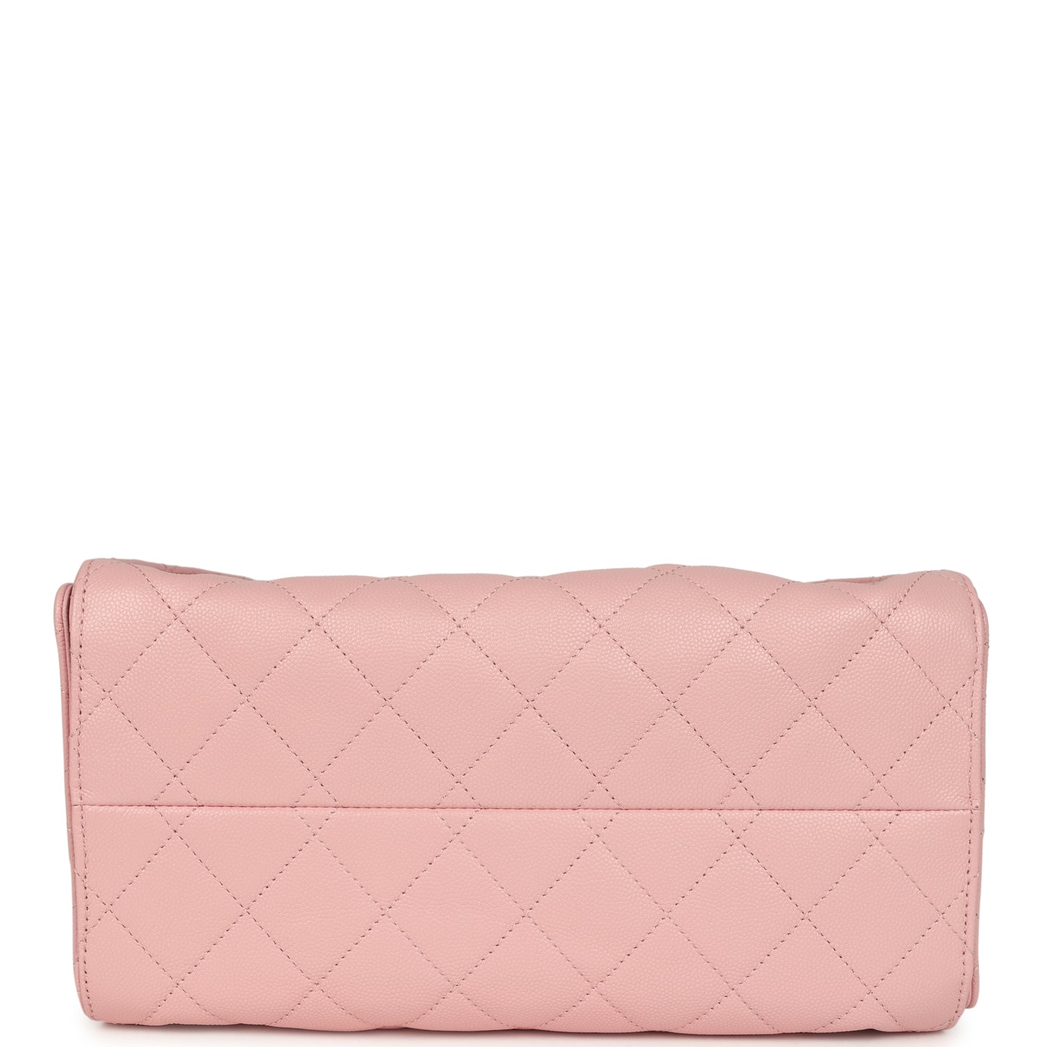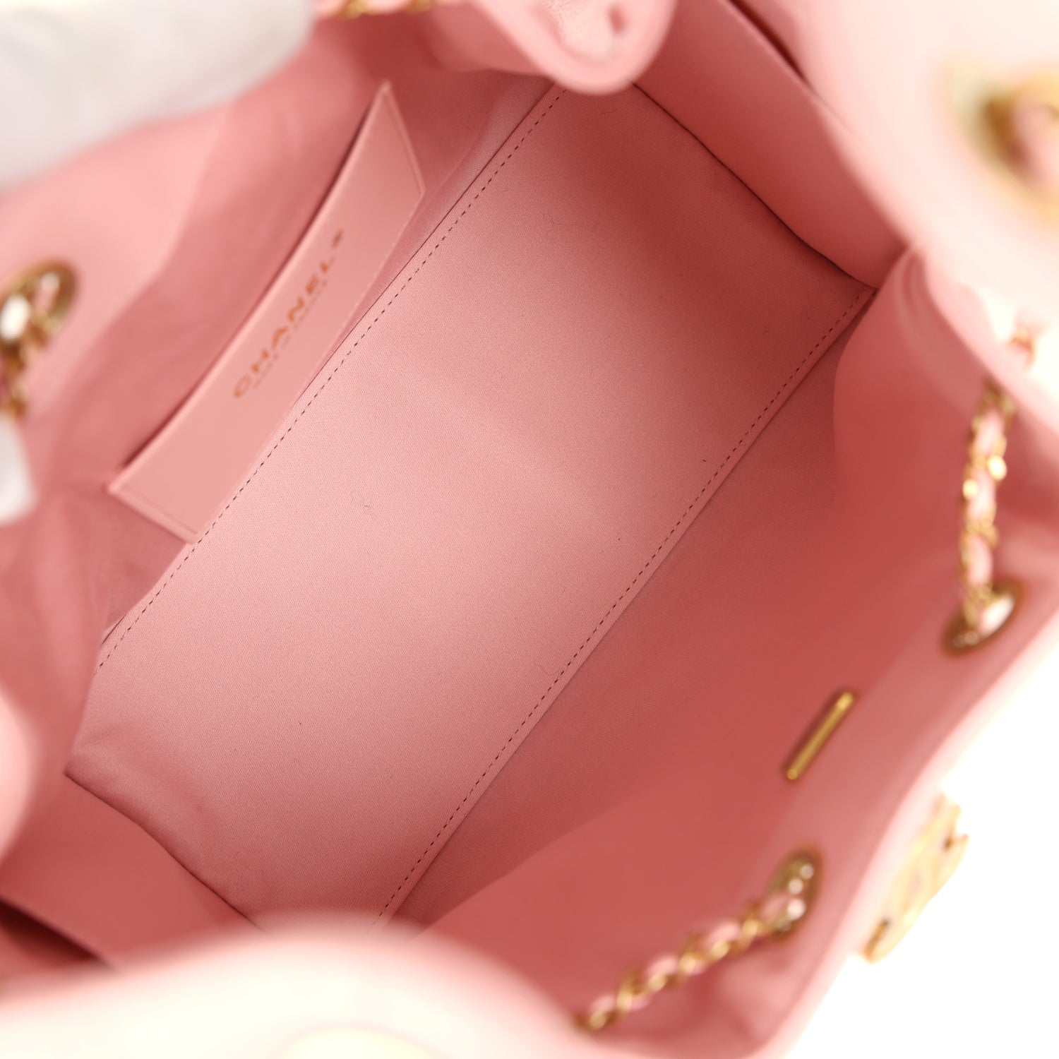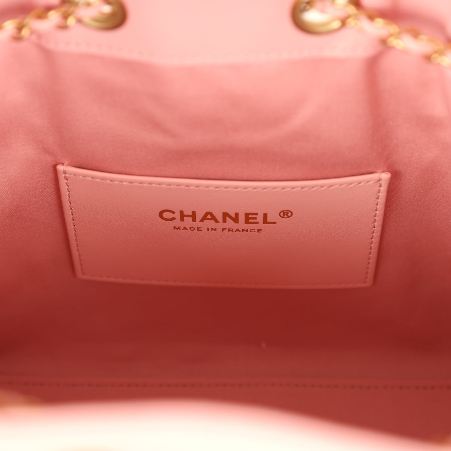 The interior is lined in light pink grossgrain fabric and has three small slit pockets; one on the rear wall and one slit pocket on each interior side.