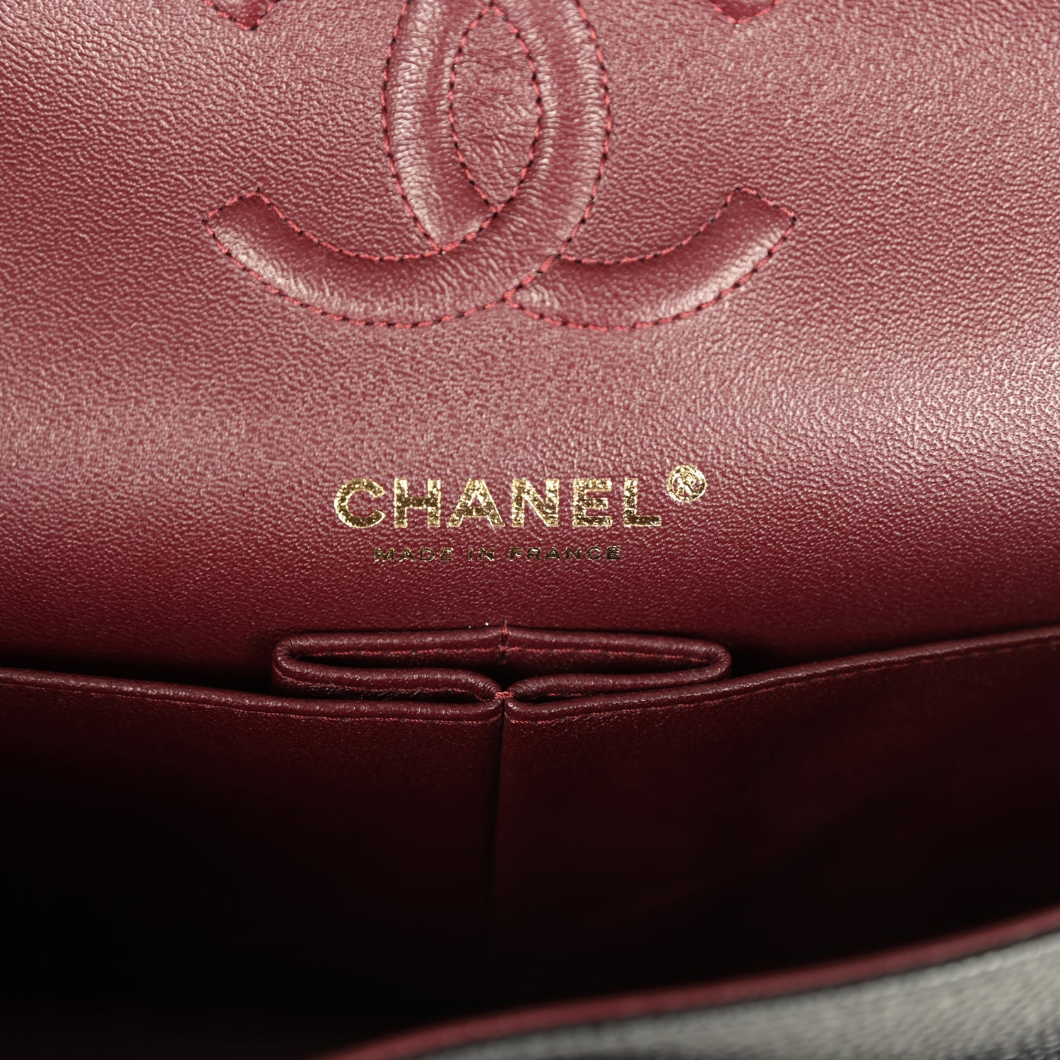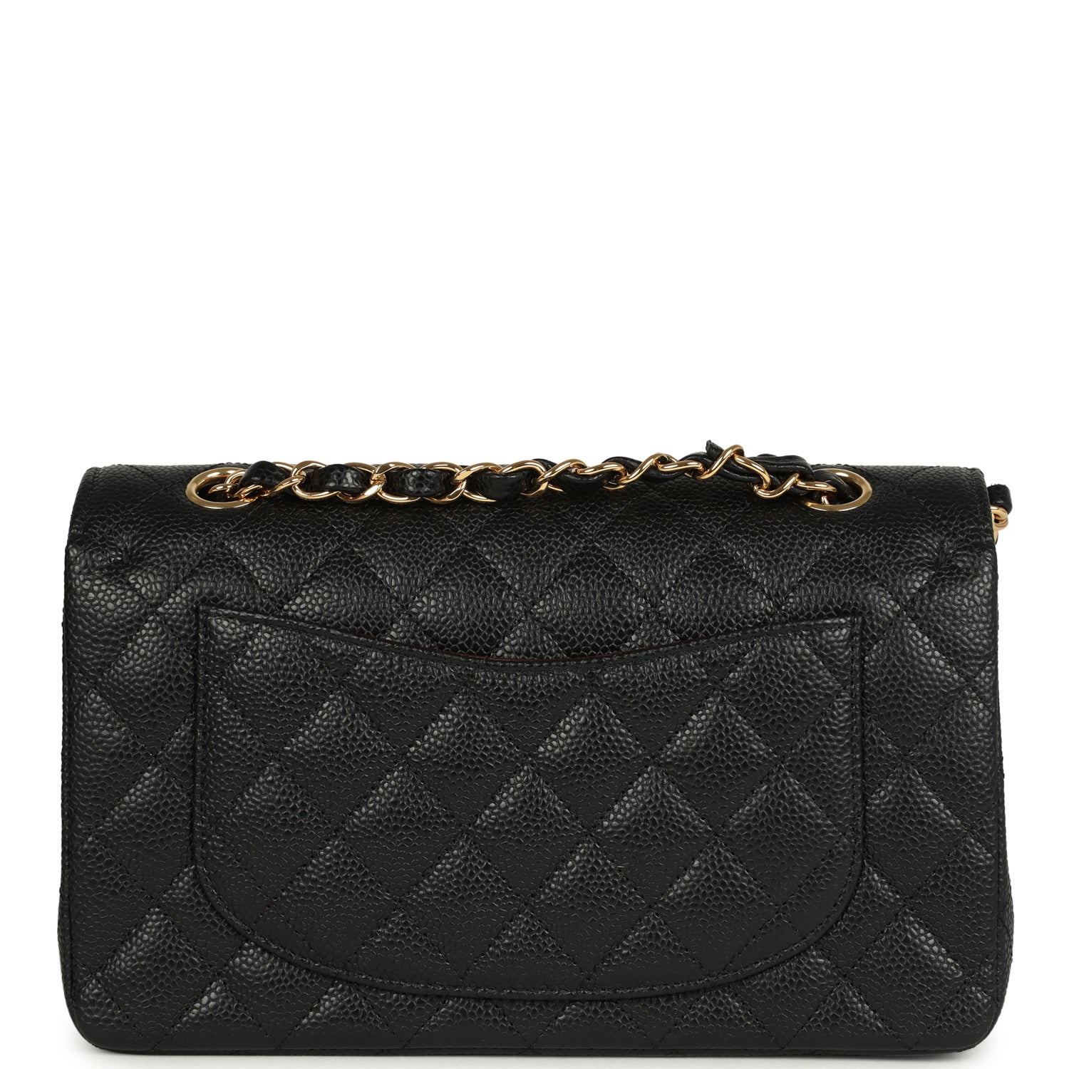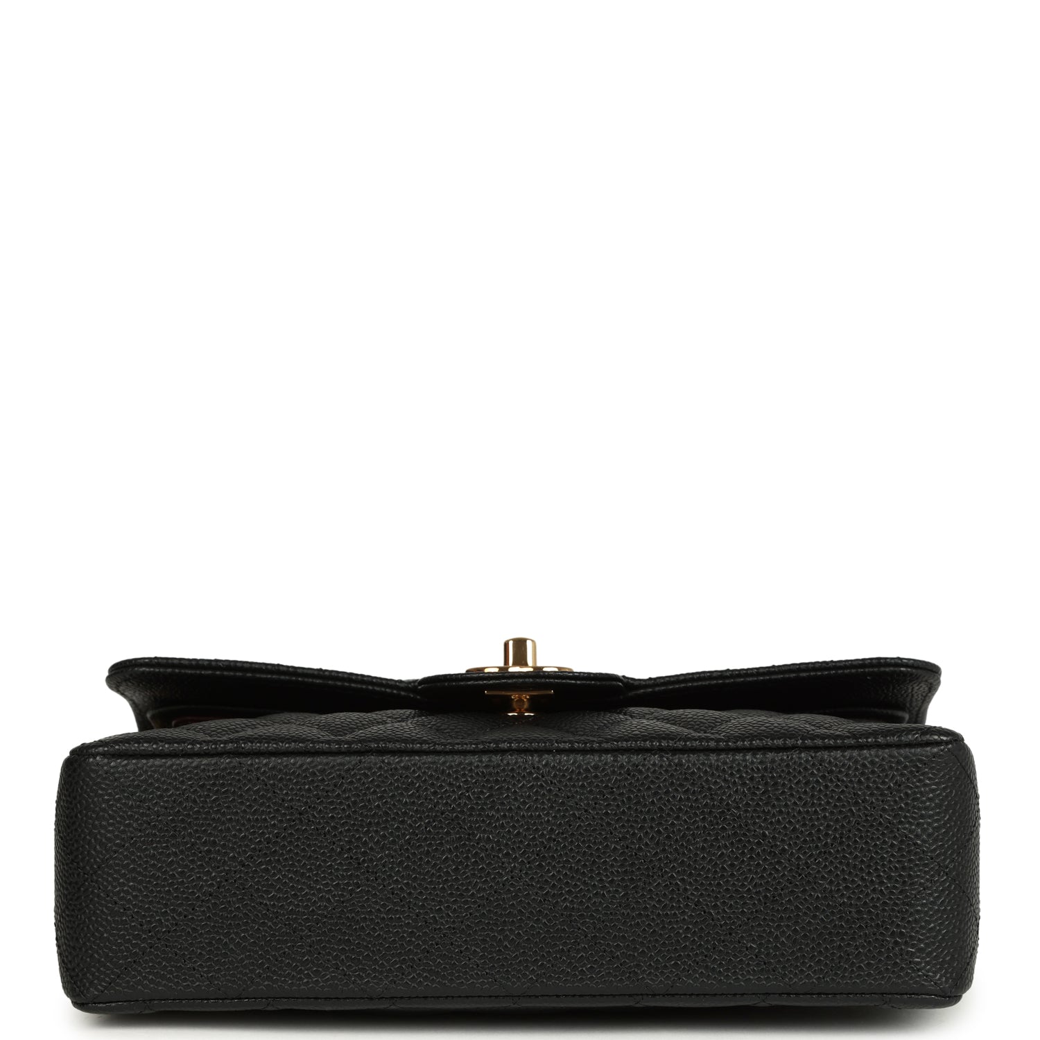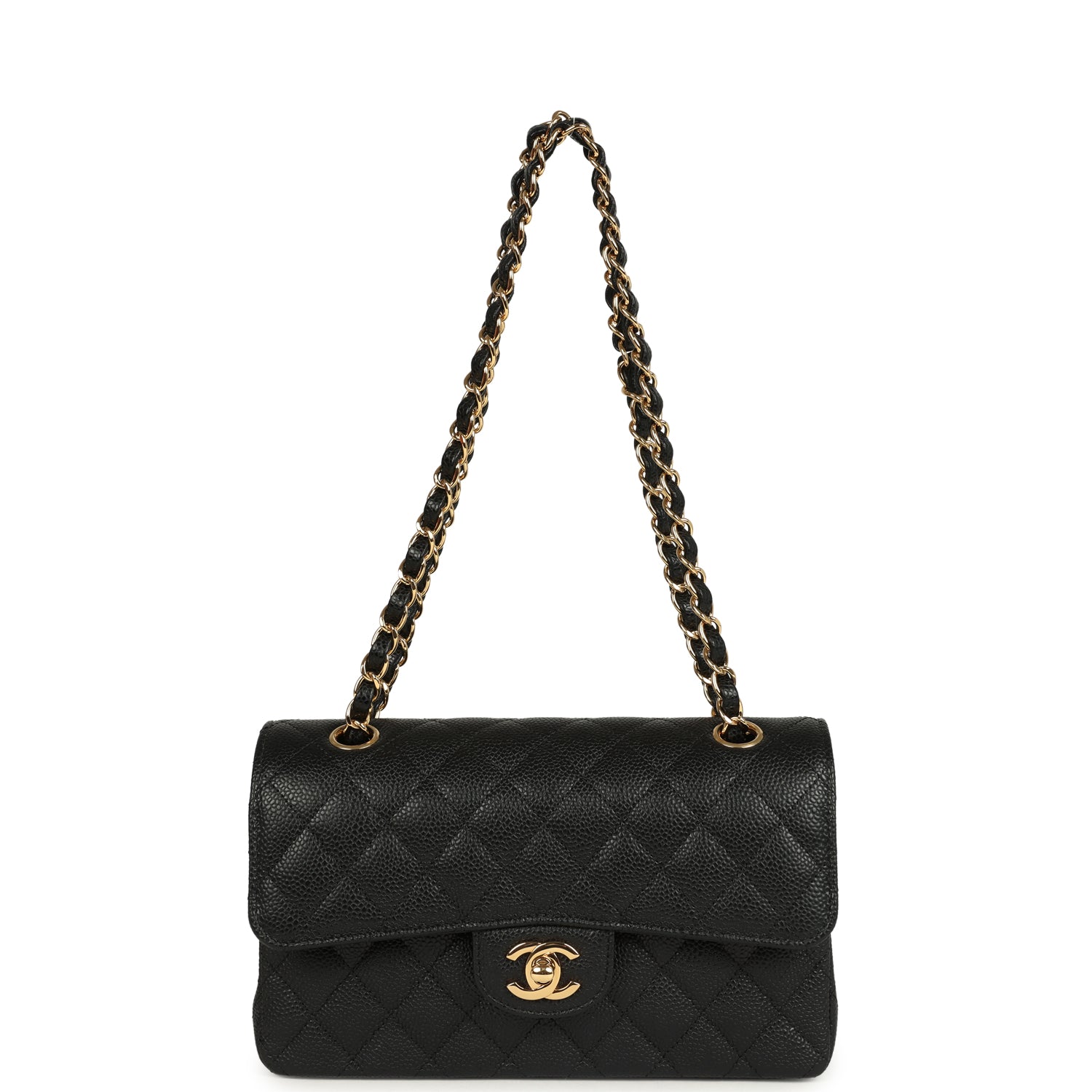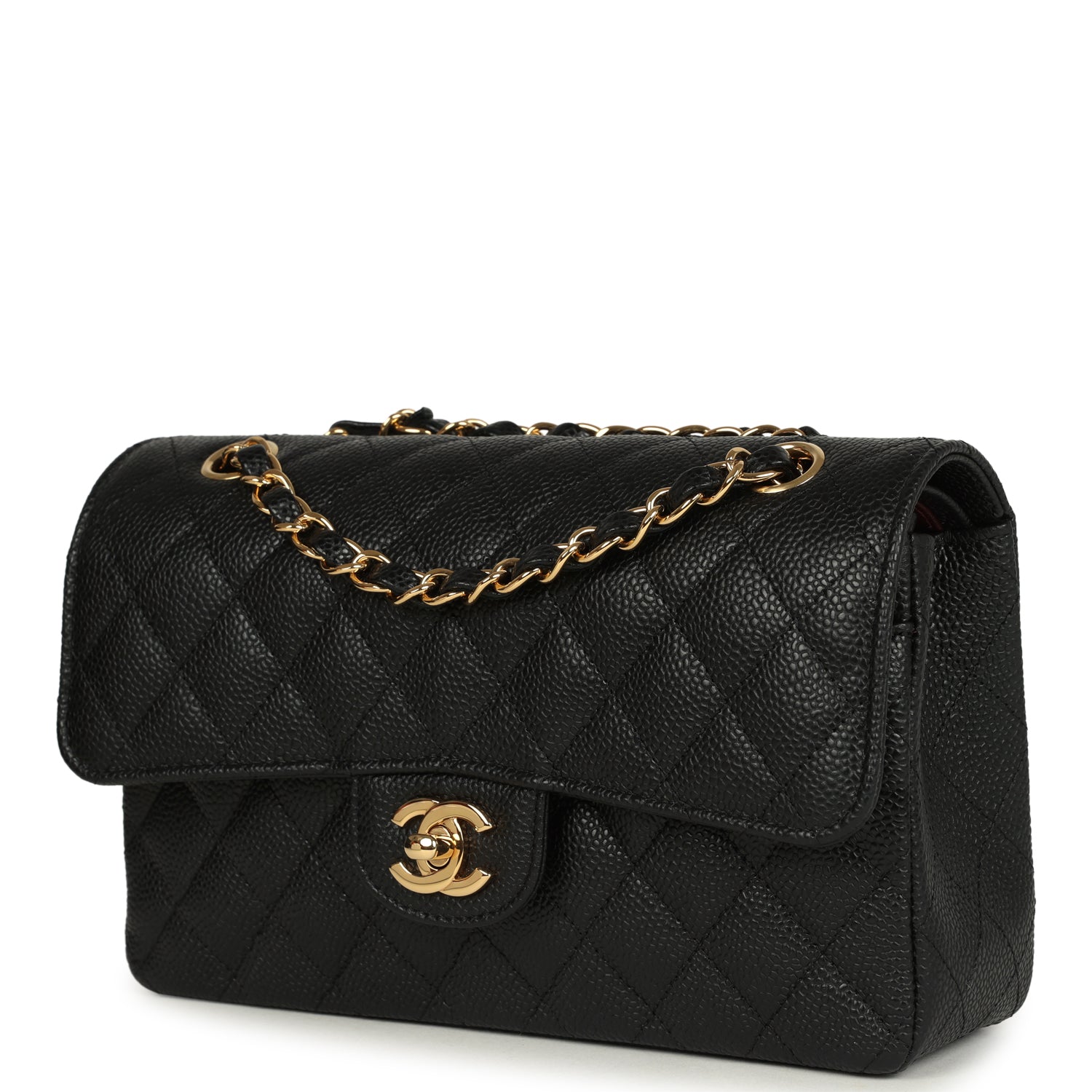 This Small Classic Double Flap Bag Black Caviar leather with gold tone hardware. tonal stitching. front flap with CC turnlock closure. half moon back pocket and adjustable interwoven chain link gold tone and black leather shoulder/crossbody strap.