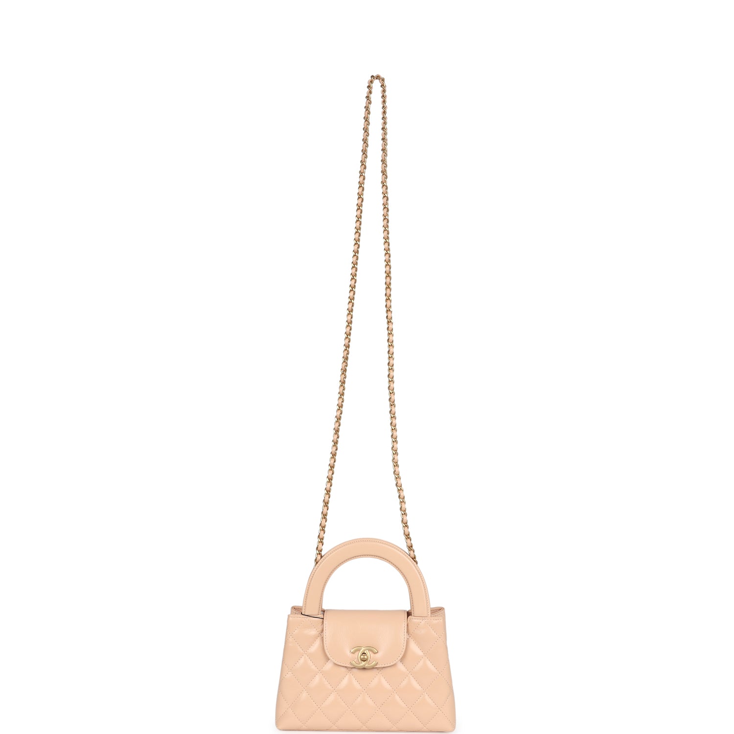 This small Kelly Shopper is in beige shiny aged calfskin with brushed gold hardware. tonal stitching. two flat back top handles. interwoven brushed gold and a White leather shoulder strap. and the signature CC turnlock closure.