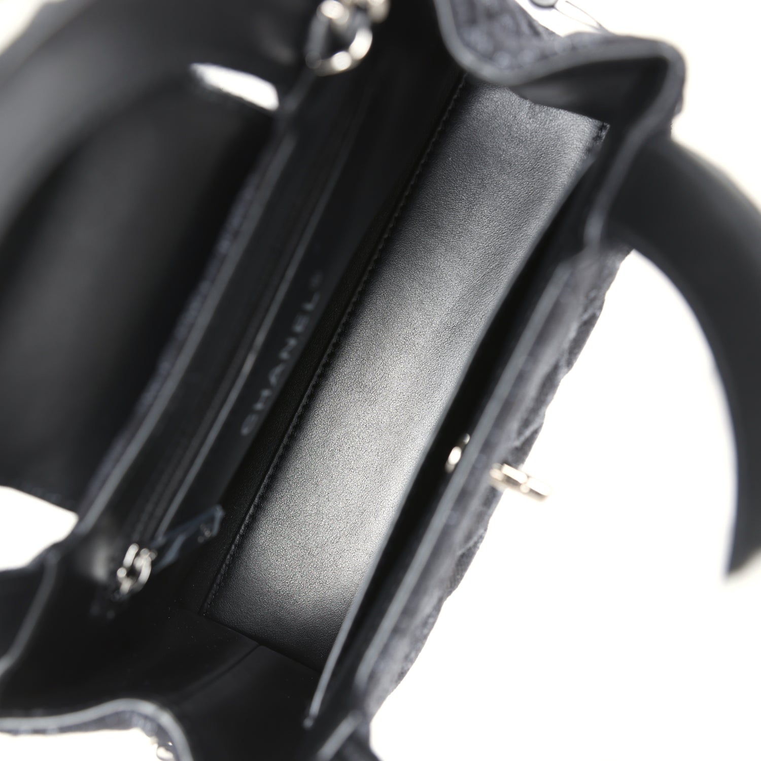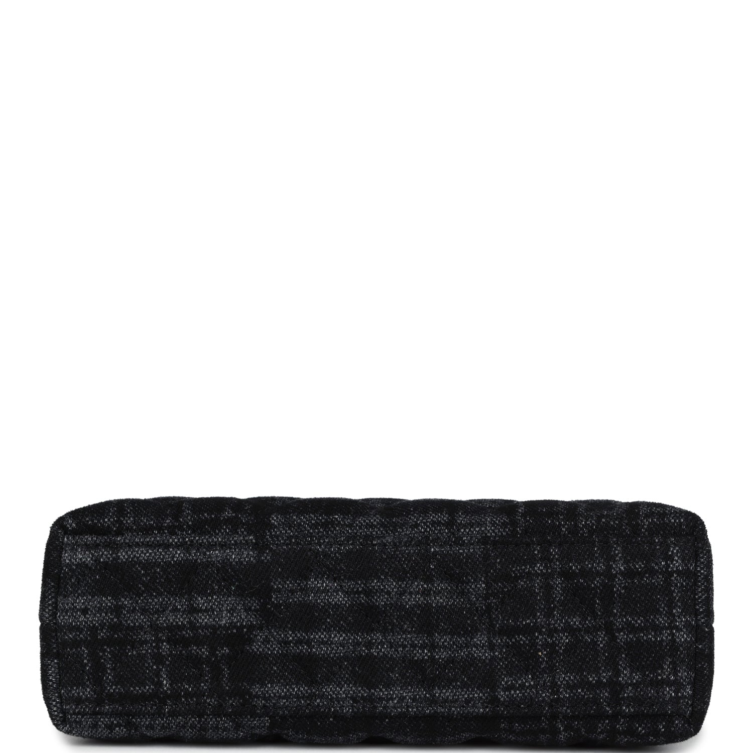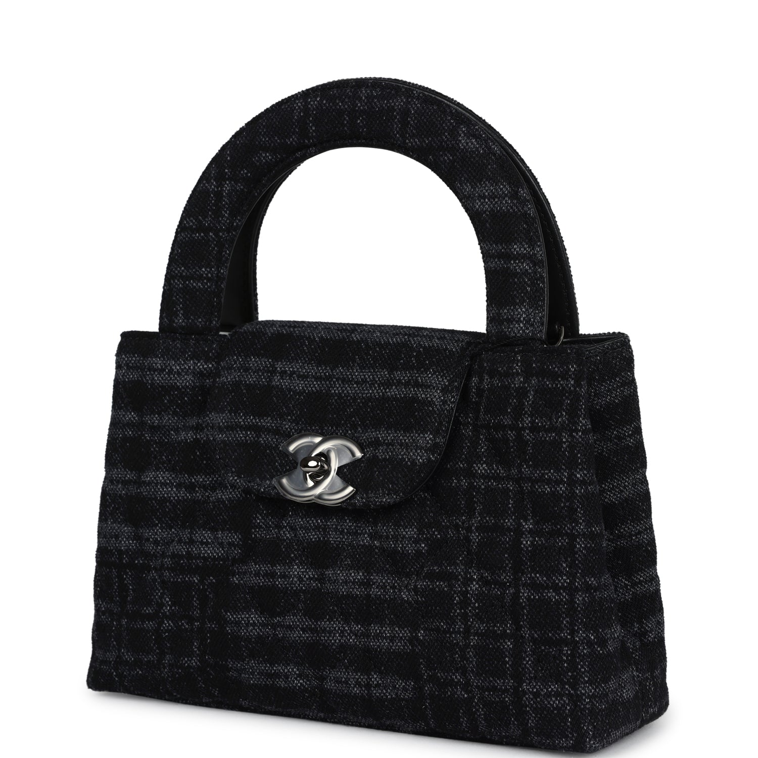 This Chanel Small Kelly is in dark grey and black plaid canvas with ruthenium hardware. tonal stitching. two flat back top handles and a chain strap interwoven with leather. tab flap with CC turn-lock acts as a closure. zip pocket against back wall. slit pocket against front wall.