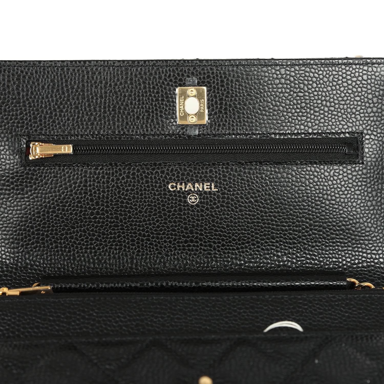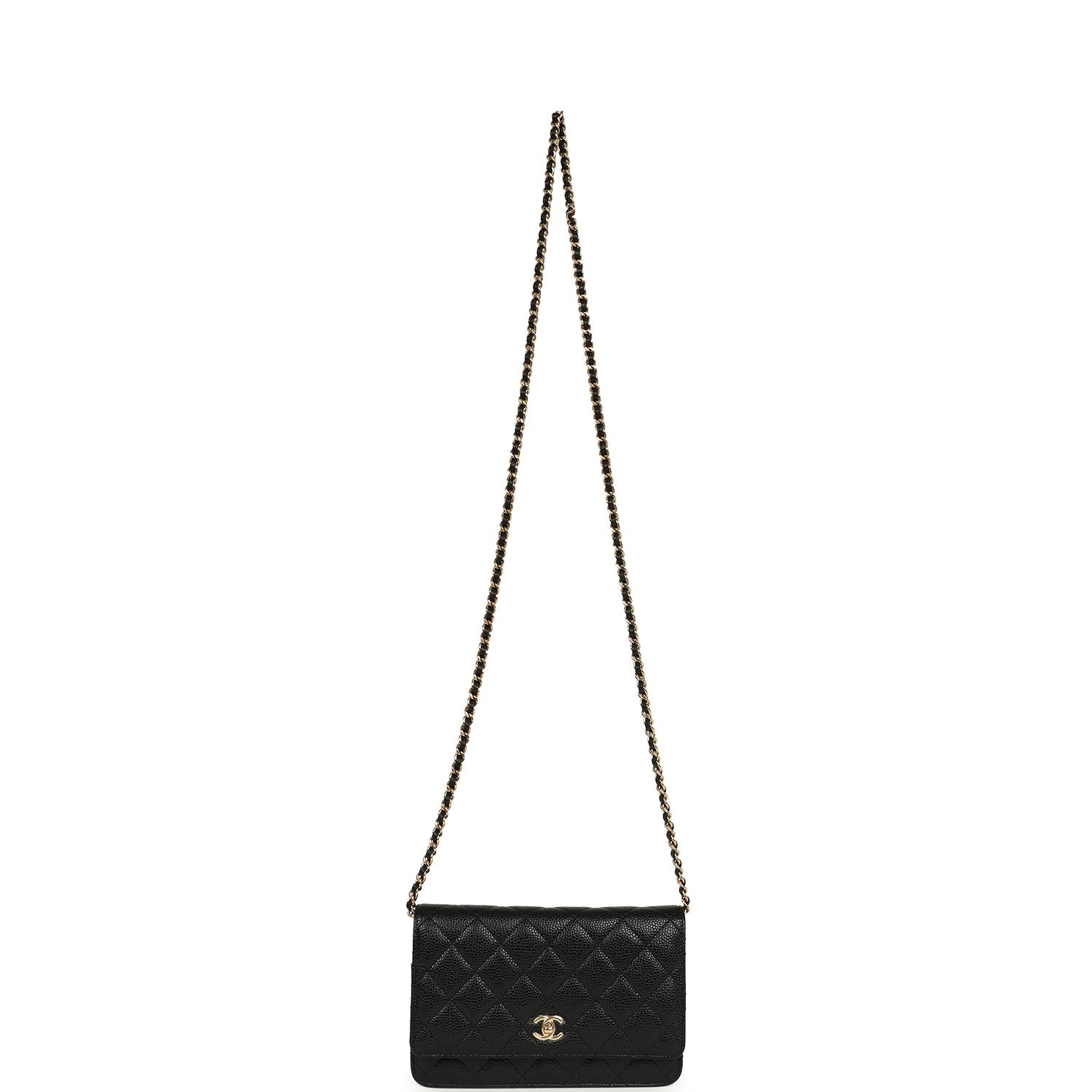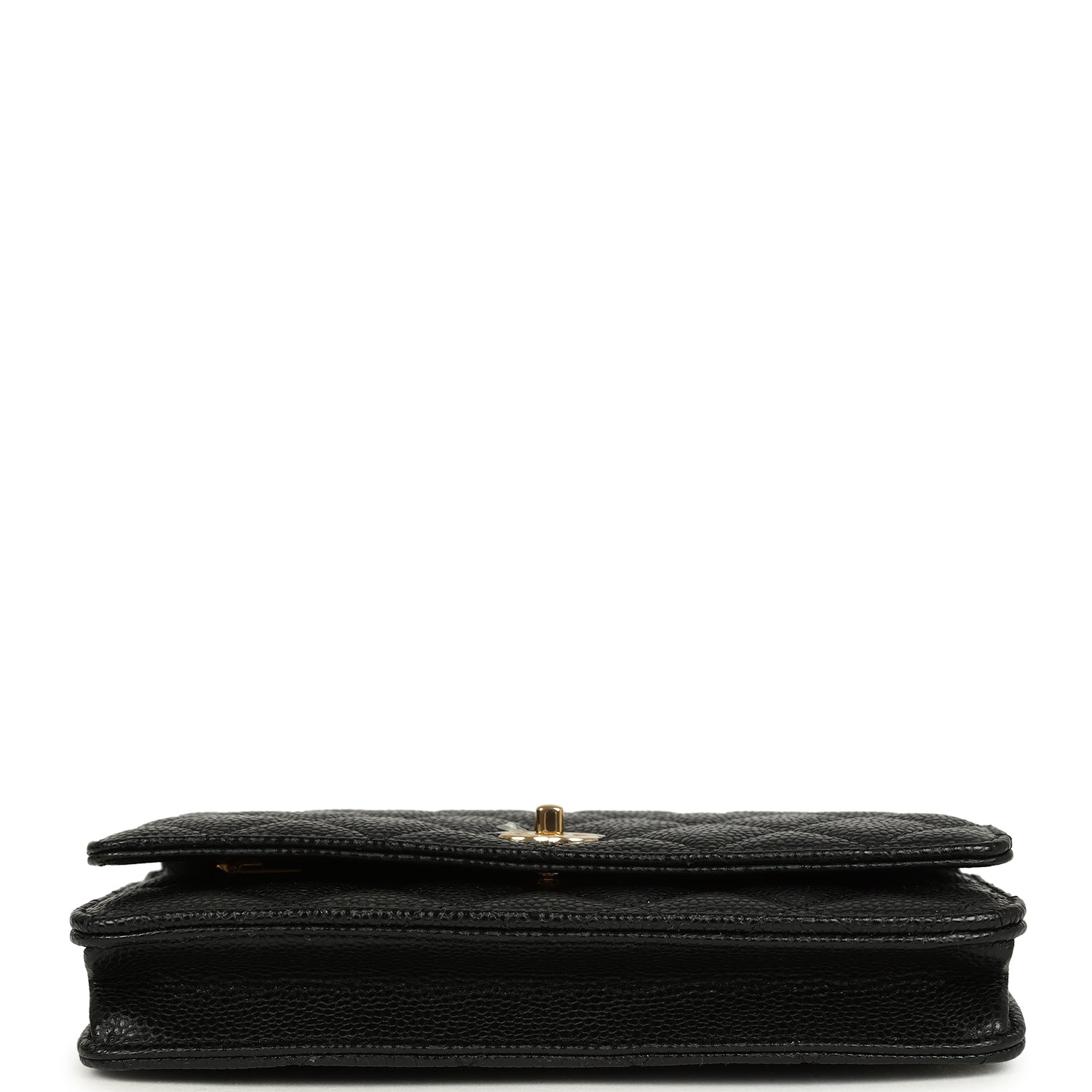 This Chanel Classic Wallet on Chain is in black caviar leather with gold tone hardware and has a front flap with CC turnlock closure. half moon back pocket. and a gold tone metal and black leather interwoven chain link shoulder/crossbody strap.