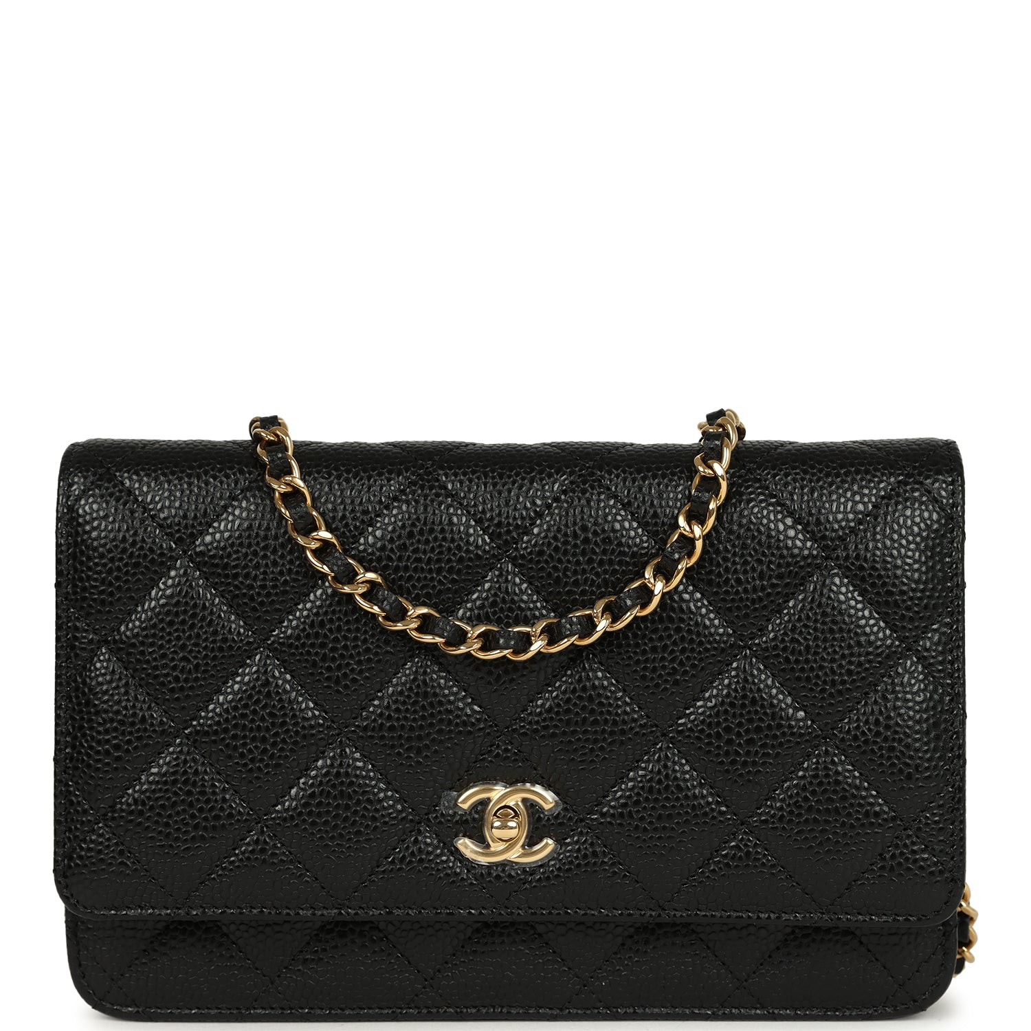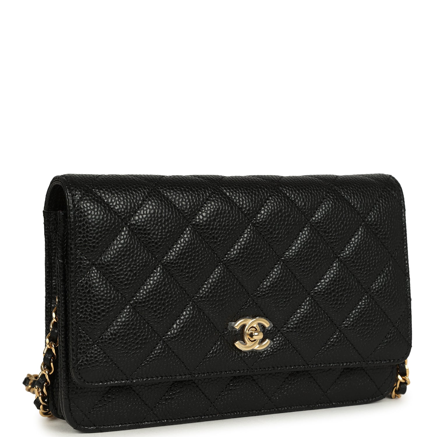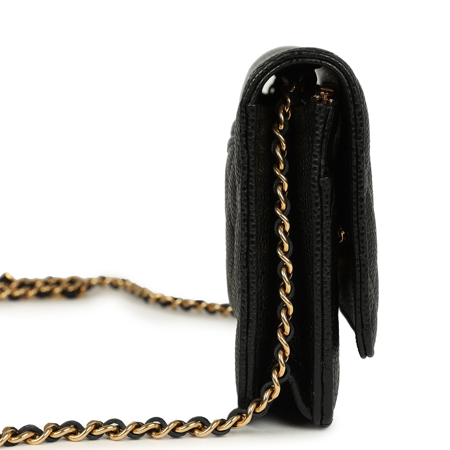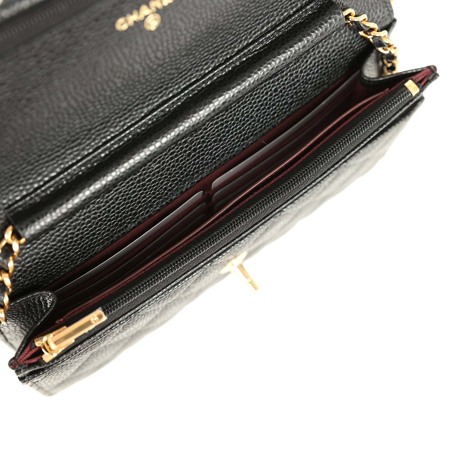 This Chanel Classic Wallet on Chain is in black caviar leather with gold tone hardware and has a front flap with CC turnlock closure. half moon back pocket. and a gold tone metal and black leather interwoven chain link shoulder/crossbody strap.