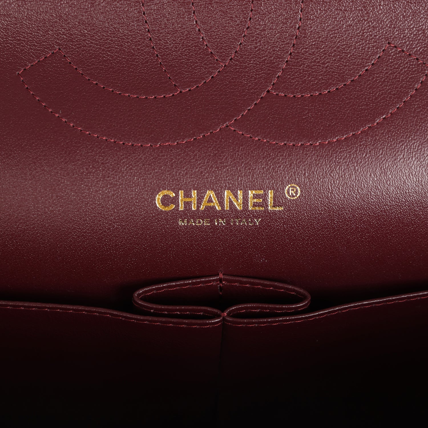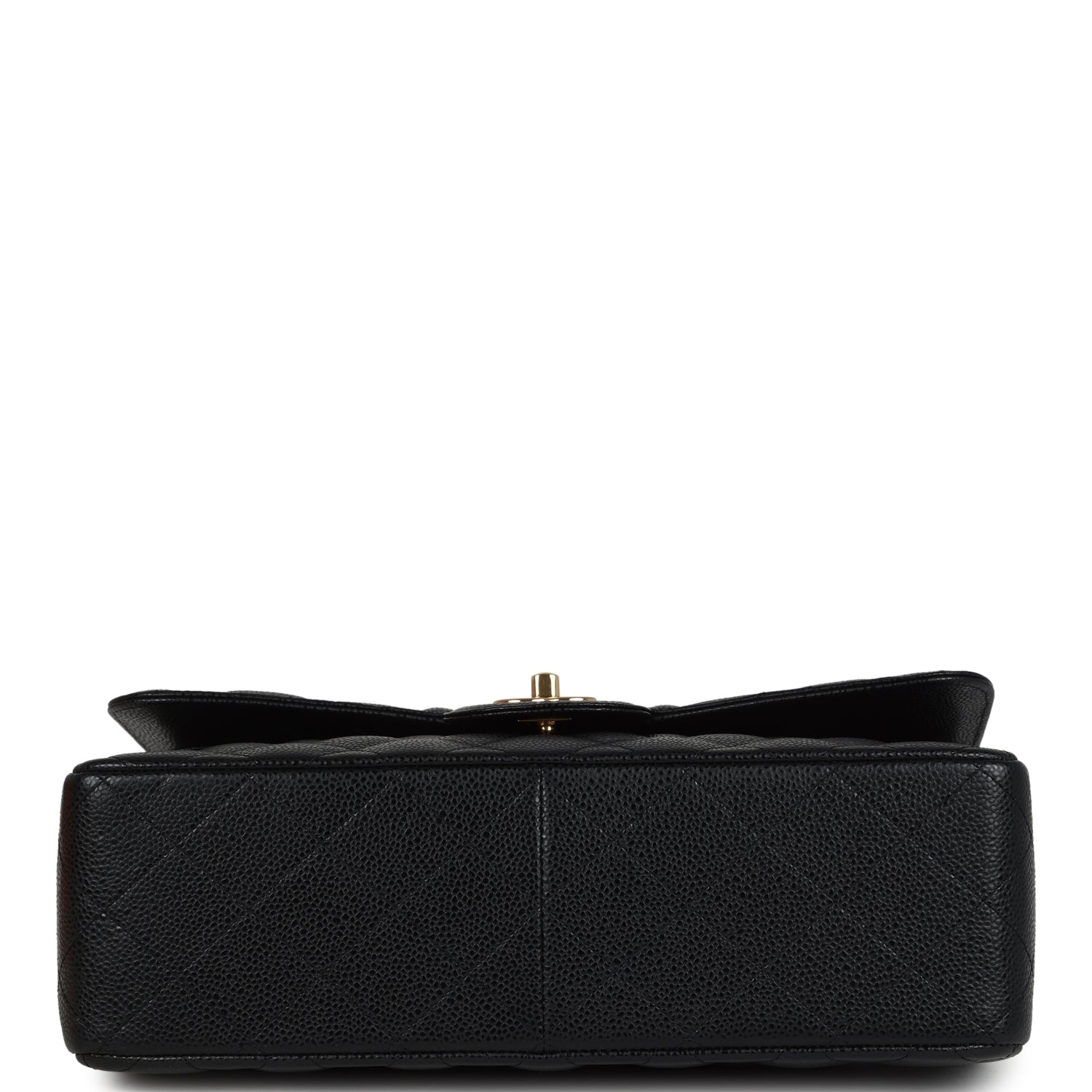 This Jumbo Classic Double Flap bag is in vlack caviar leather with gold tone hardware and features a front flap with signature CC turnlock closure. half moon back pocket. and adjustable interwoven gold tone chainlink and black leather shoulder strap.