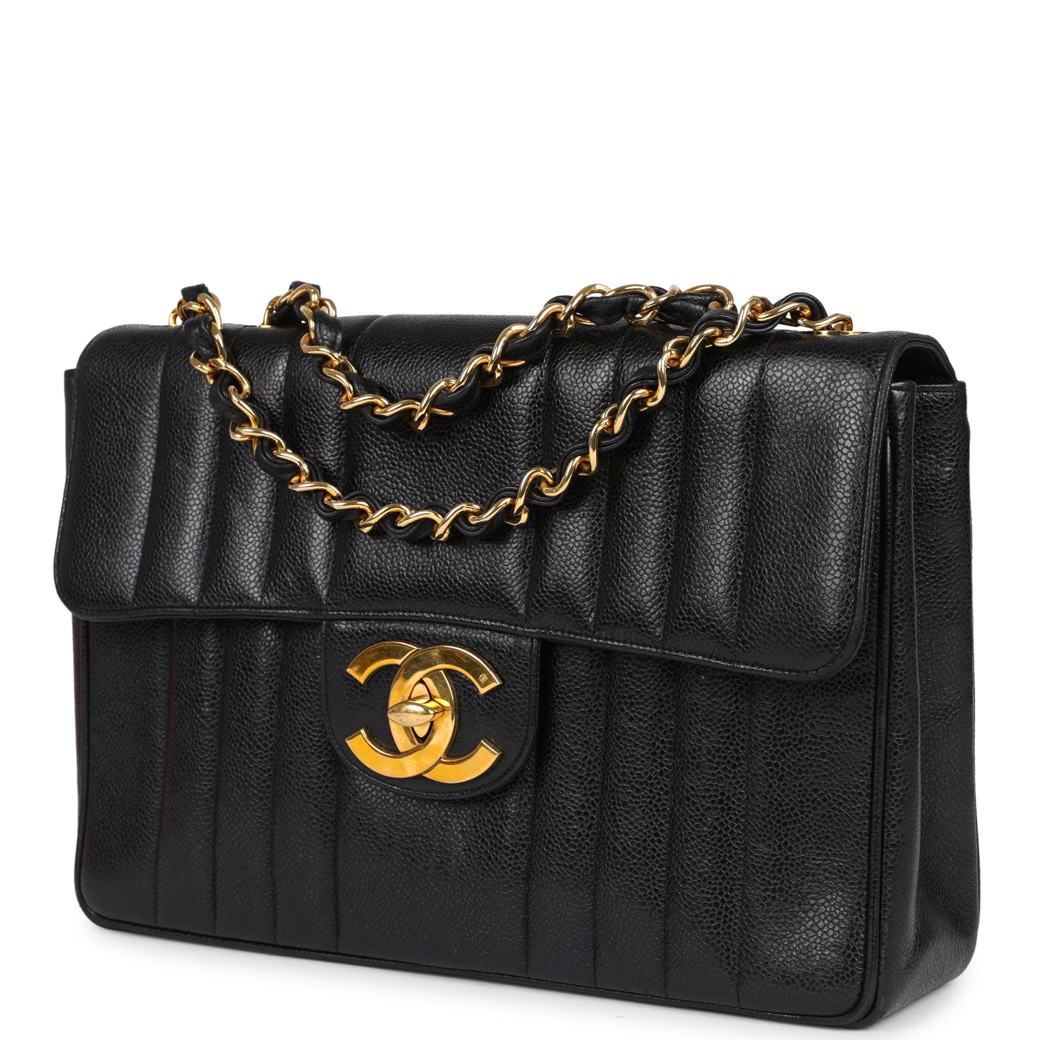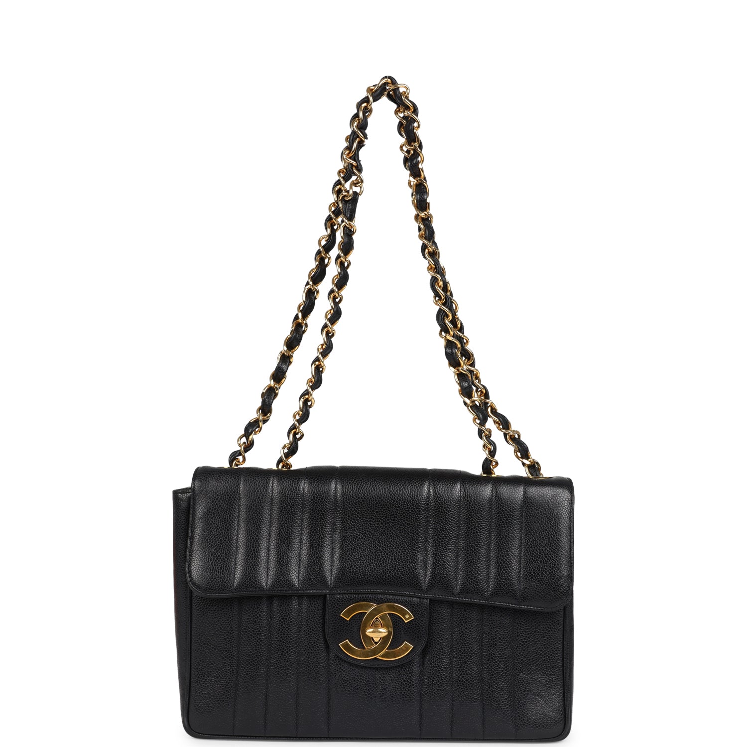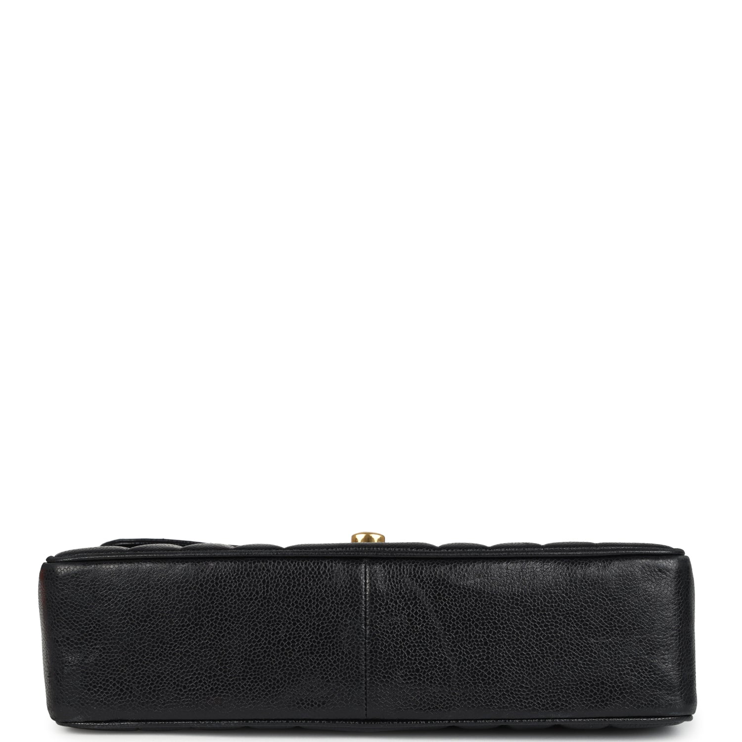 This Vintage Chanel Mademoiselle vertical flap bag is in black caviar leather with gold hardware. a front flap with a signature oversized CC interlocking closure. a back exterior pocket. and an interwoven gold plated chain link and black leather shoulder/crossbody strap.