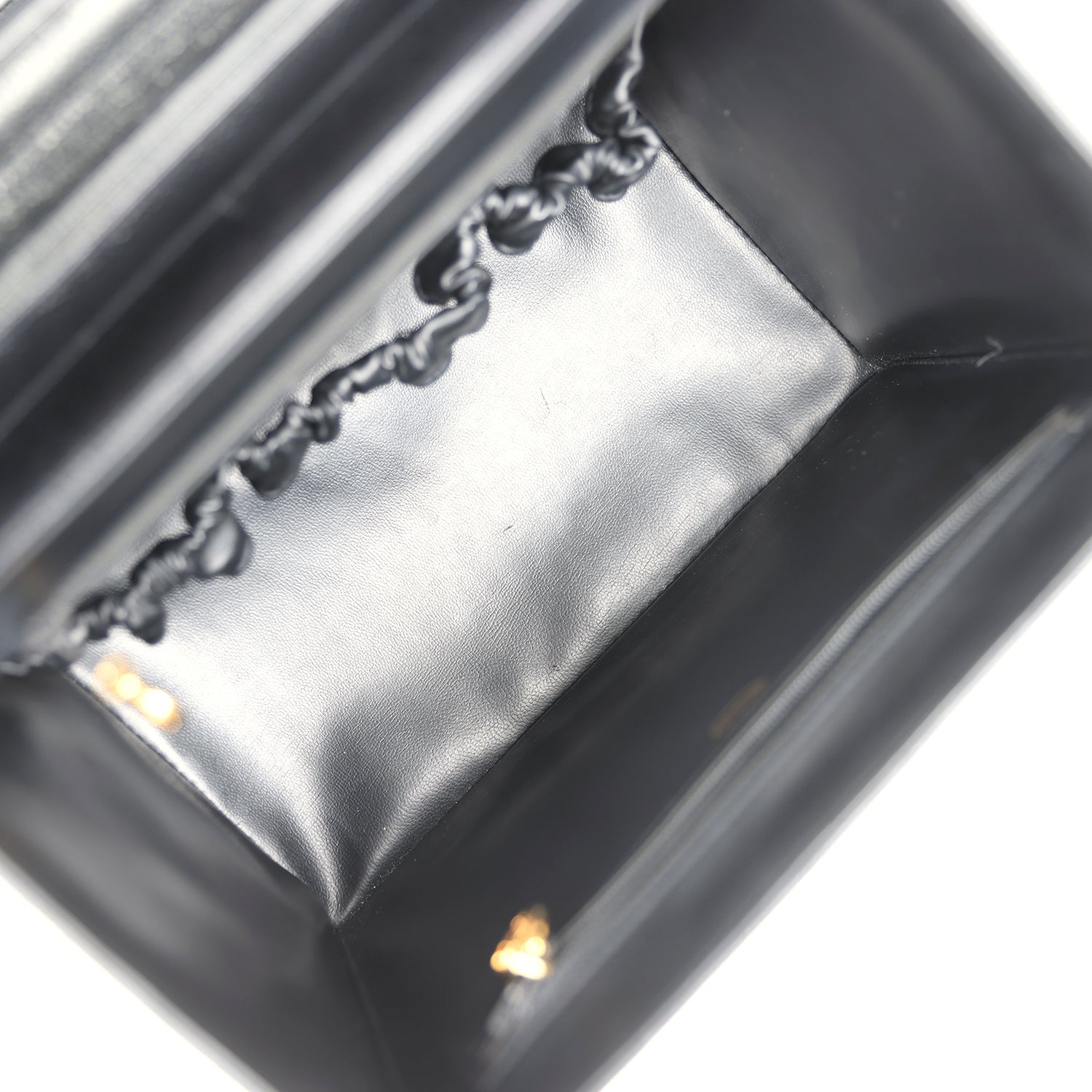 This vintage Large Box Vanity Bag is in black caviar leather with gold hardware. featuring a signature tab CC turnlock closure. a leather hinge top lid with a built-in mirror. and a leather top handle.