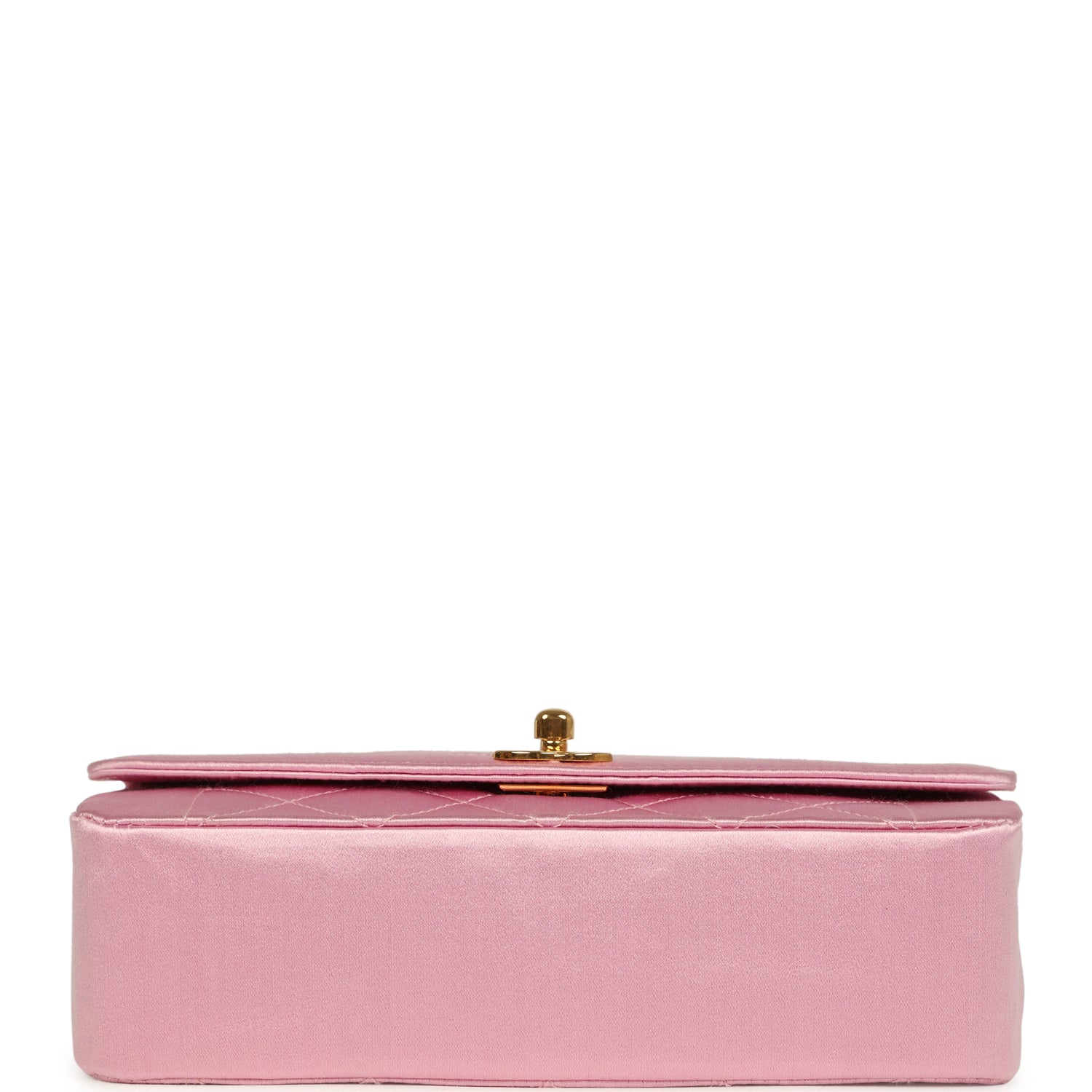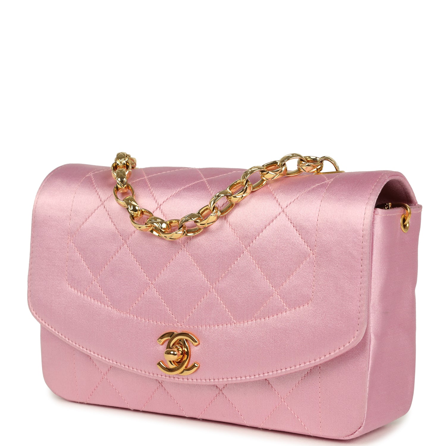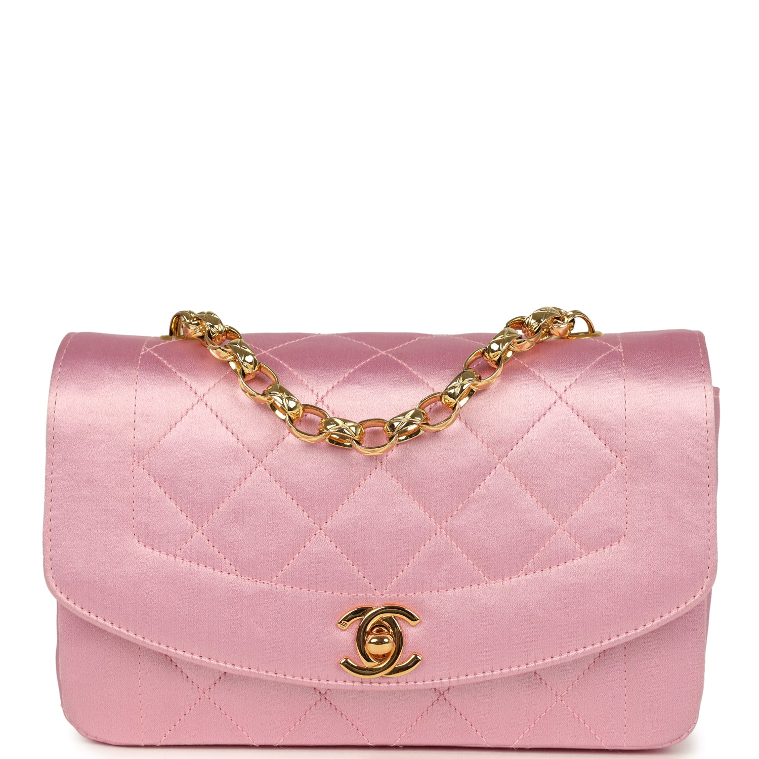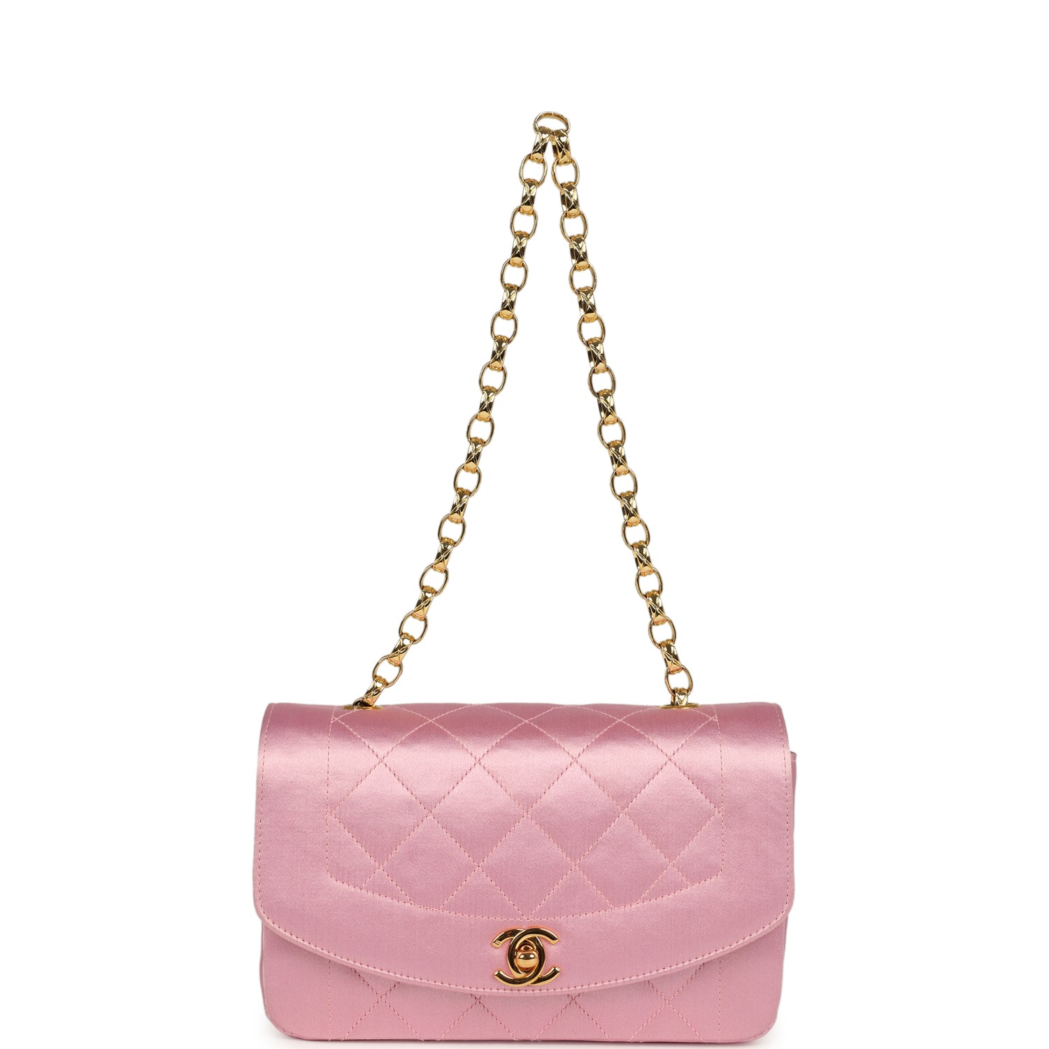 This vintage Mini Diana flap bag is in pink satin with gold plated hardware. front flap with CC turnlock closure. and single gold plated chain link shoulder/crossbody strap.