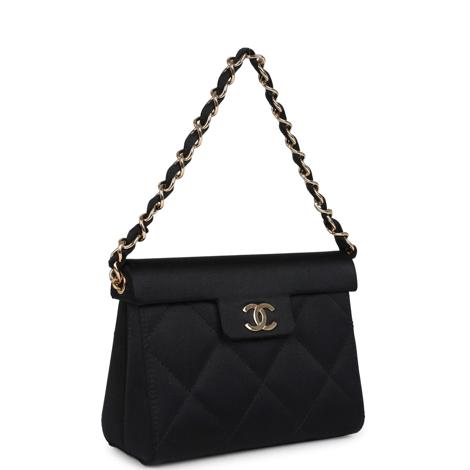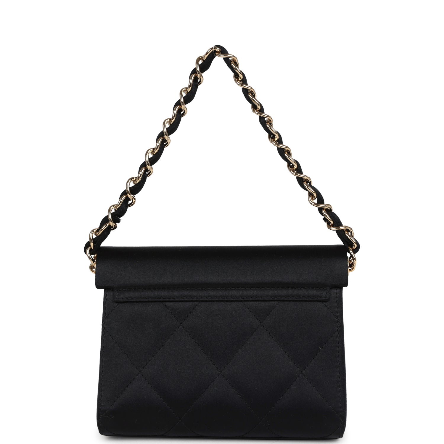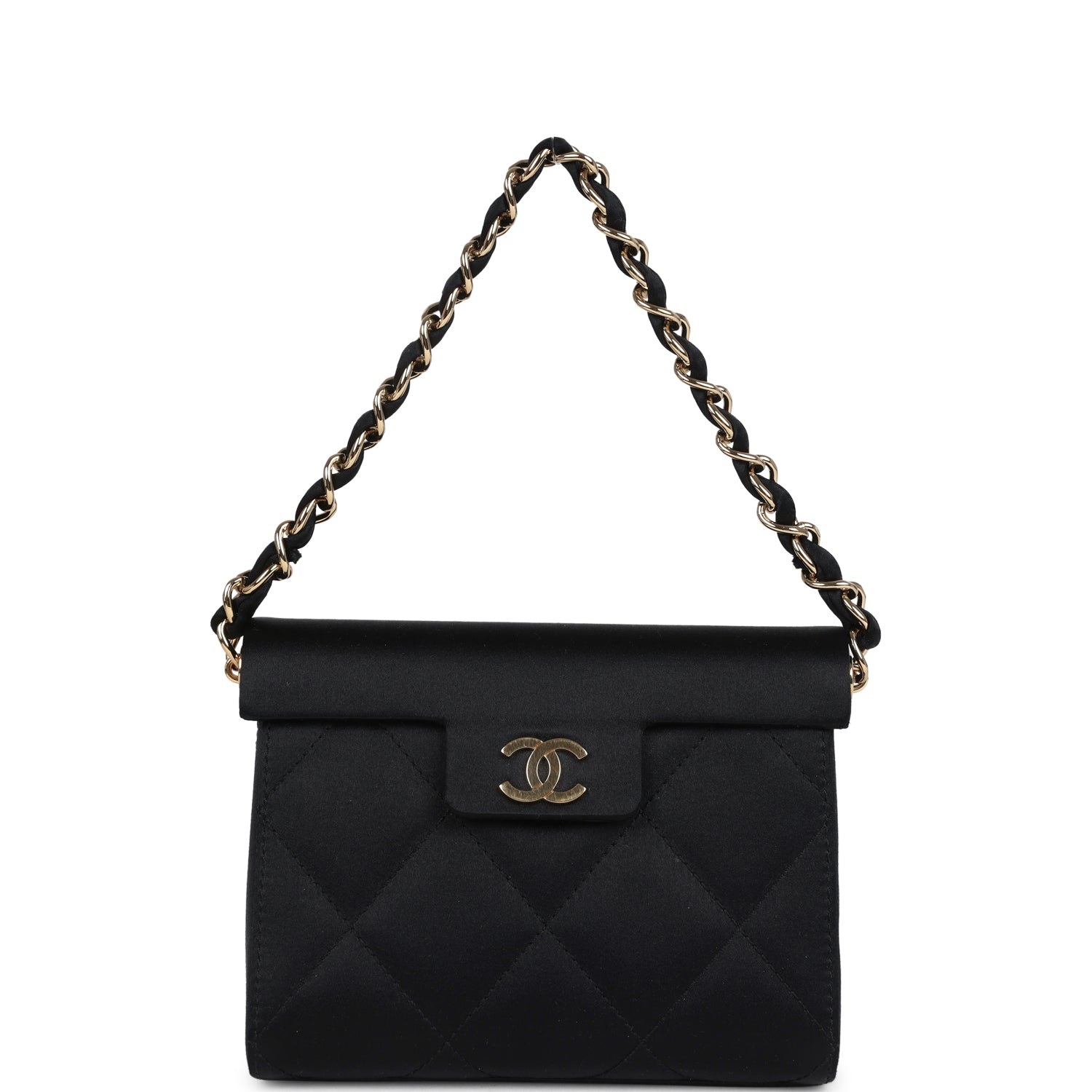 This vintage Mini Vintage Chanel Mini Evening Handbag Bag is in black satin fabric with Gold tone hardware. featuring quilted satin fabric. a hooded front flap with a magnetic cc snap closure. and a single interwoven black satin and gold tone chain link strap.