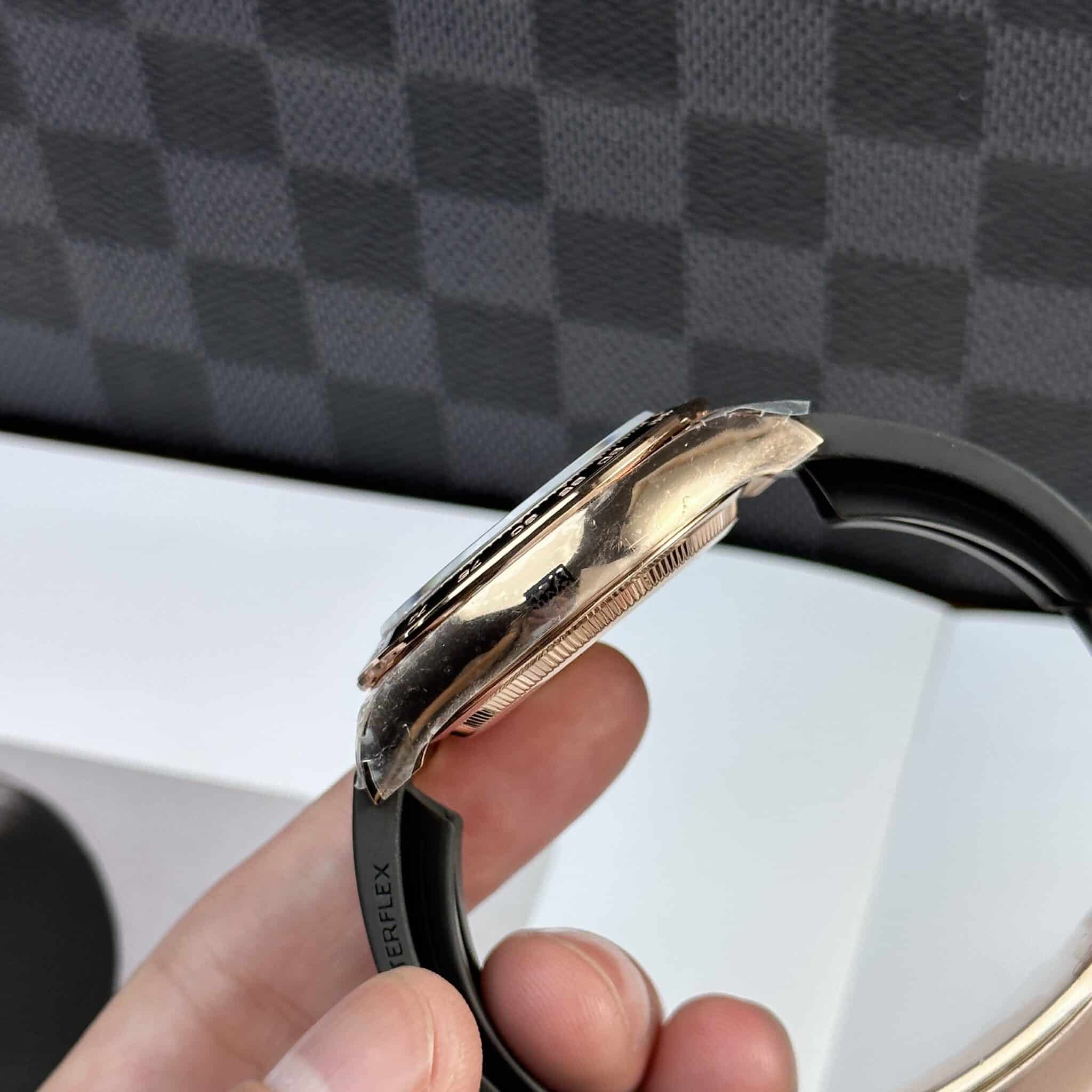 - AAA: It’s equipped with a Swiss movement and has a case thickness of 12.6mm, compared to the 12.2mm thickness of the Superclone and original.