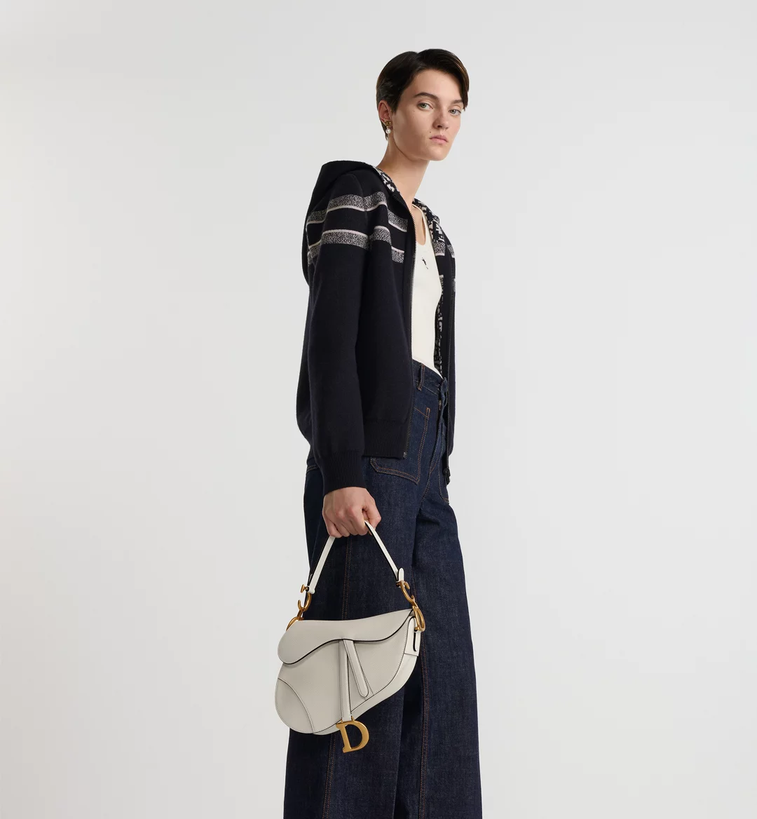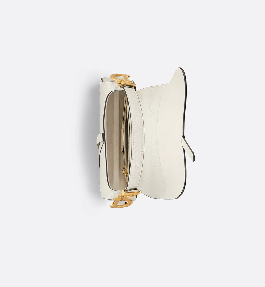 Description: This classic saddle bag highlights the ingenious design of Maria Grazia Chiuri. Made of cow leather with creamy white grain surface. the saddle flip is matched with lace decorated with stirrup D-shaped pendant and magnetic drawstring. which highlights the classic design. and the handles are decorated with metal CD logo with retro gold decoration on both sides. With adjustable and detachable thin shoulder straps. it can be carried by hand. shoulder or slung.