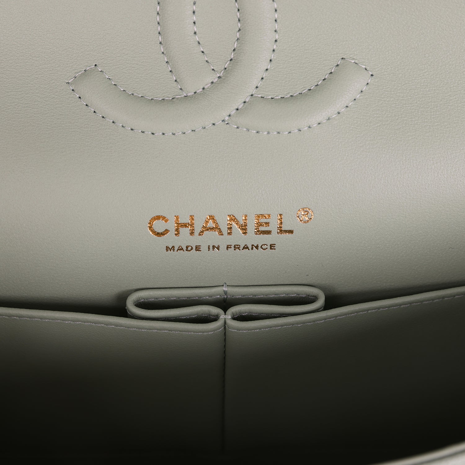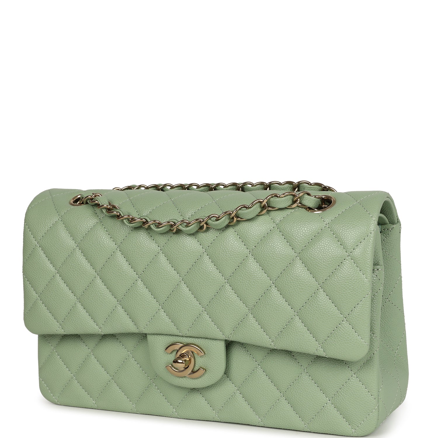 This Medium Classic Double Flap bag is in light green caviar leather with light gold tone hardware and features a front flap with signature CC turnlock closure. half moon back pocket. and adjustable interwoven light gold tone chain link and light green leather shoulder strap.