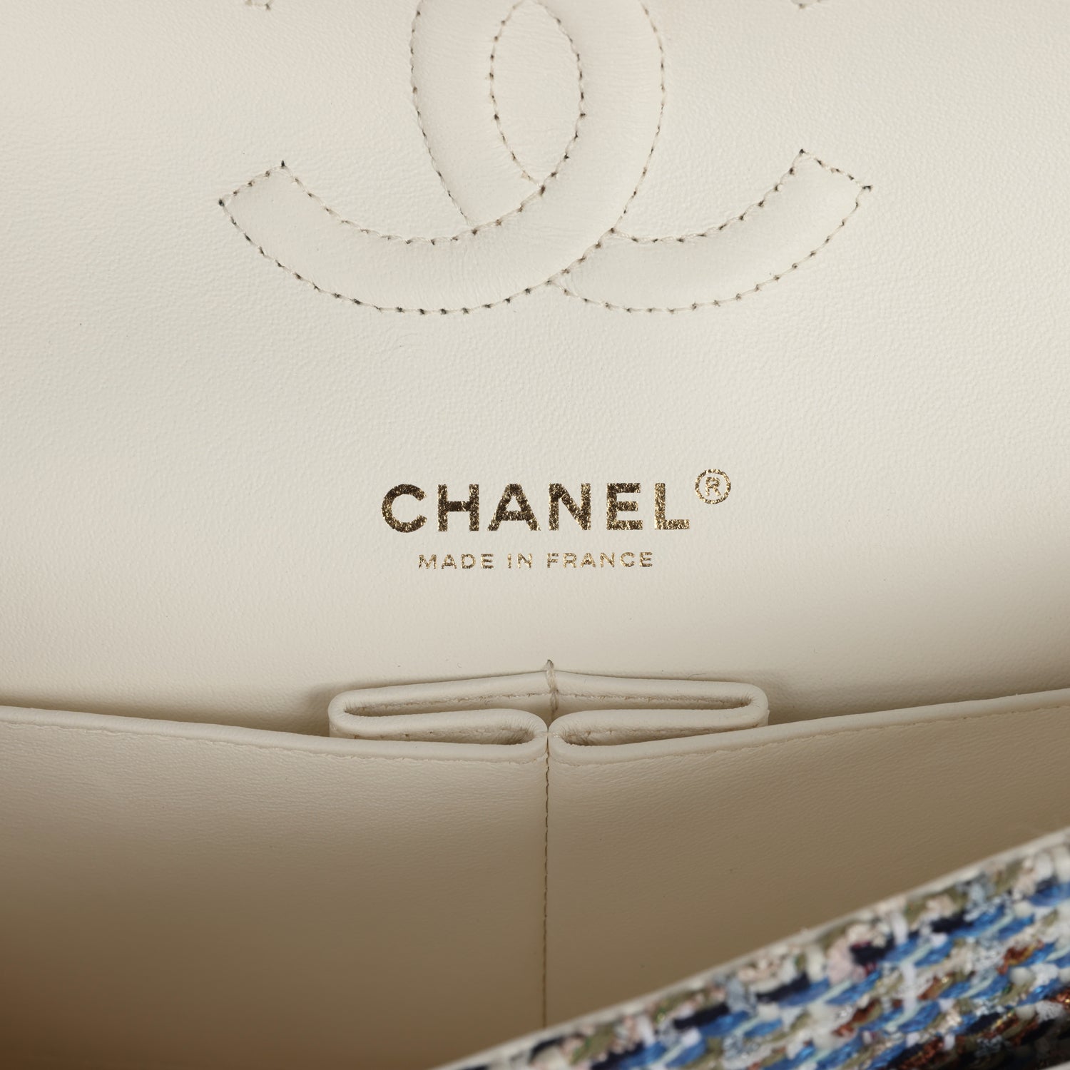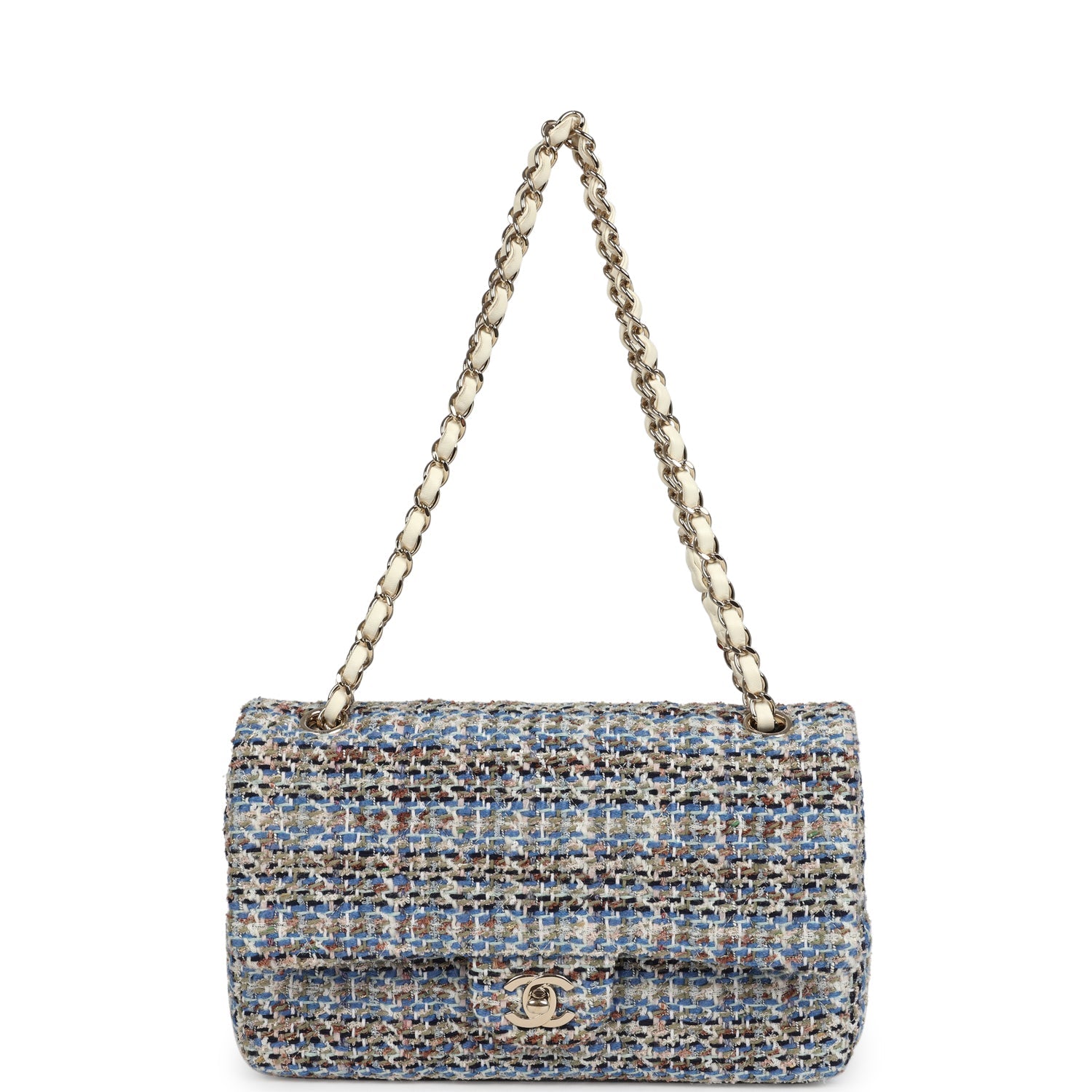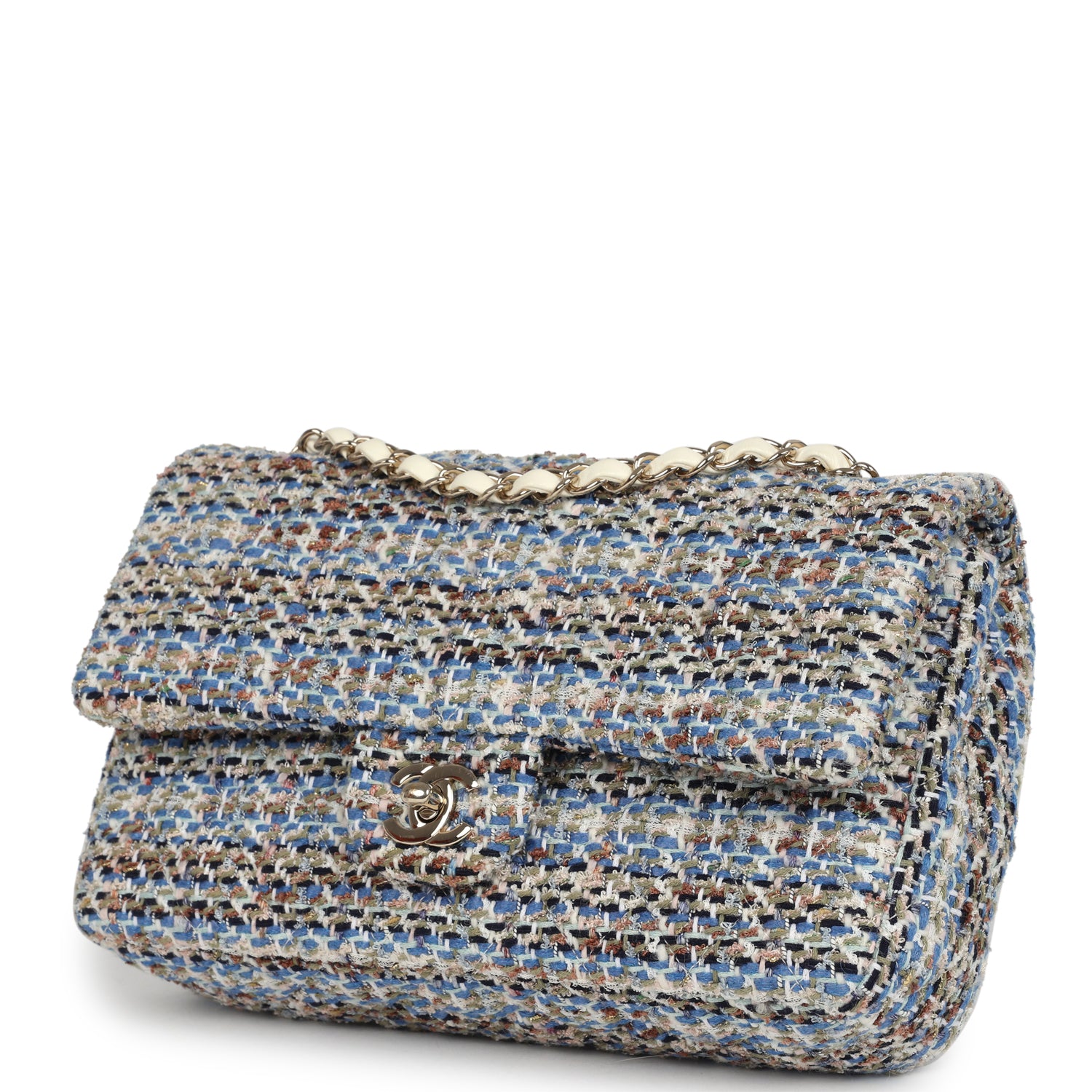 This Medium Classic Double Flap bag is in white. blue. and multicolored tweed boucle fabric with light gold tone hardware and features a front flap with signature CC turnlock closure. half moon back pocket. and adjustable interwoven light gold tone chain link and white leather shoulder strap.