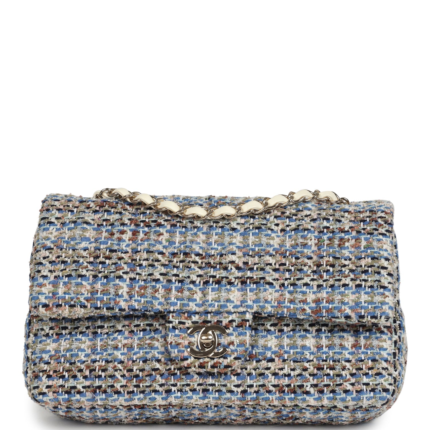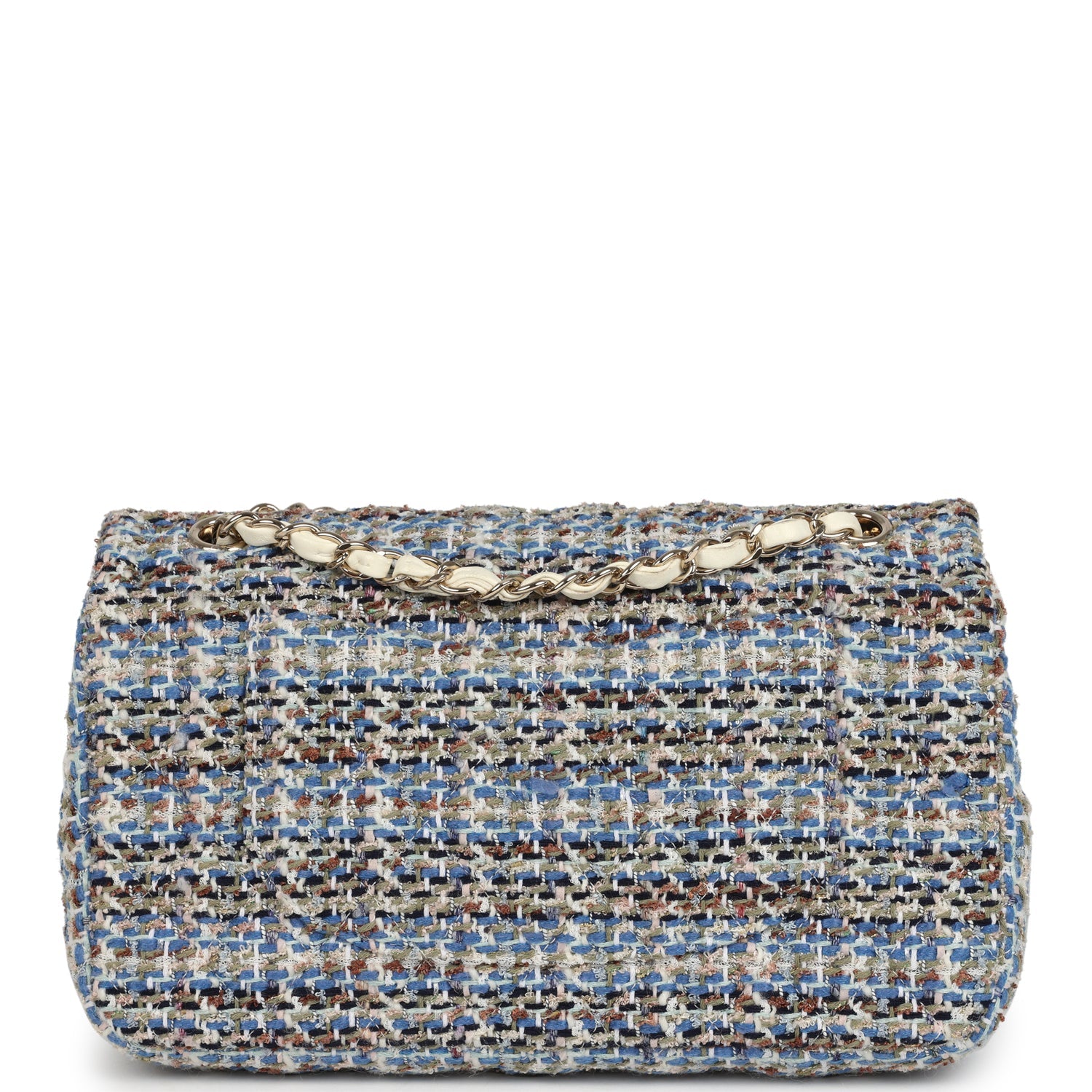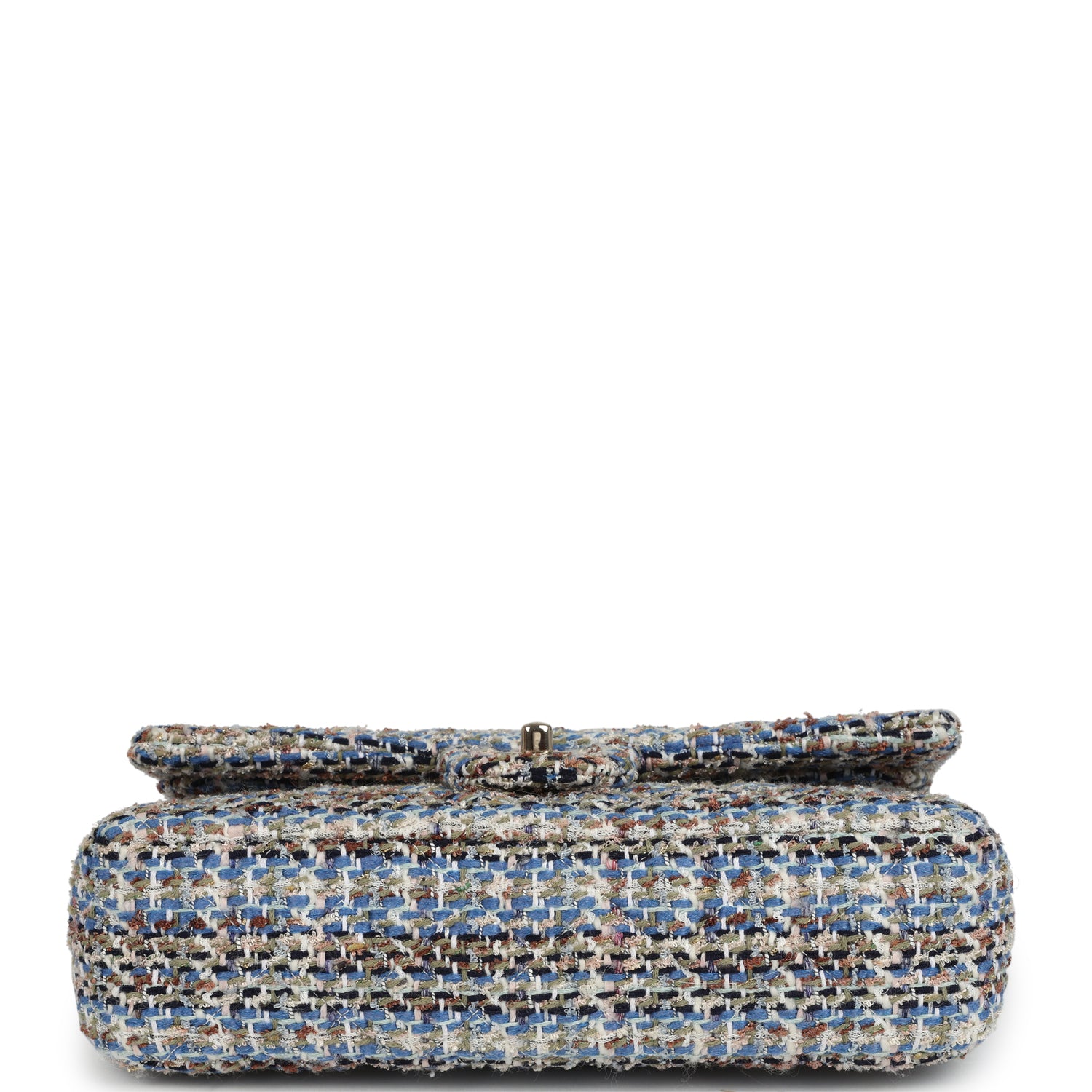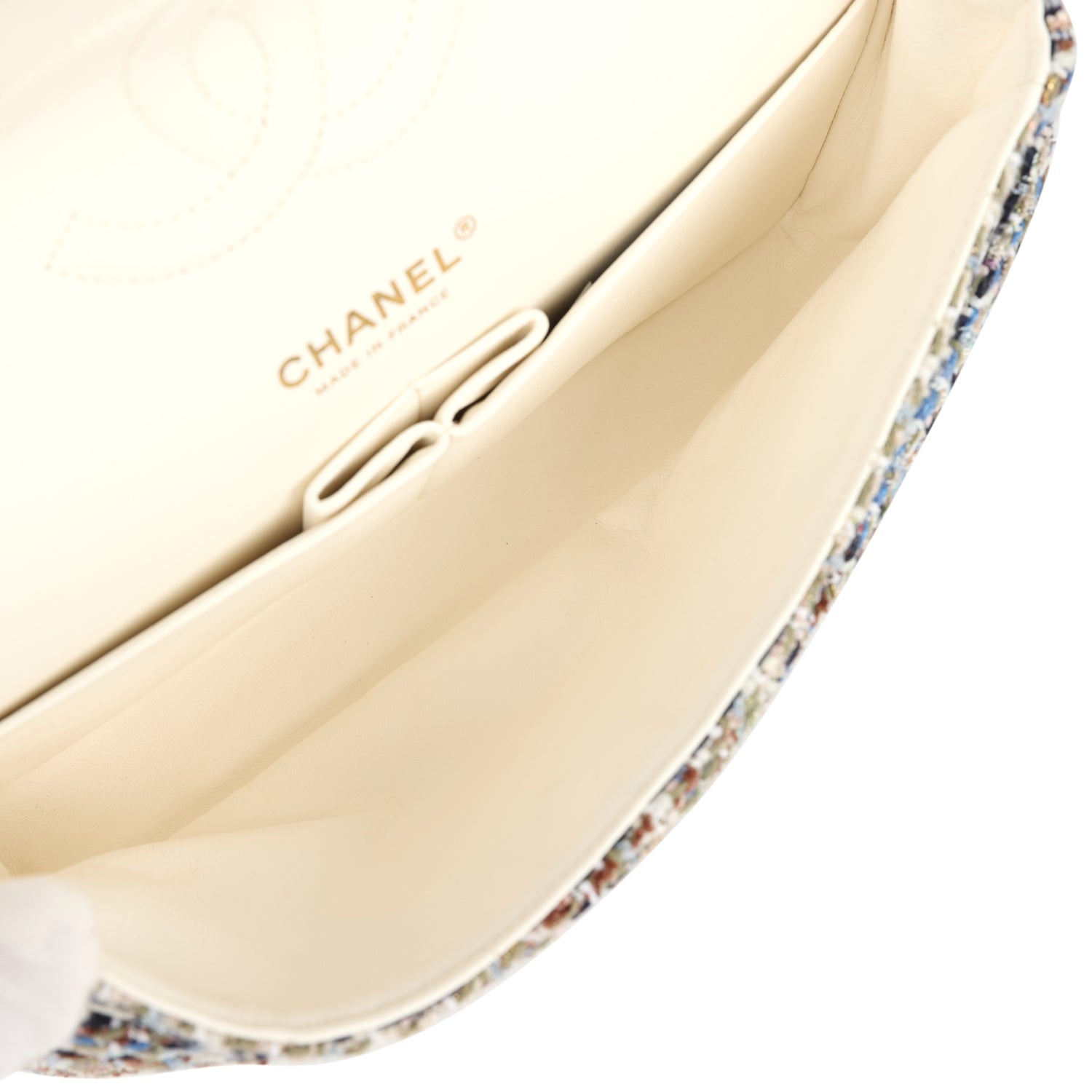 This Medium Classic Double Flap bag is in white. blue. and multicolored tweed boucle fabric with light gold tone hardware and features a front flap with signature CC turnlock closure. half moon back pocket. and adjustable interwoven light gold tone chain link and white leather shoulder strap.