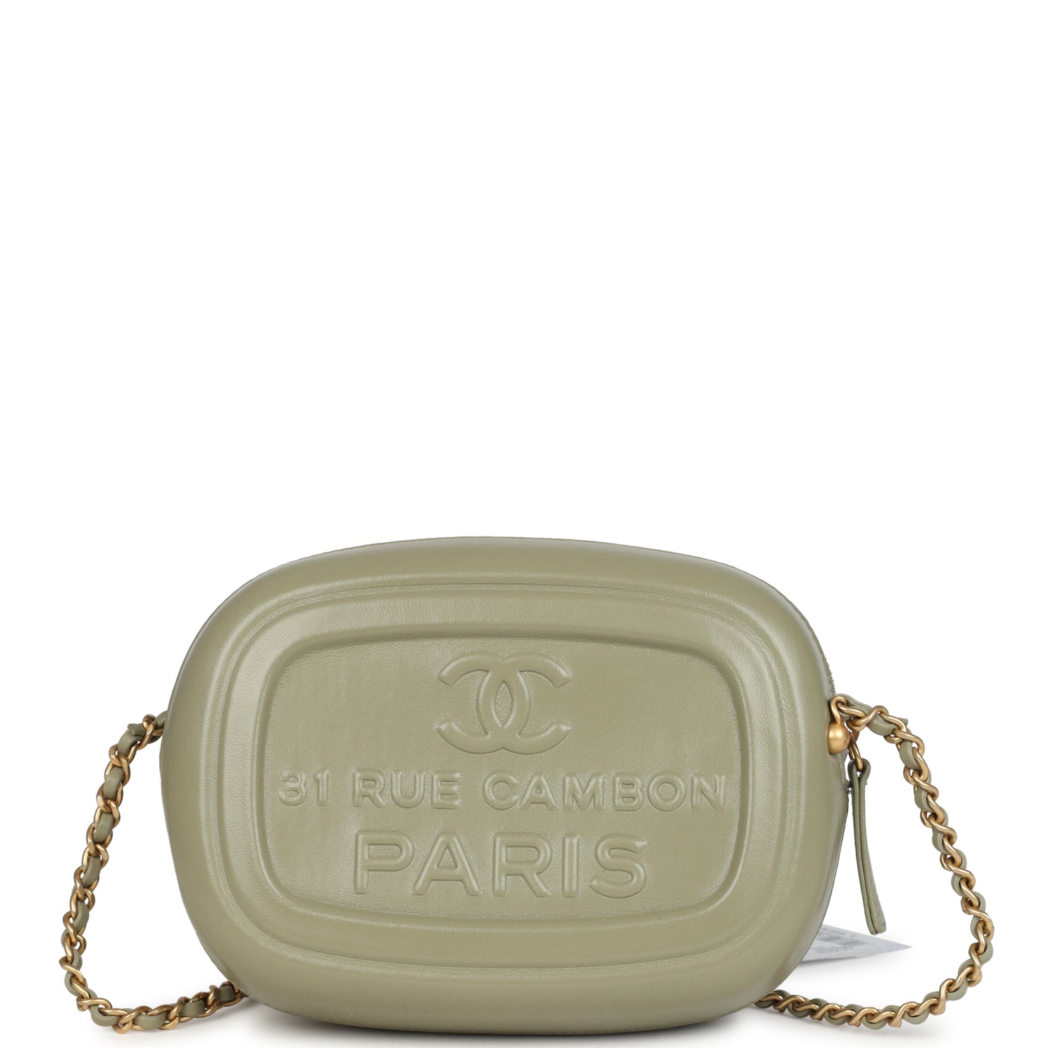 This Cruise Collection 2025 Mini "Savon De Marseille" Camera Case Bag is in khaki shiny lambskin leather with brushed gold tone hardware featuring. "31 Rue Cambon Paris" logo embossed on the front and back of bag. smooth shiny leather. a zipper closure. and an adjustable interwoven brushed gold tone metal chain link and khaki leather crossbody/shoulder strap with stopper. This "bar soap" shape bag is a nod to the South of France.