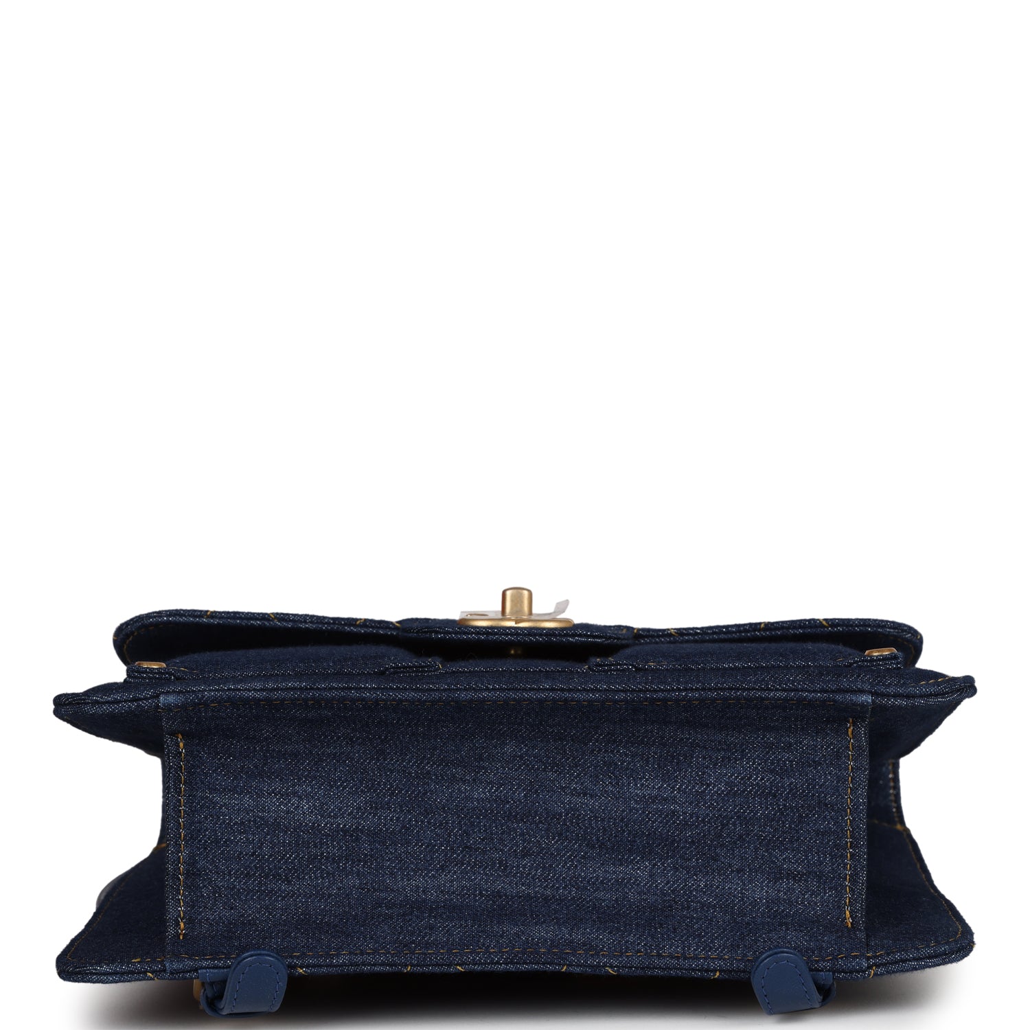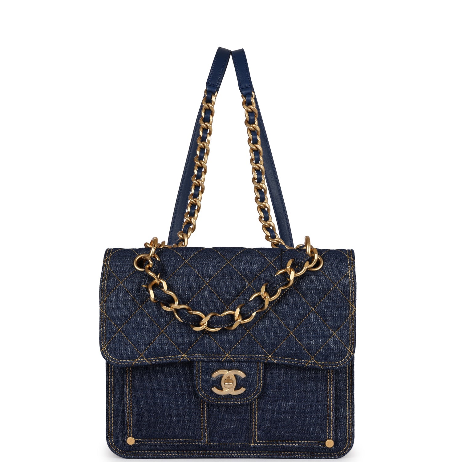 This Square Flap Backpack is in blue denim with antique gold tone hardware. a classic CC turnlock closure. a front slip pocket. a rear half moon pocket. an interwoven denim and chain top handle. and matching shoulder straps.
